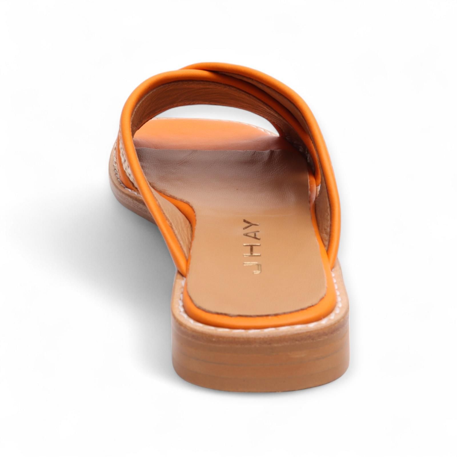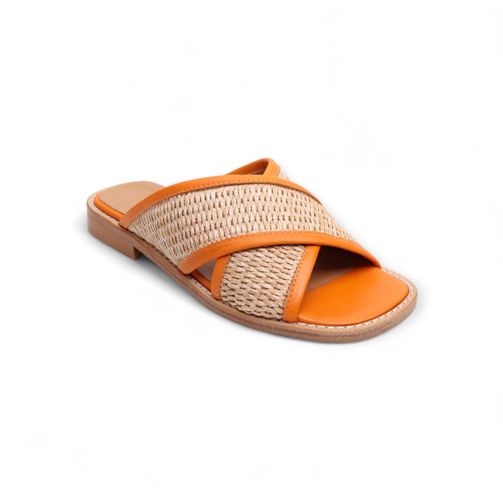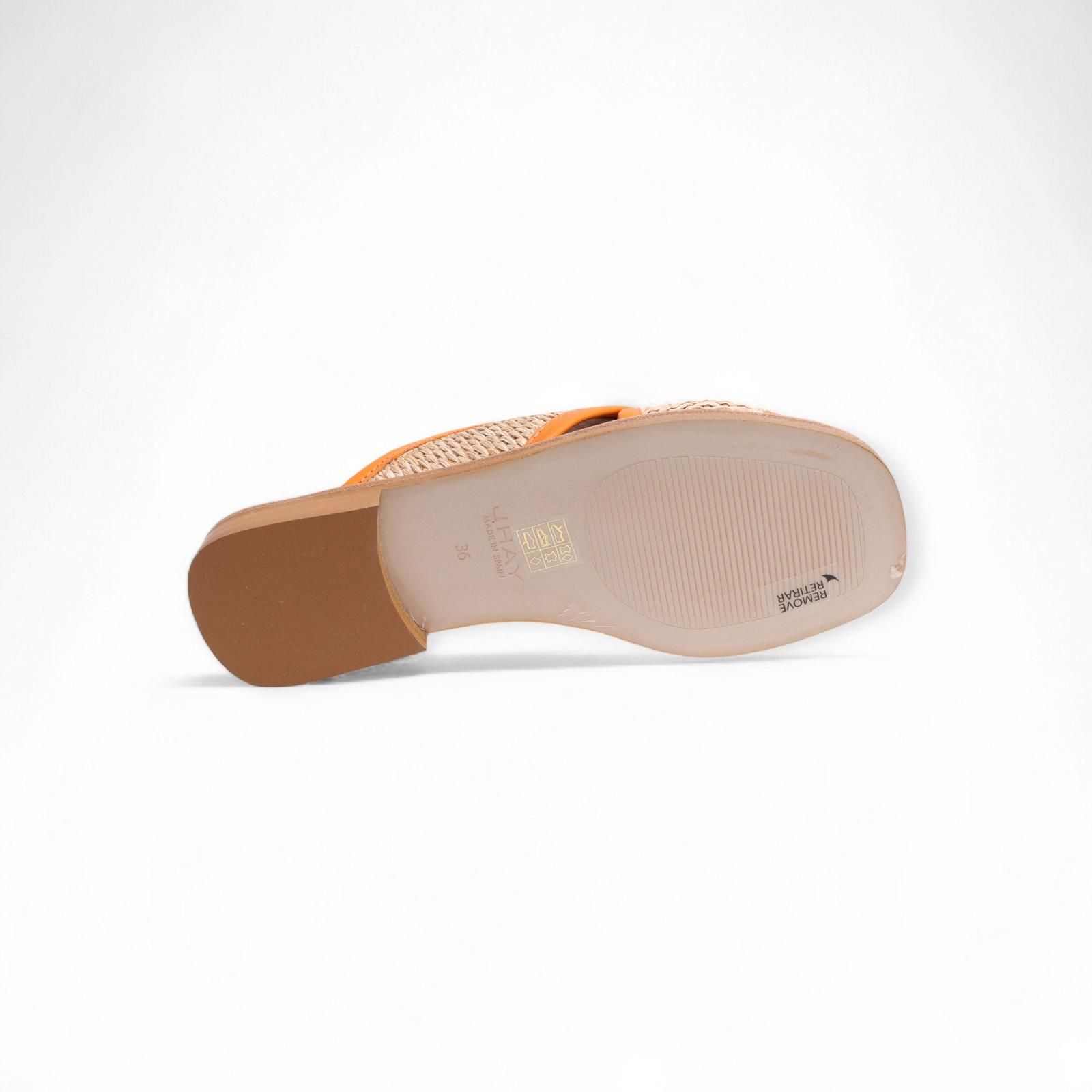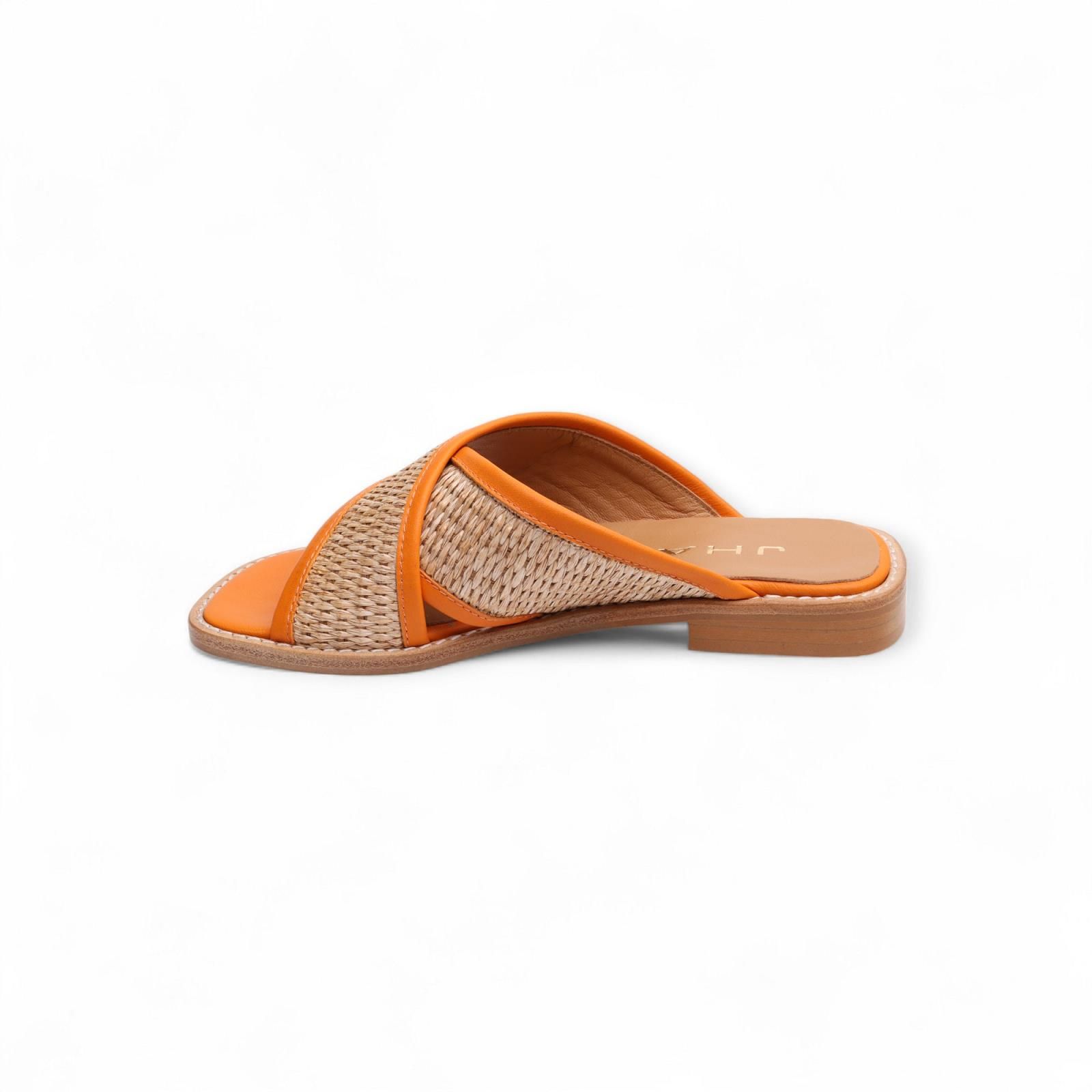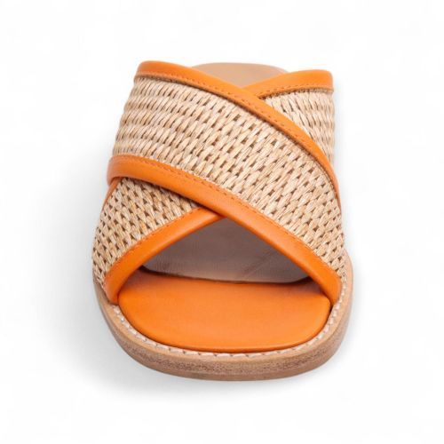 Slipper van Jhay voor dames. Dit elegant muiltje is met een gekruiste band over de wreef in oranje leder met naturel raffia. Heeft een carré top en een leder buitenzool.