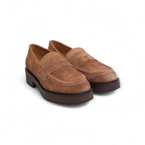 Mocassin van Jhay in off wit lakleder. Heeft een band over de wreef en afgewerkt met stekkingen. Is op een blokhakje van 5-5.5cm hoog.