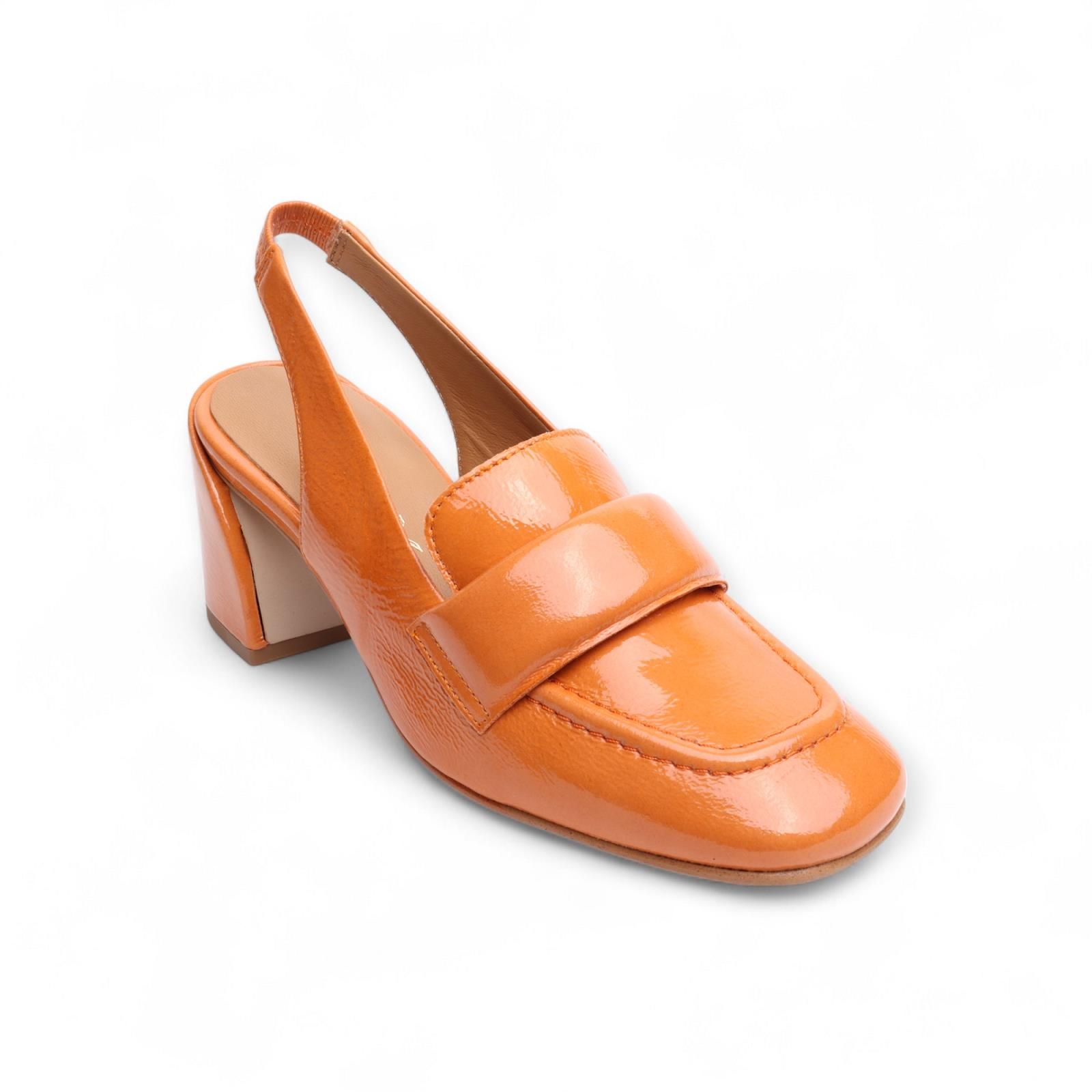 Mocassin van Jhay voor dames. Dit slingback model is in oranje lakleder. Heeft een gesloten voorvoet en een open hieltje die afgesloten is met een rekker. Is op een blokhakje van 5-5.5cm hoog.