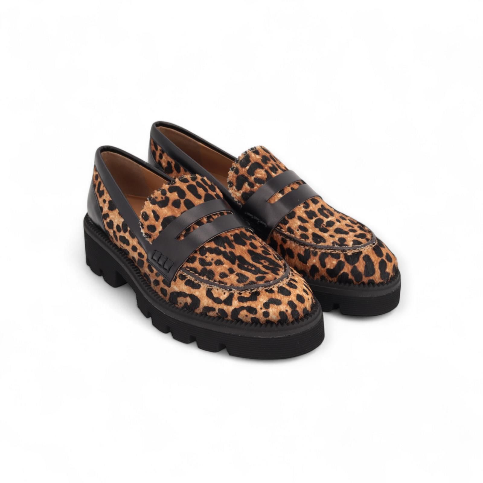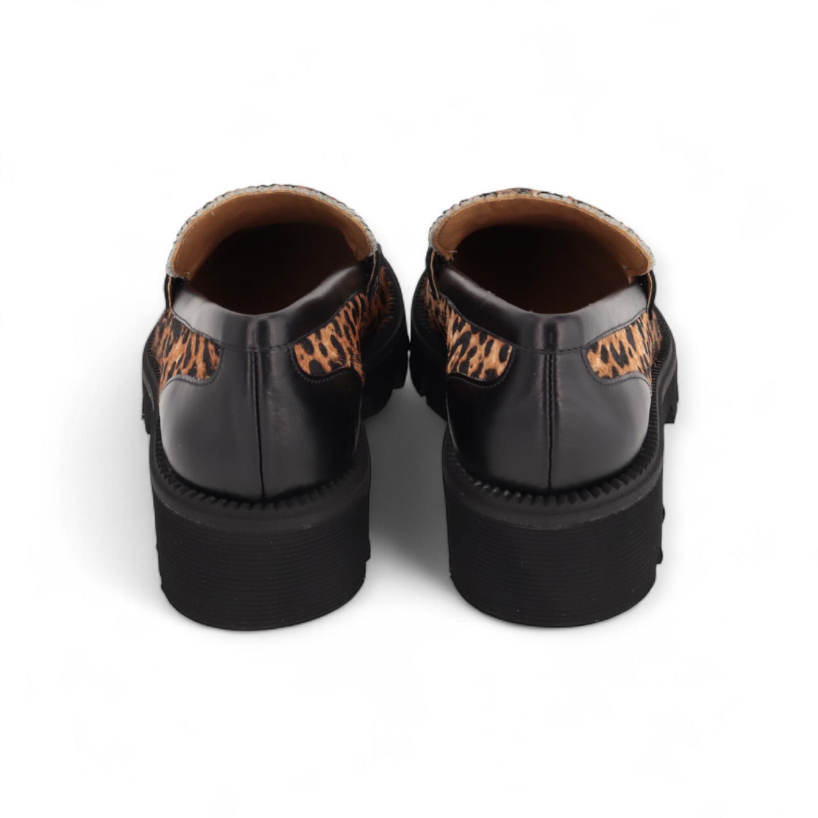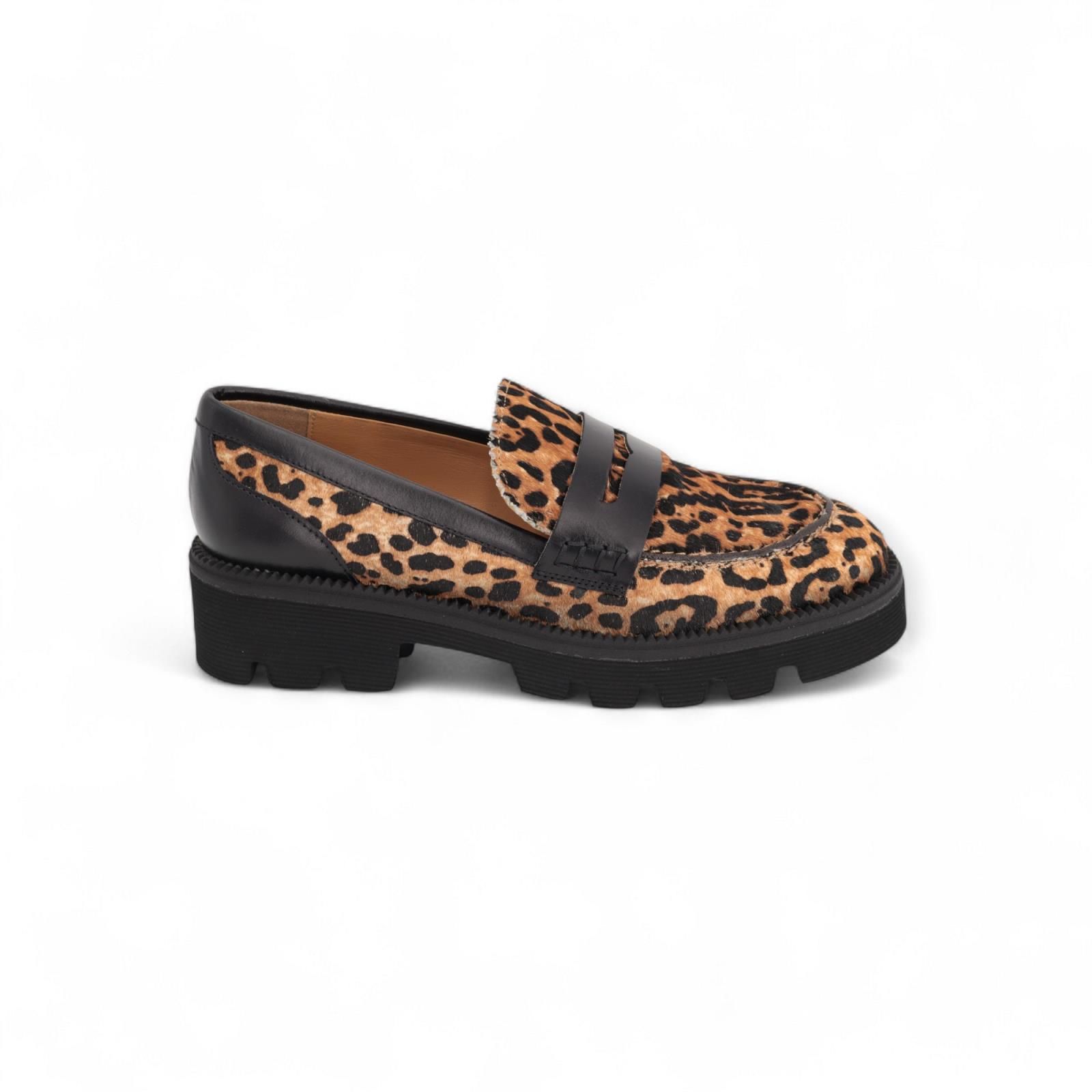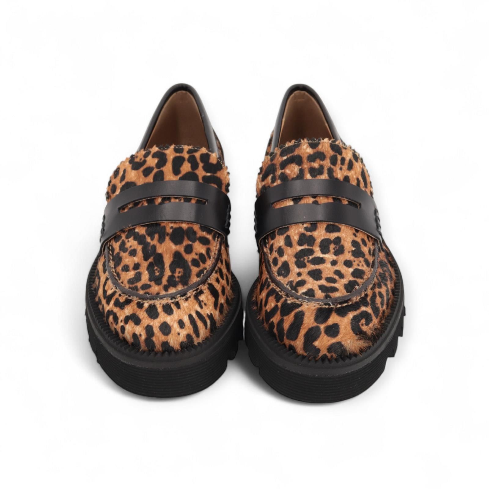 Mocassin 9071 van JHAY voor dames. Deze mocassin is in leopard, afgewerkt met zwarte stekking en band over de wreef. Is op een dikke antislipzool.