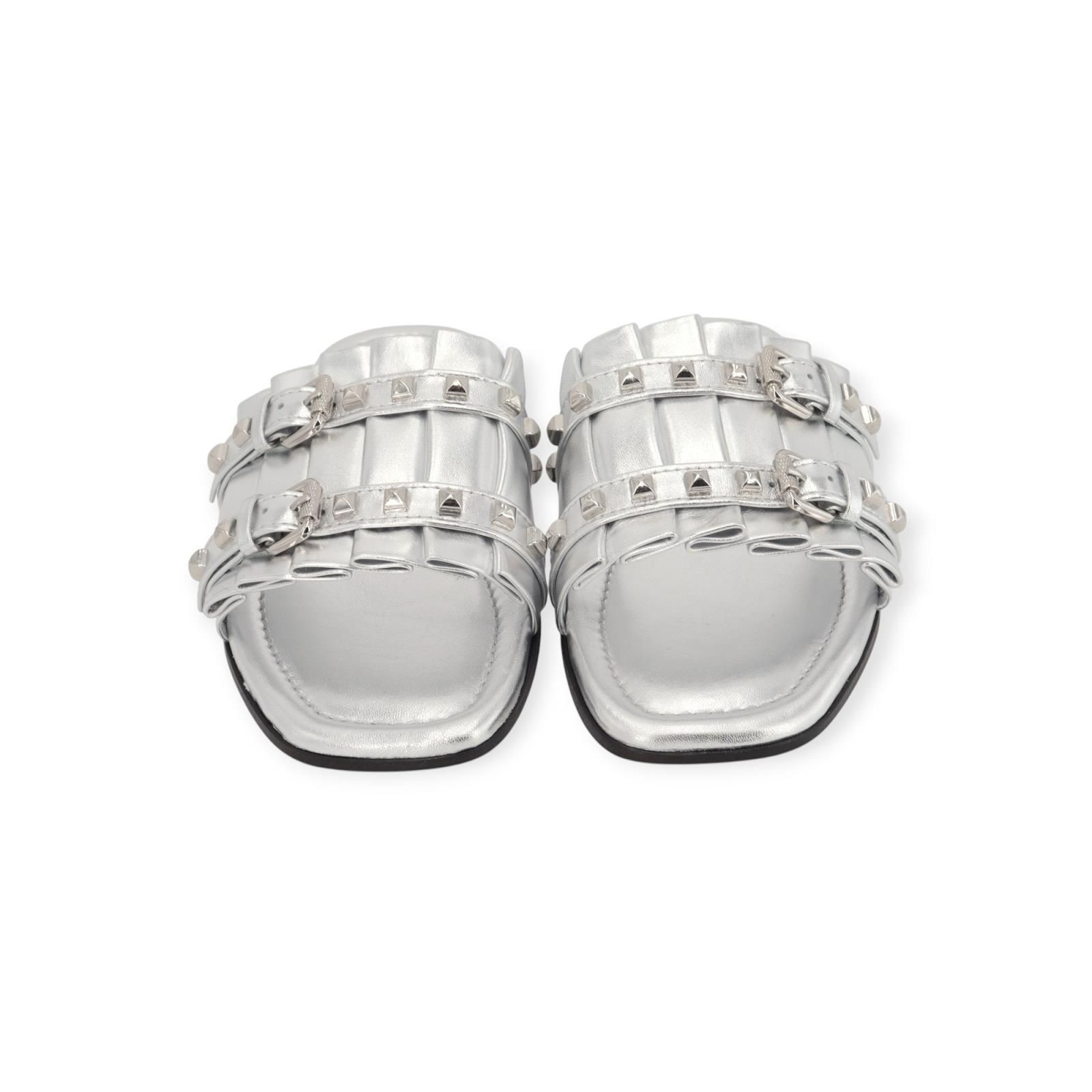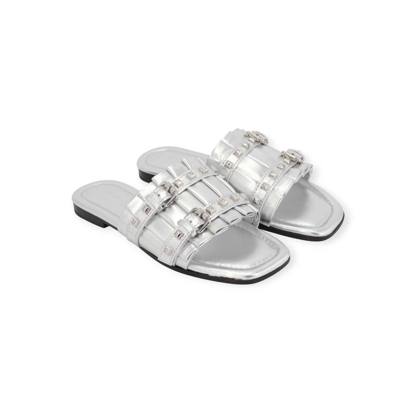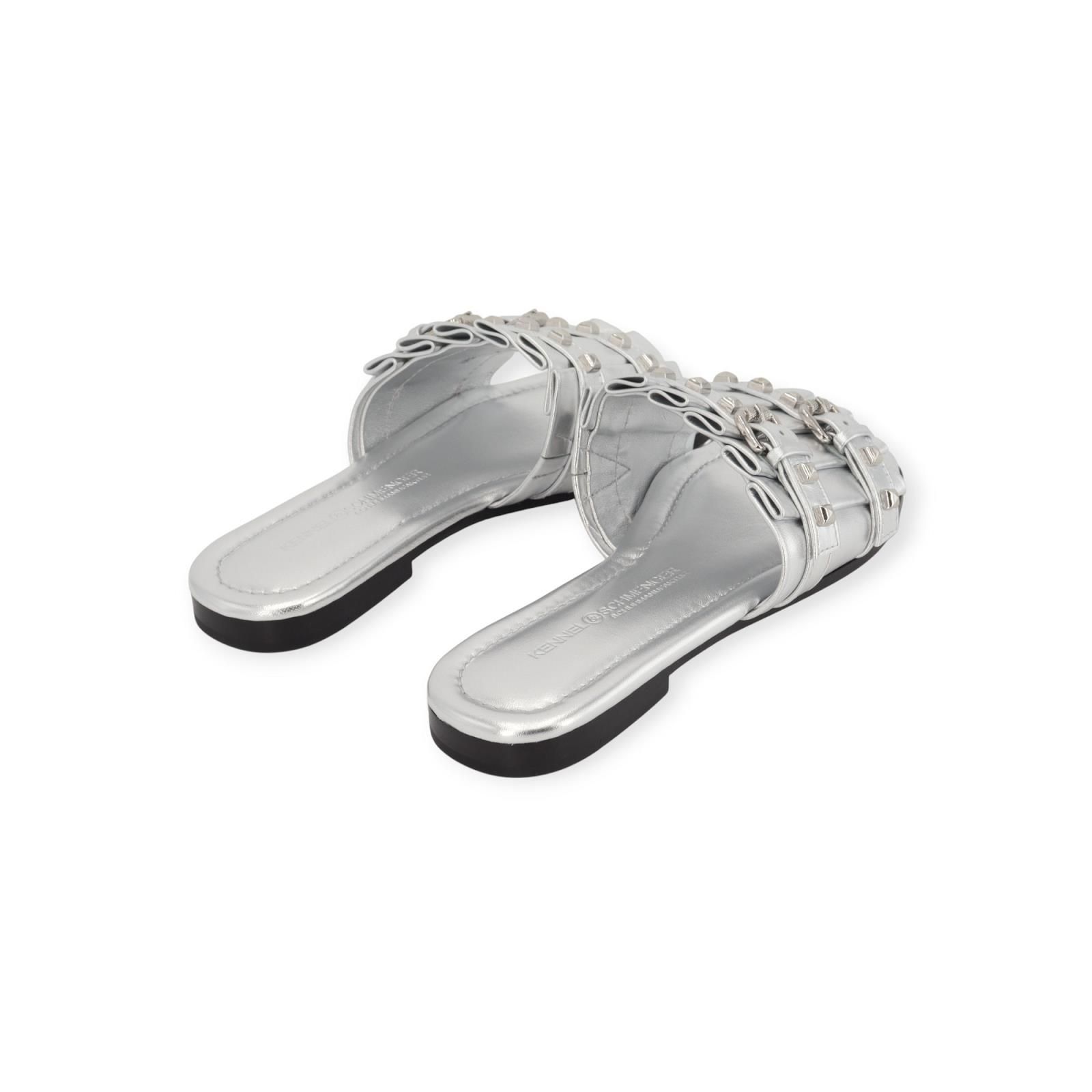 Slipper – Muil Holly van Kennel & Schmenger voor dames. Dit elegant muiltje is in zilver shining leer. Heeft een carré neus met een brede band over de wreef. De band is omrand met 2 fijne bandjes afgewerkt met studs en zilver gespsluiting. Heeft een zwart antislipzooltje.