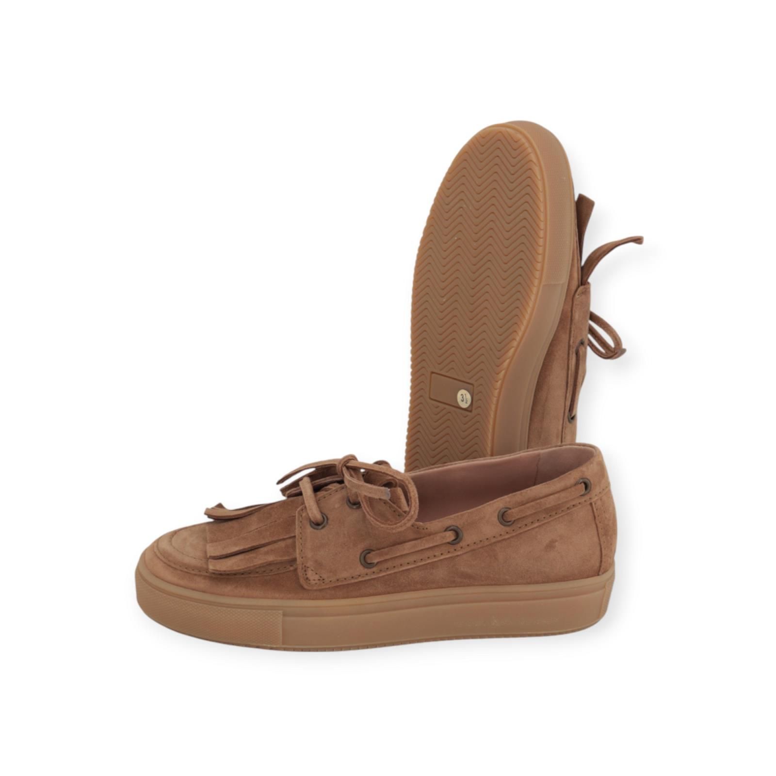 Mocassin Leni van Kennel & Schmenger voor dames. Deze mocassin is volledig in cognac suede met een flap en stiksels op de neus. Dit model is een typische bootschoen en is de nieuwe zomertrend. Heeft veters die doorlopen langs de zijkant die typeren aan die stijl. Is op een aangename sneakerzool met een uitneembare binnenzool. Deze schoen combineert een klassieke uitstraling met een trendy twist.