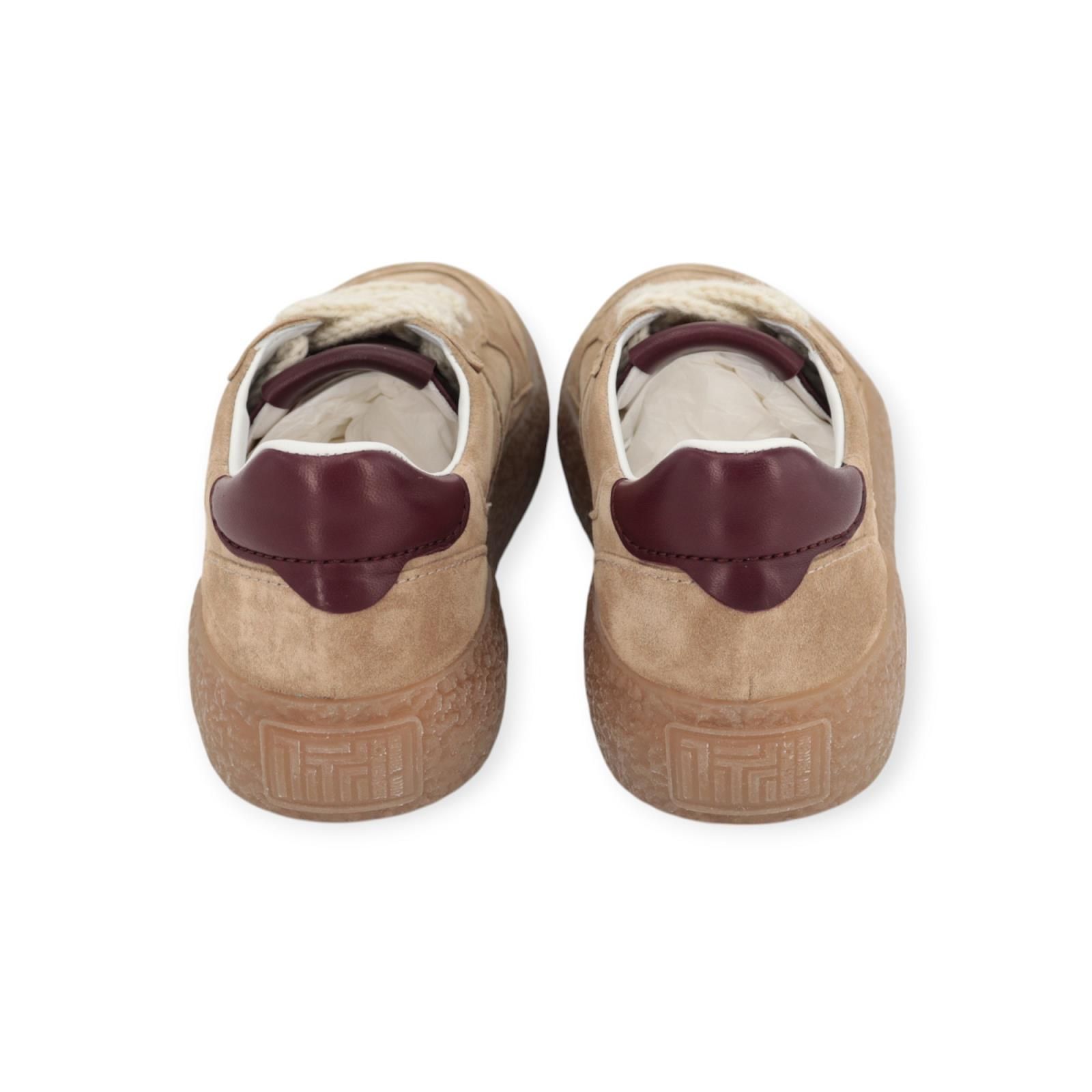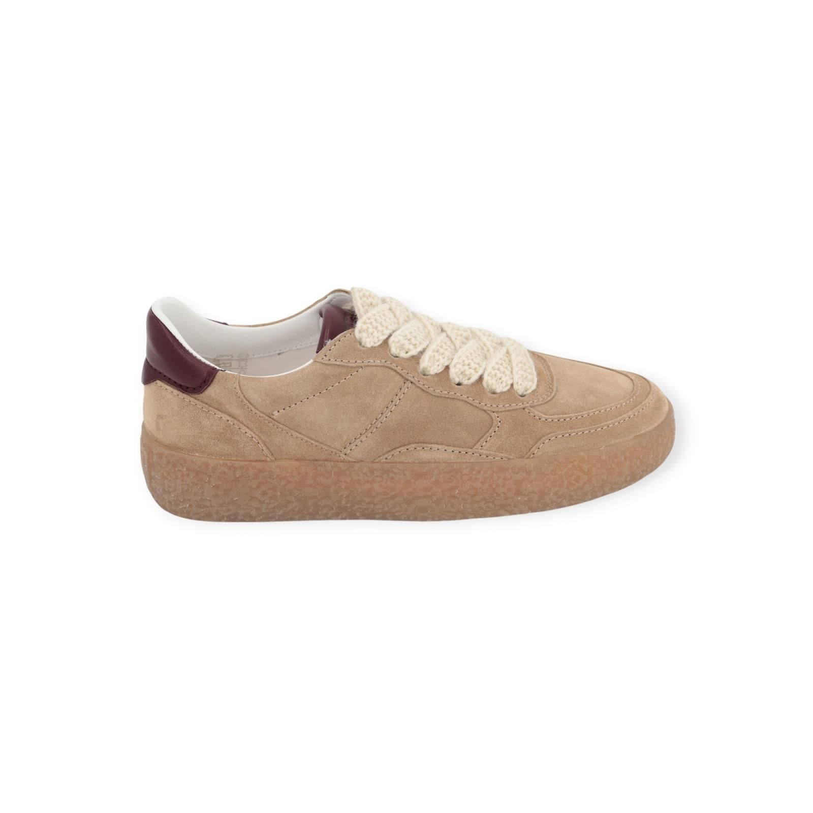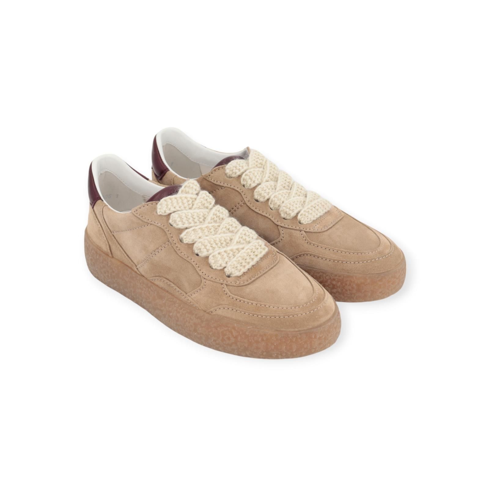 Sneaker PIT van Kennel & Schmenger voor dames. Deze sneaker is in zand suède kleur en combineert perfect met de bijpassende gummy crepe zool. De bordeaux leren details aan de veters en hielflap zorgen voor een elegante eye catcher. De binnenzool is uitneembaar. Is mooi afgewerkt met off wit gehaakte veters, en er zit nog een extra paar beige veters bij.