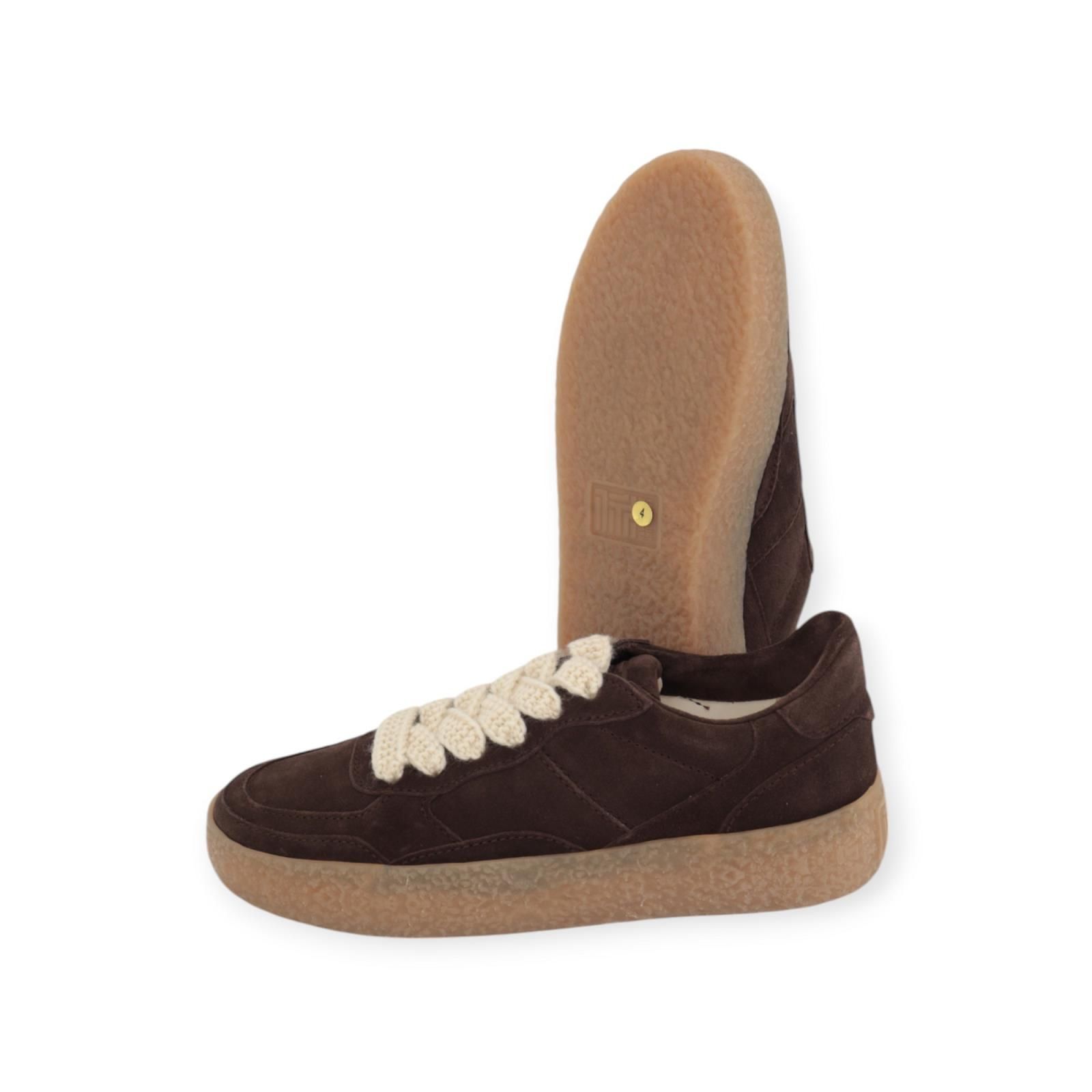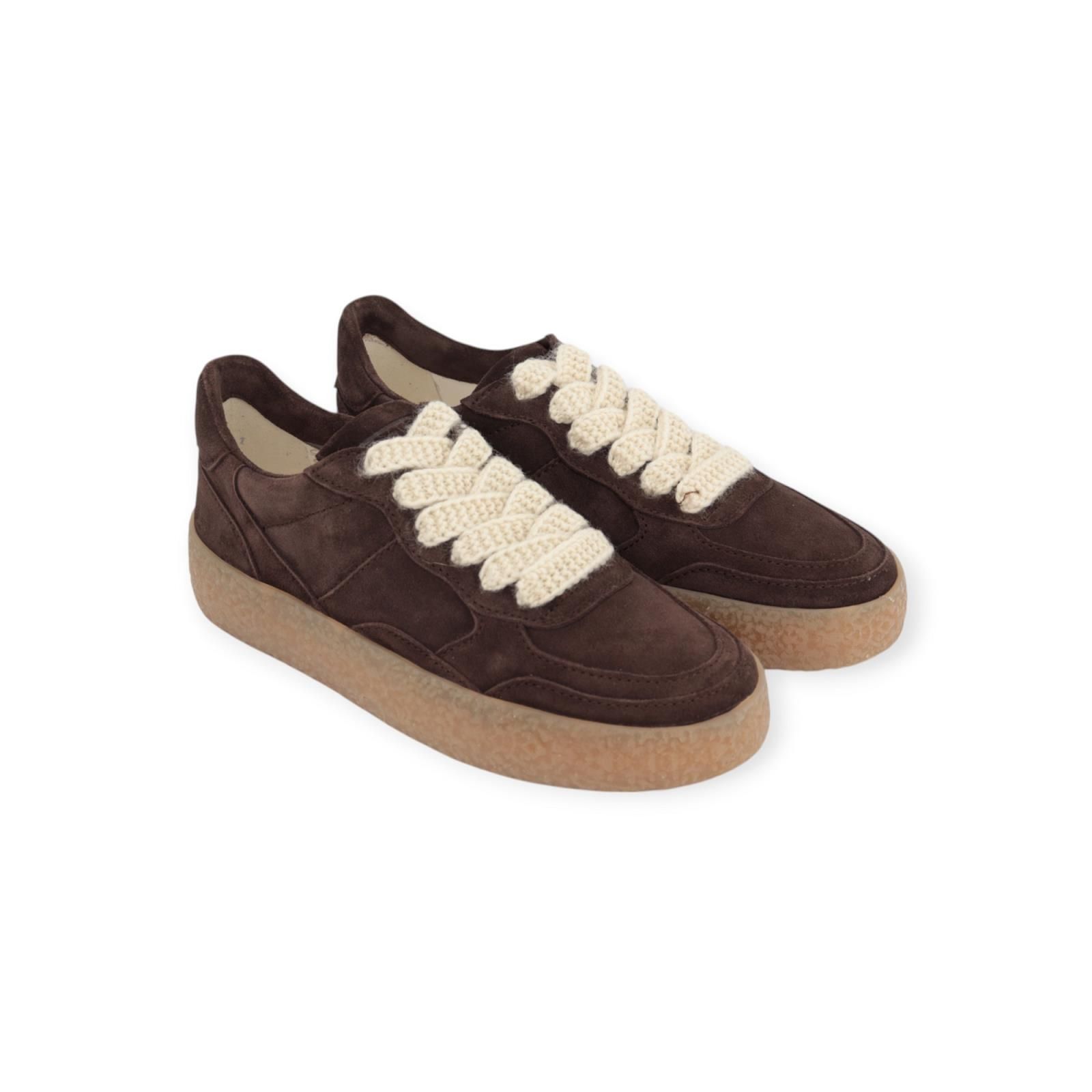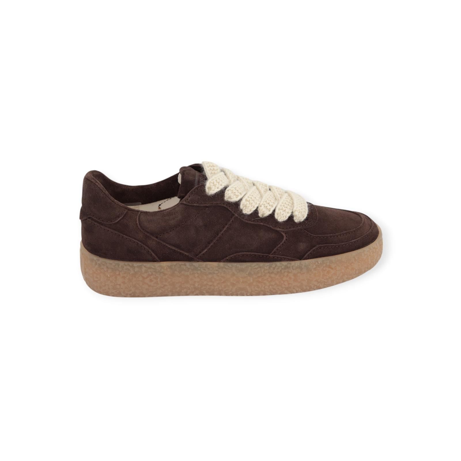 Sneaker PIT van Kennel & Schmenger voor dames. Deze sneaker is in bruin suède kleur en combineert perfect met de bijpassende gummy crepe zool. De binnenzool is uitneembaar. Is mooi afgewerkt met off wit gehaakte veters, en er zit nog een extra paar bruine veters bij.