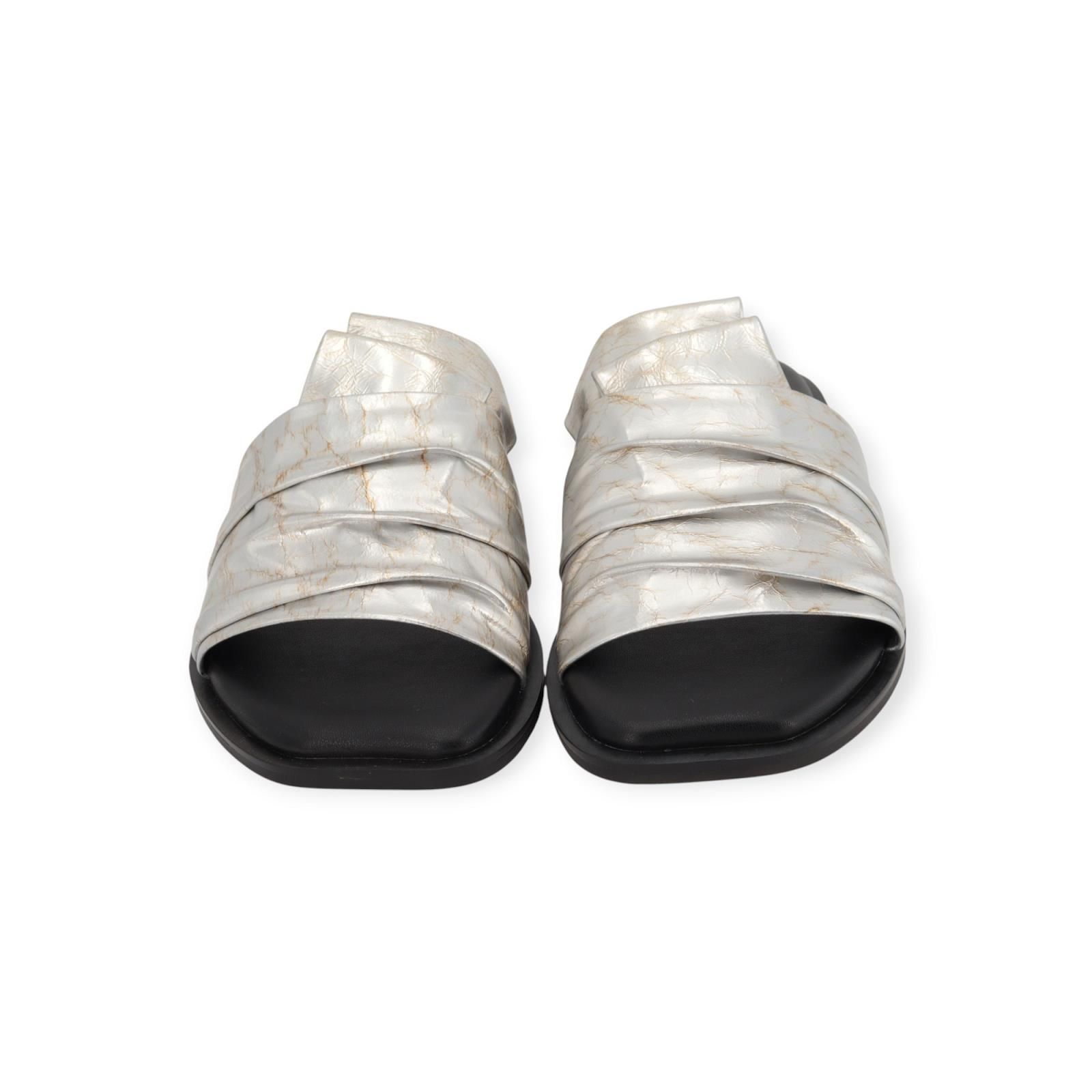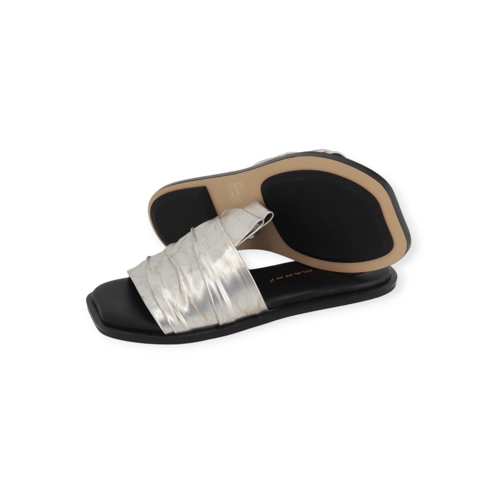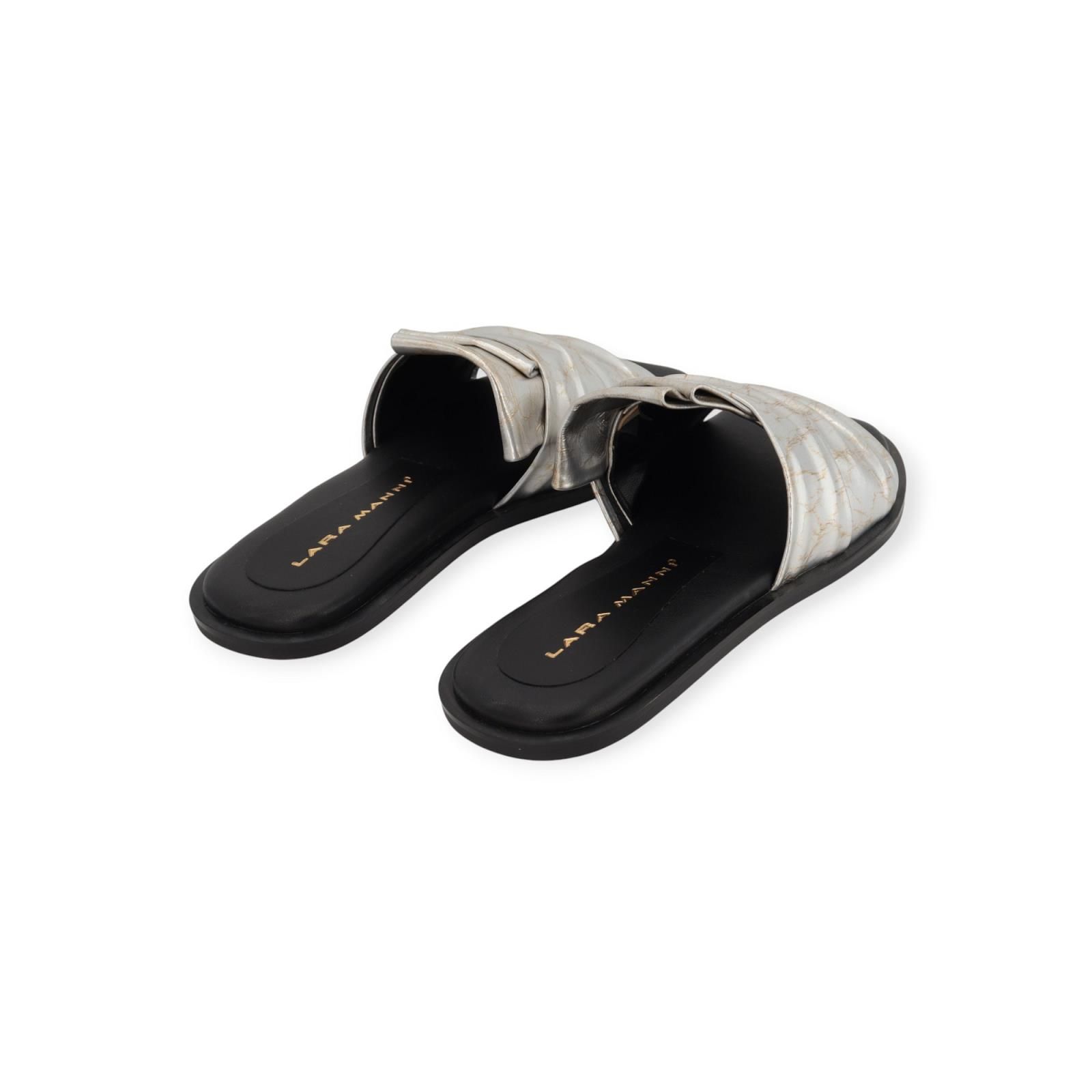 Slipper 3000 van Lara Manni voor dames. Deze muil is in zwart leer met een zilver met platino details gedrapeerde brede band over de wreef. Heeft een carré top met een antislipzool.
