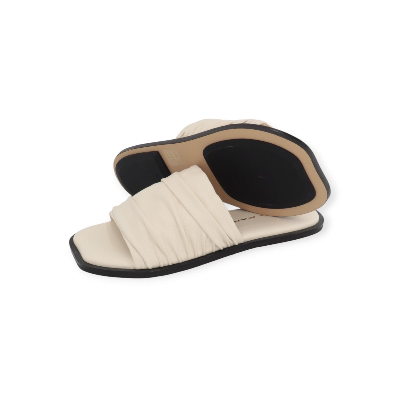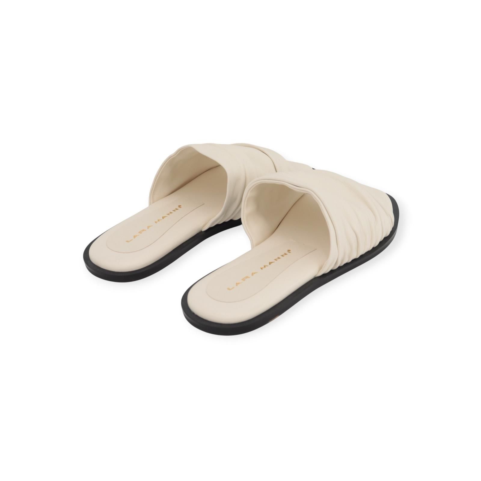 Slipper 3050 van Lara Manni voor dames. Deze muil heeft een brede gedrapeerde band over de wreef in offwit leer. Heeft een carré top met een donkere antislipzool.