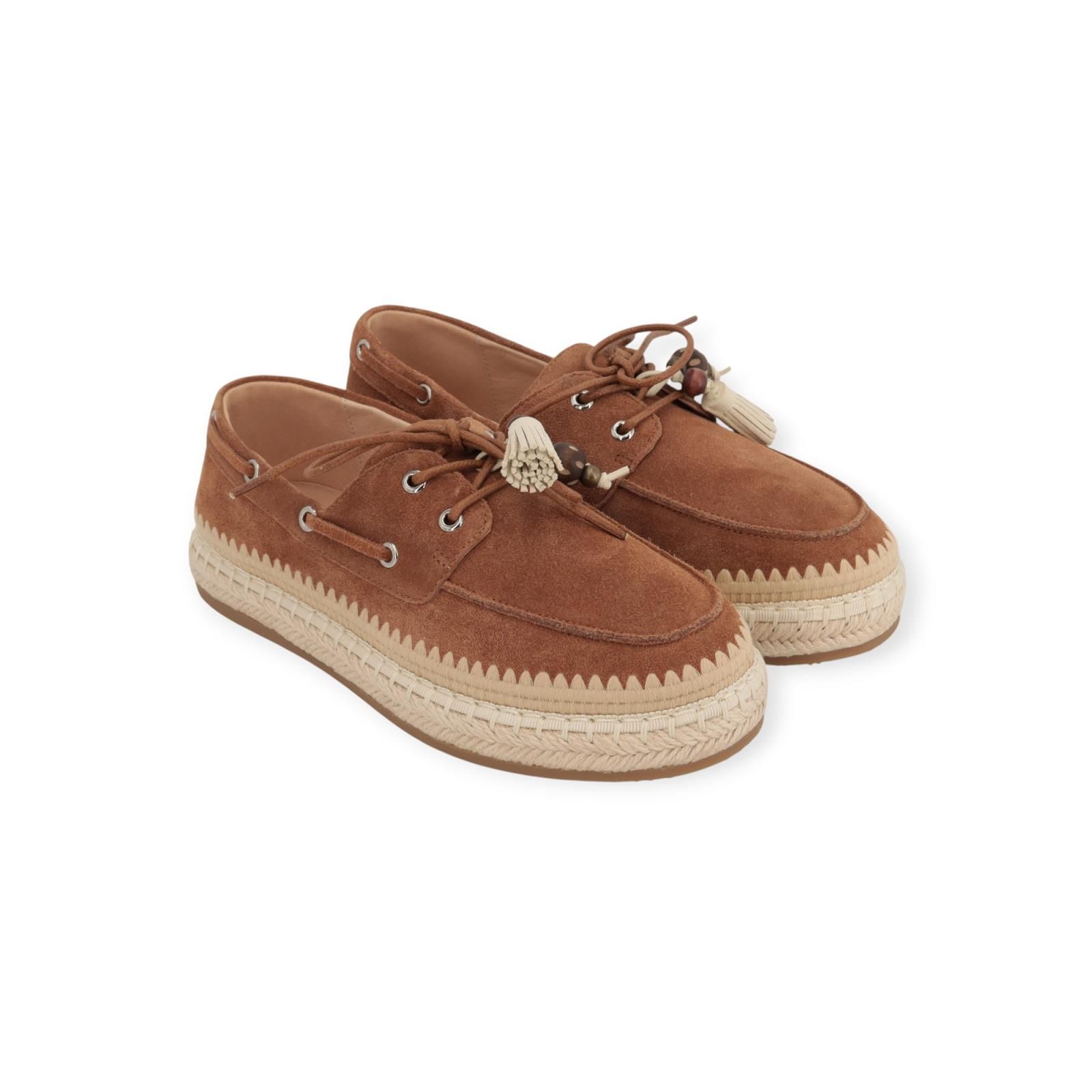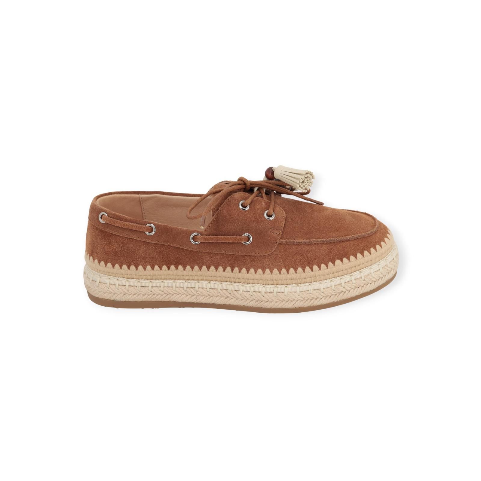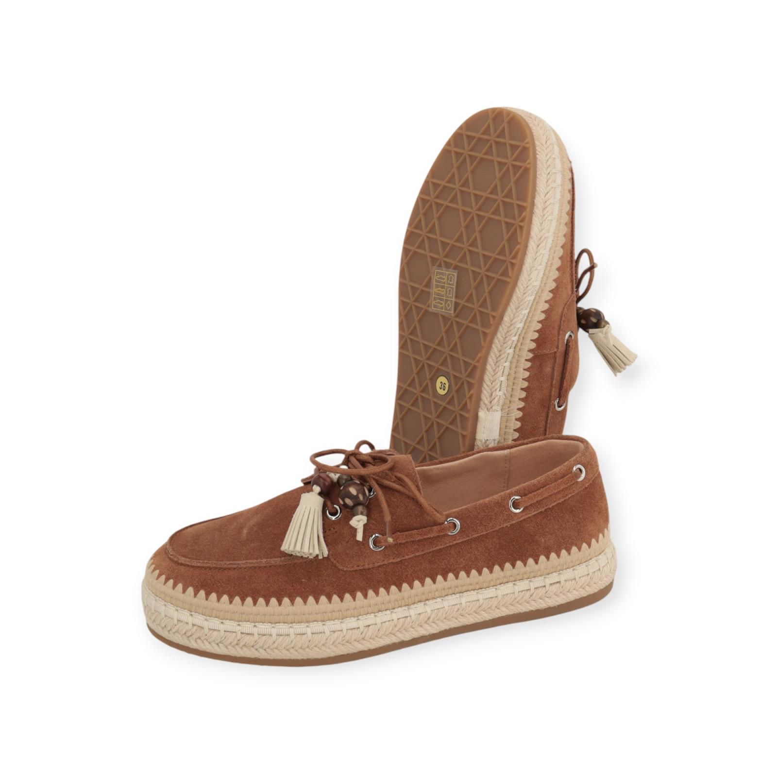 Espadrille 3251 van Lara Manni voor dames. Deze zomerse veterschoen is in cognac suède. Is met veters aan de zijkant en vooraan die mooi afgewerkt zijn met kraaltjes en kwastjes. Heeft een brede espadrille band met antislipzool.