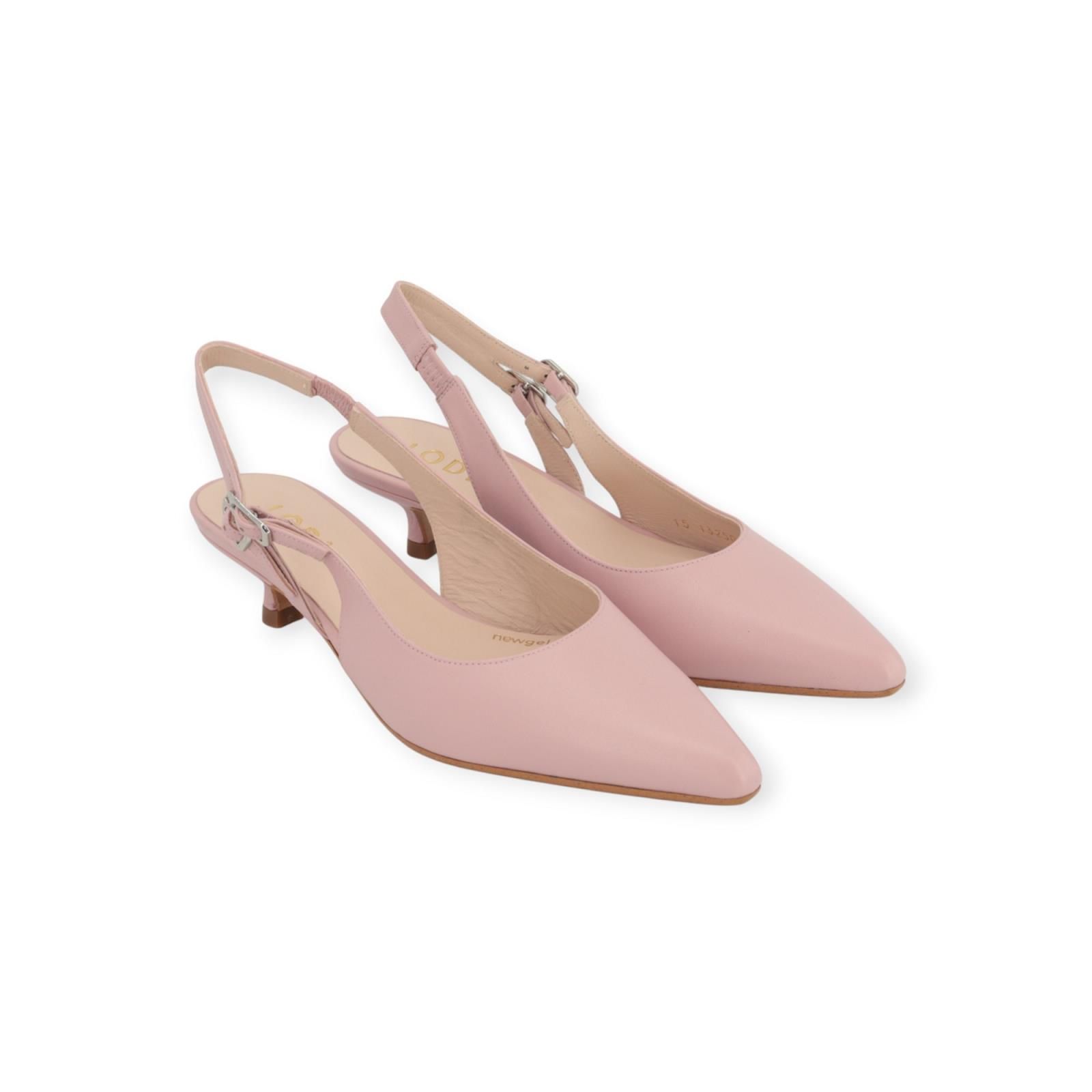 Pump Dalmata van Lodi voor dames. Dit elegant slingback model is in roze leer. Heeft een scherpe neus met een open hiel. Is mooi afgewerkt met 2 bandjes aan de enkel met zilverkleurige gesp en elastiek. Heeft een leren buitenzool met een fijn hakje van 3cm hoog.