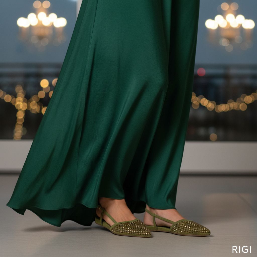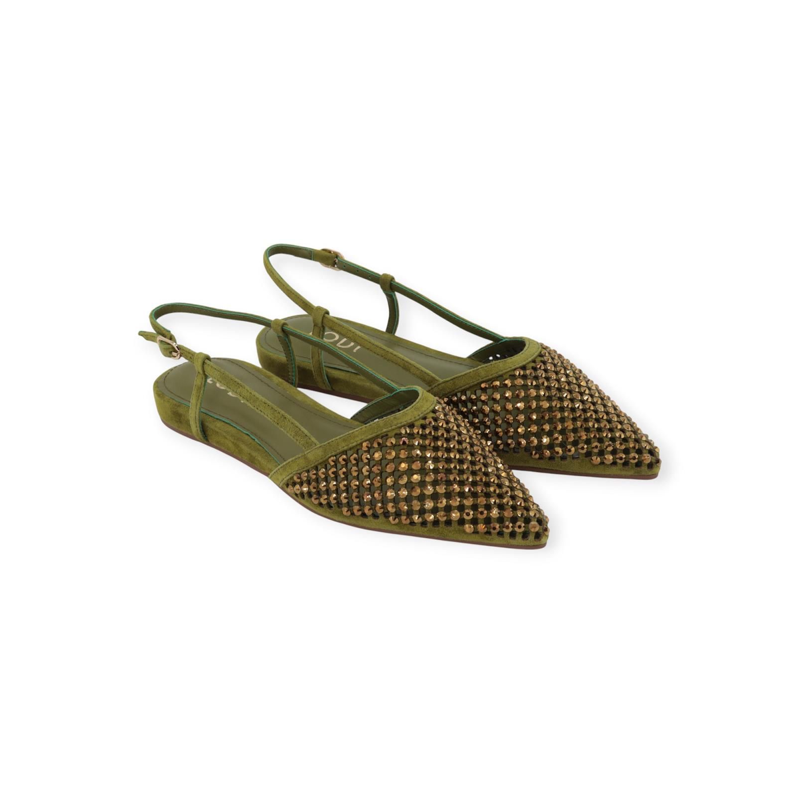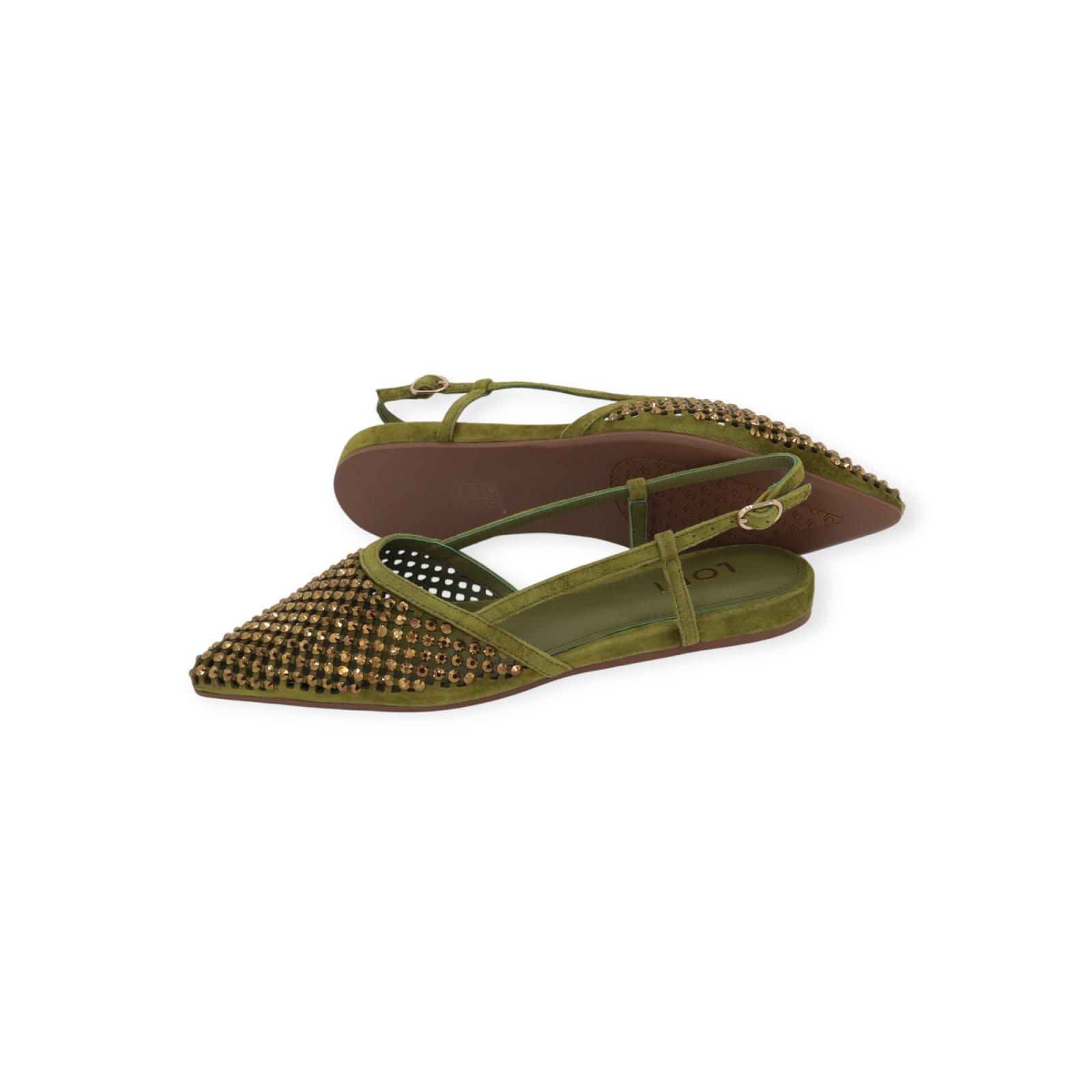 Ballerina Hercules van Lodi voor dames. Dit elegant slingback model is in groen suède. Heeft een scherpe gesloten neus die geperforeerd is en afgewerkt met gouden pailletten. De hiel is open en is afgesloten met een fijn bandje met gespsluiting. Is op een licht sleehakje in suède met een donkere antislipzool.