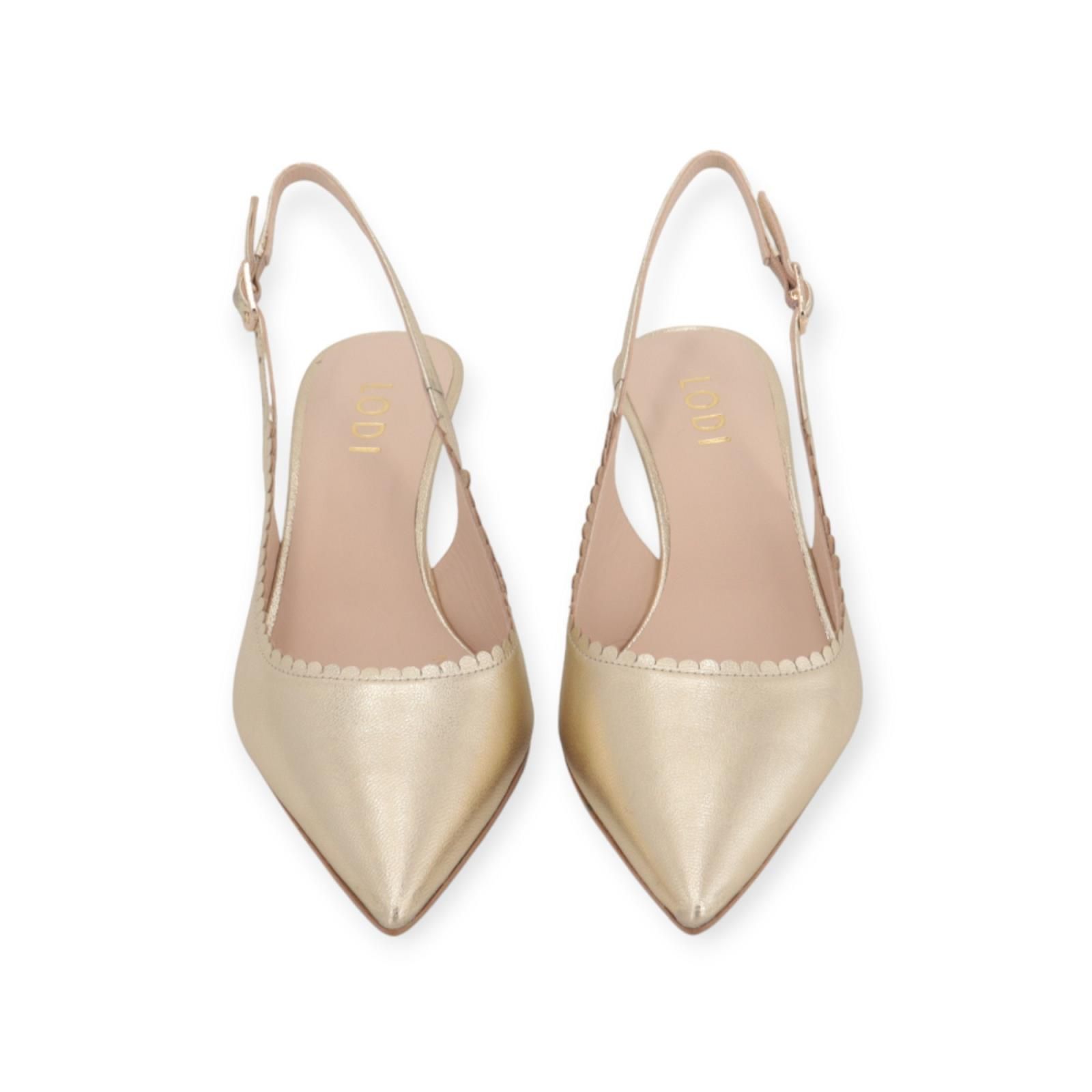 Pump Noan van Lodi voor dames. Deze elegante slingback is in shining goud leer. Heeft een scherpe neus met een open hieltje. Is afgesloten met een gouden gespsluiting rond de enkel en mooi afgewerkt met gekarteld leer. Heeft een fijn hakje van 7cm hoog met een leren buitenzool.