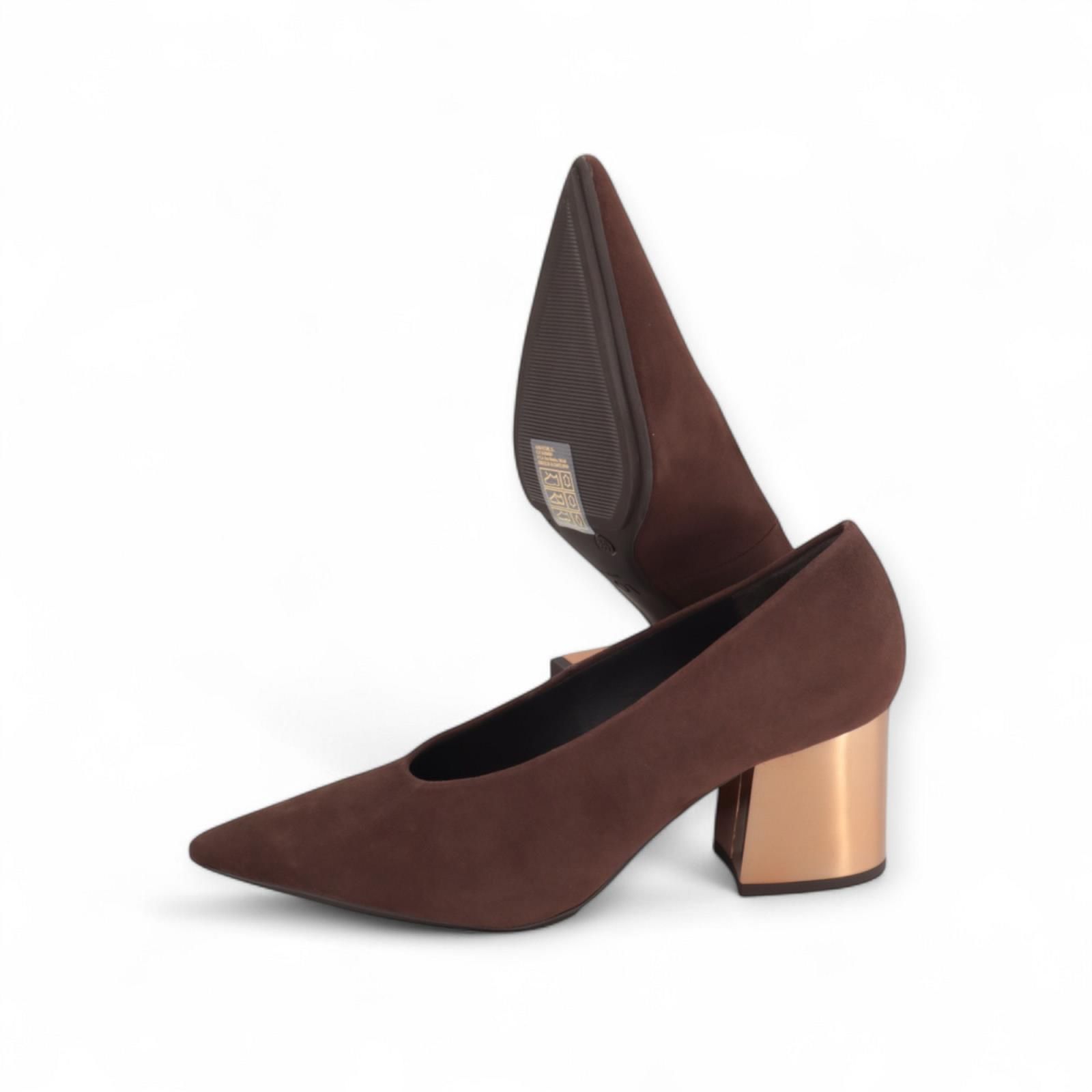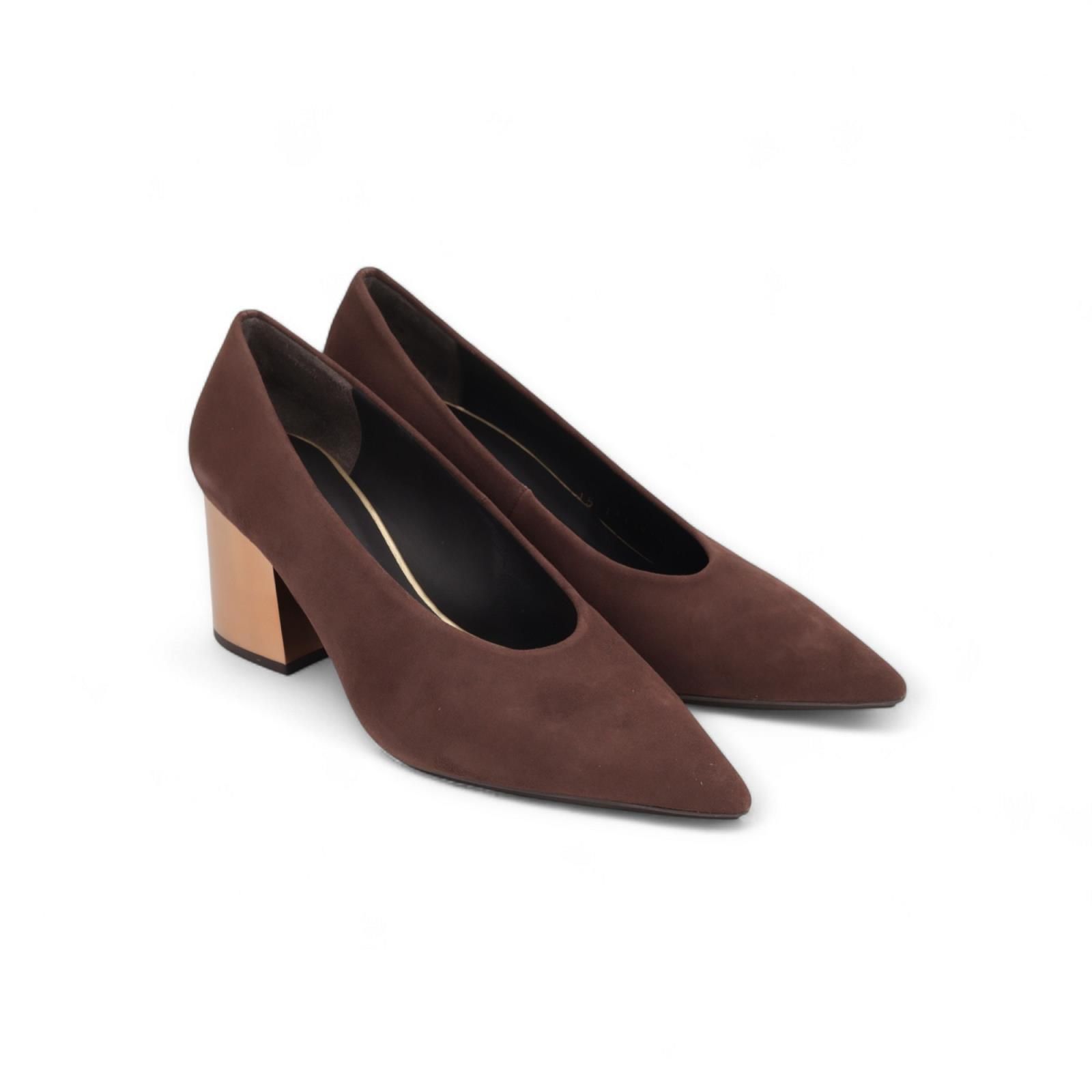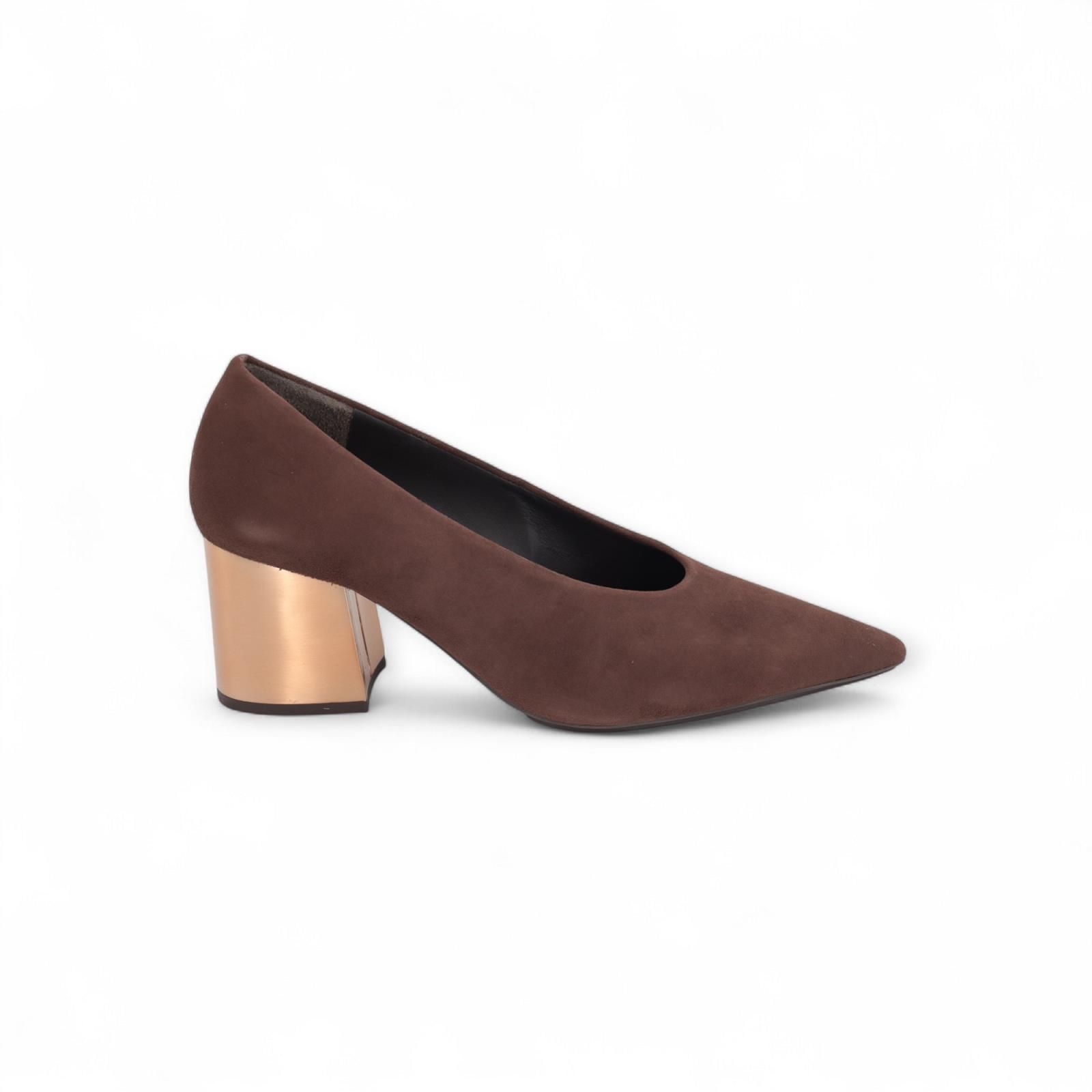Pump Noria van LODI voor dames. Deze bruine pump is in bruin suède. Heeft een scherpe punt en als eyecatcher een gouden ronde hak van 5-5.5cm hoog.