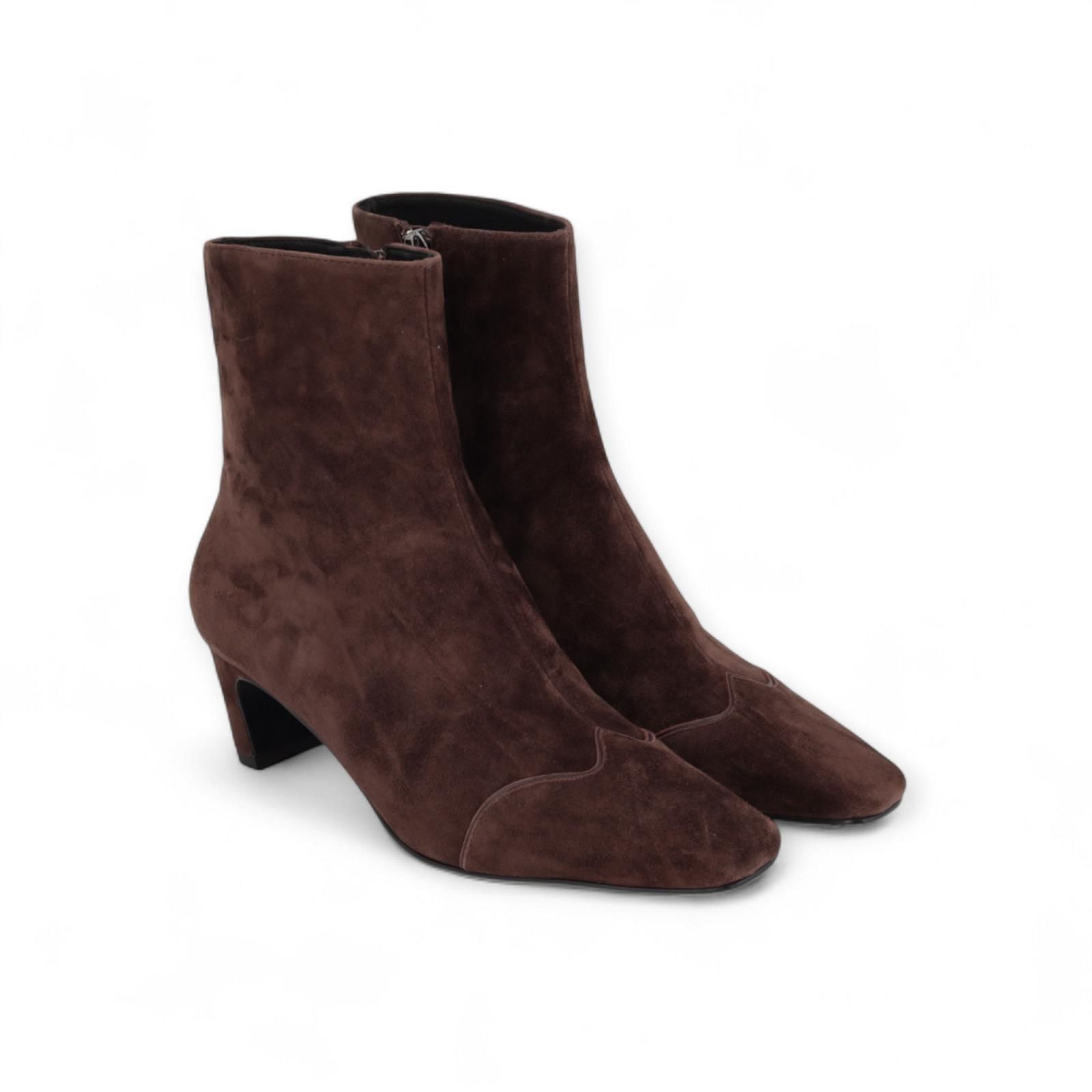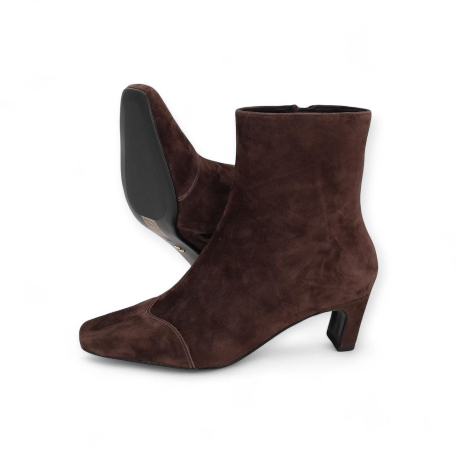 Enkellaarsje van Lola Cruz voor dames. Dit elegant enkellaarsje is in bruin suède met een licht scherpe top en een fijn stiksel. Heeft een geometrische hak van 5-5,5cm hoog.