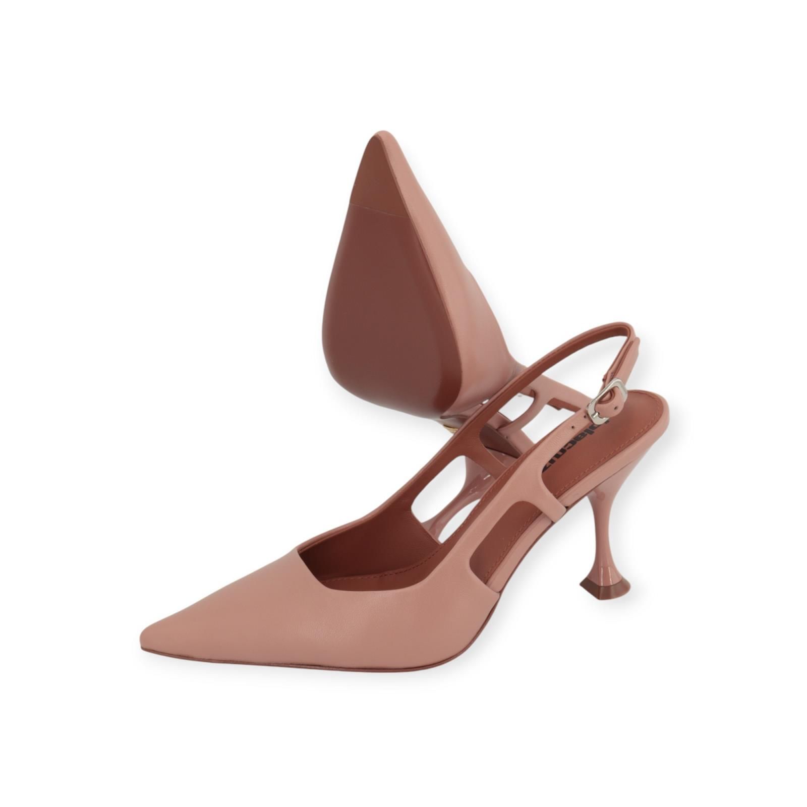 Pump Rhina van Lola Cruz voor dames. Dit elegant slingback model is in warm nude leer met een scherpe neus en open hieltje. Is afgewerkt met fijne bandjes en gesloten met een gouden gespsluiting rond de hiel. Heeft een fijn hakje van 8.5cm hoog met een leren buitenzool.