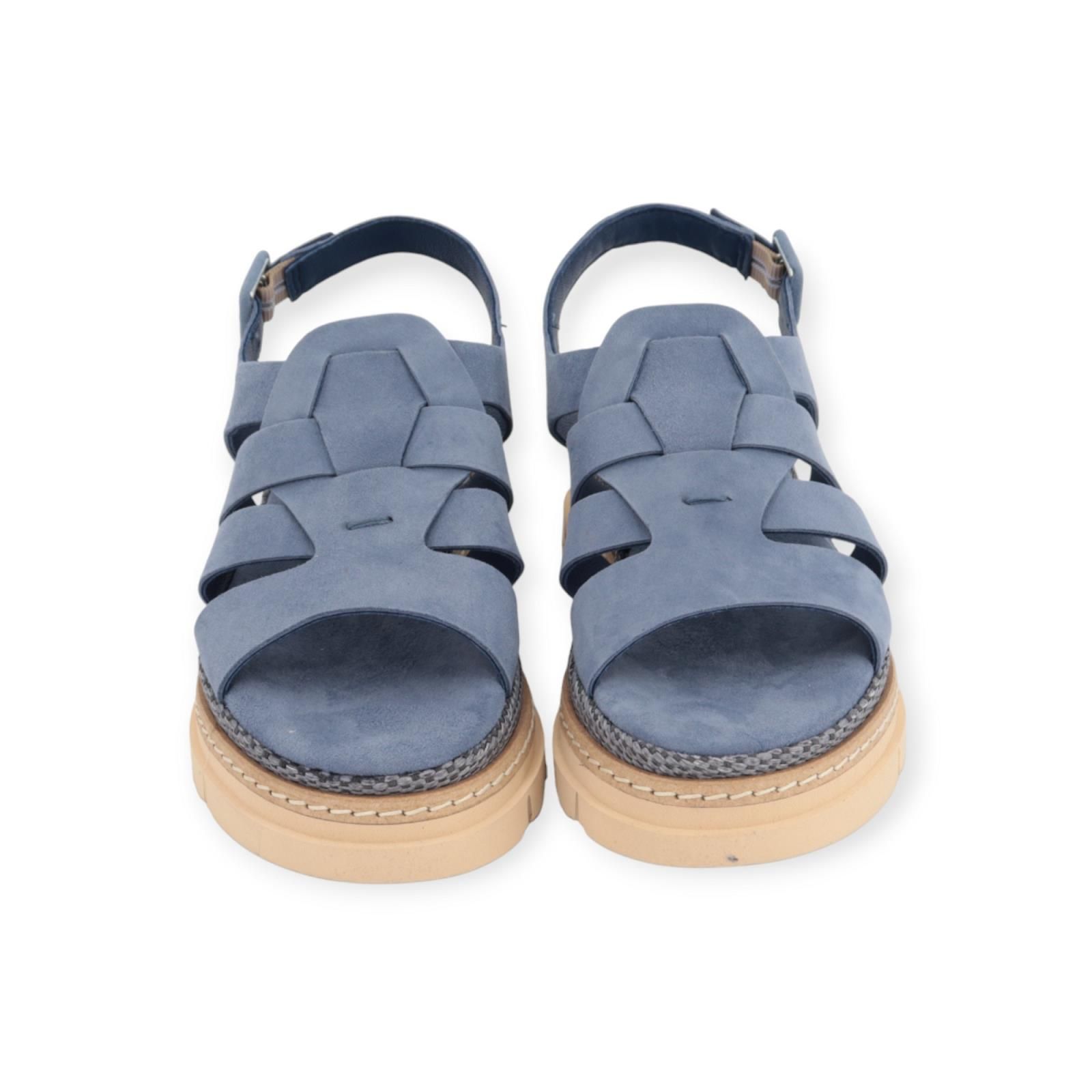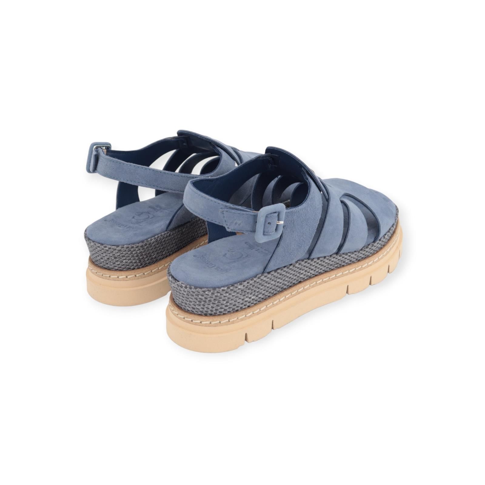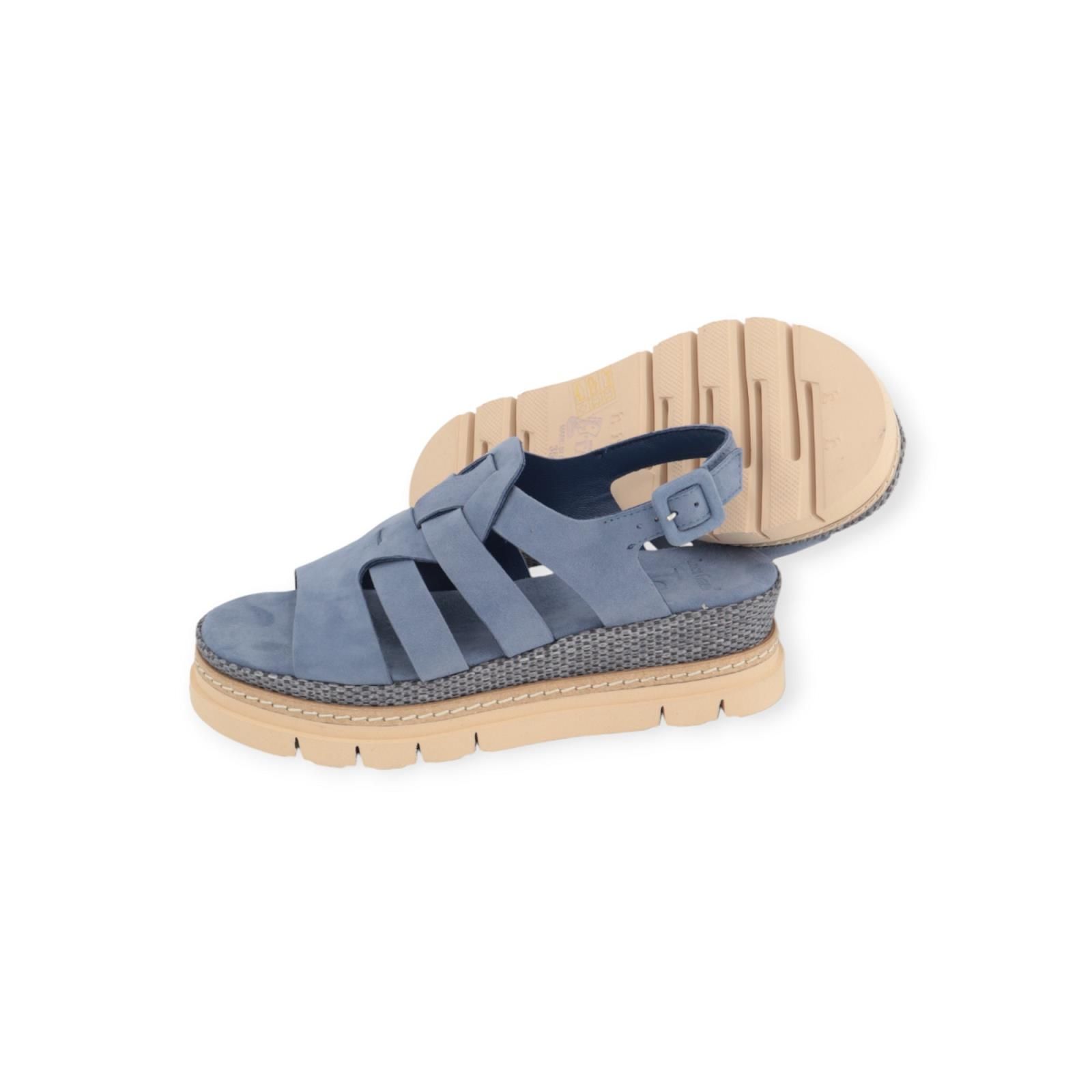 Sandaal H723S van Luca Grossi voor dames. Deze sandaal is in lichtblauw suède. Is mooi bedekt met gekruiste bandjes over de wreef en een gespsluiting rond de enkel. Heeft een aangename dikke microzool met een lichte sleehak van 3cm hoog in raffia