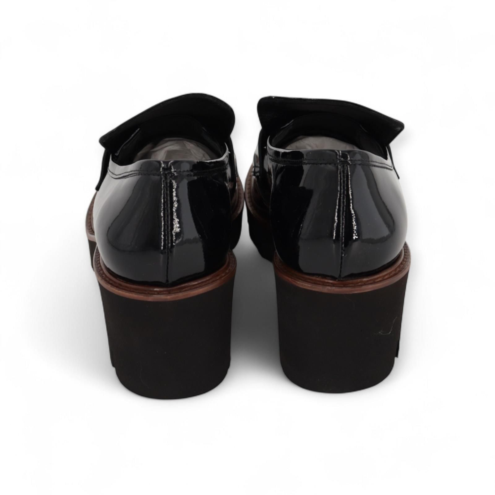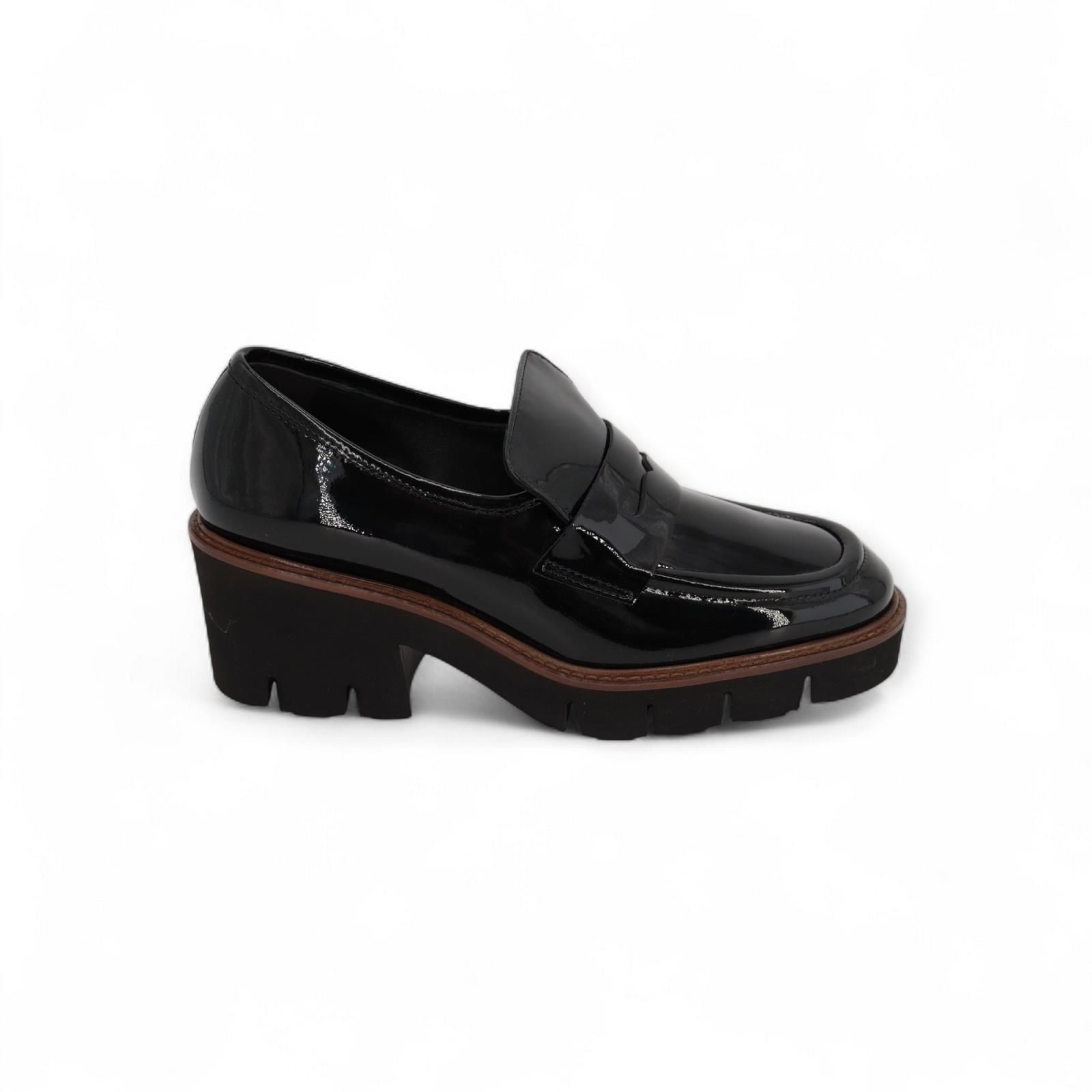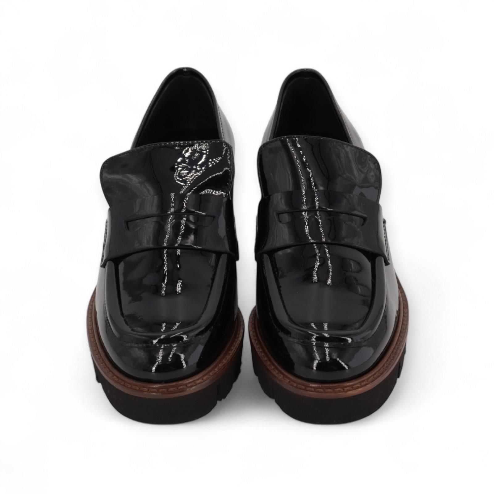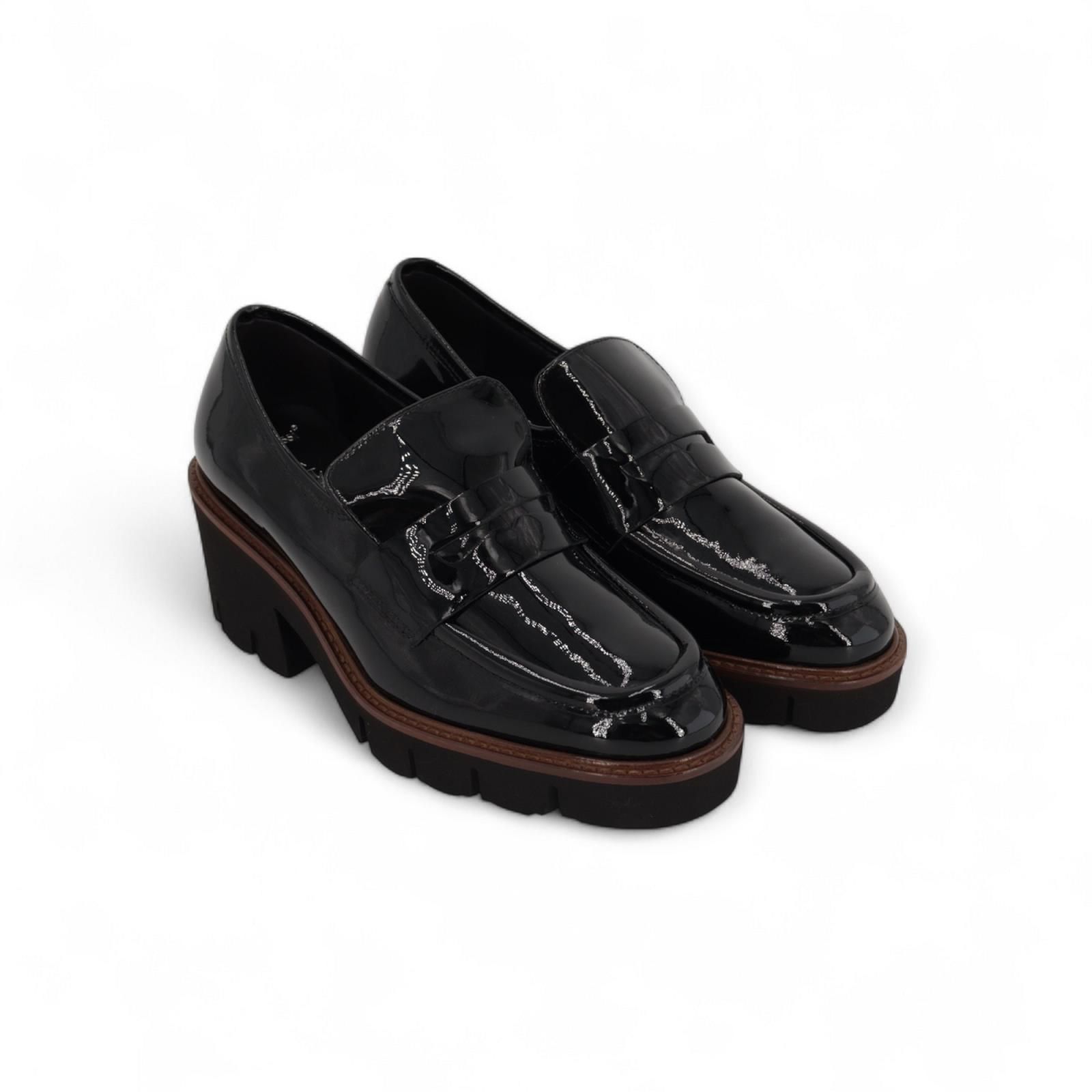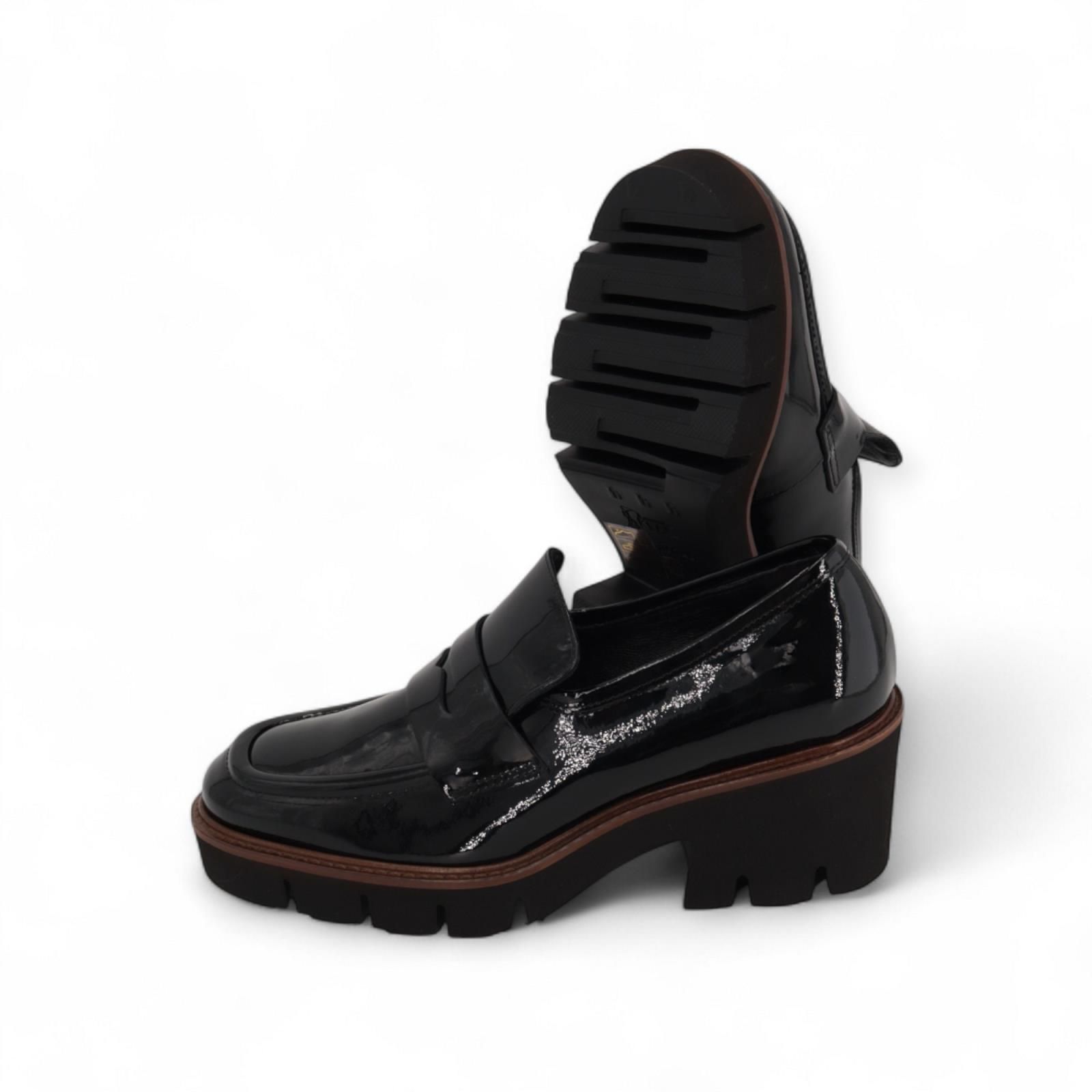Mocassin K014 van Luca Grossi voor dames. Deze mocassin is in zwart lakleer met een dikke stekking en band over de wreef. Is op een lichte plateau microzool met een blokhakje van 3 cm hoog.