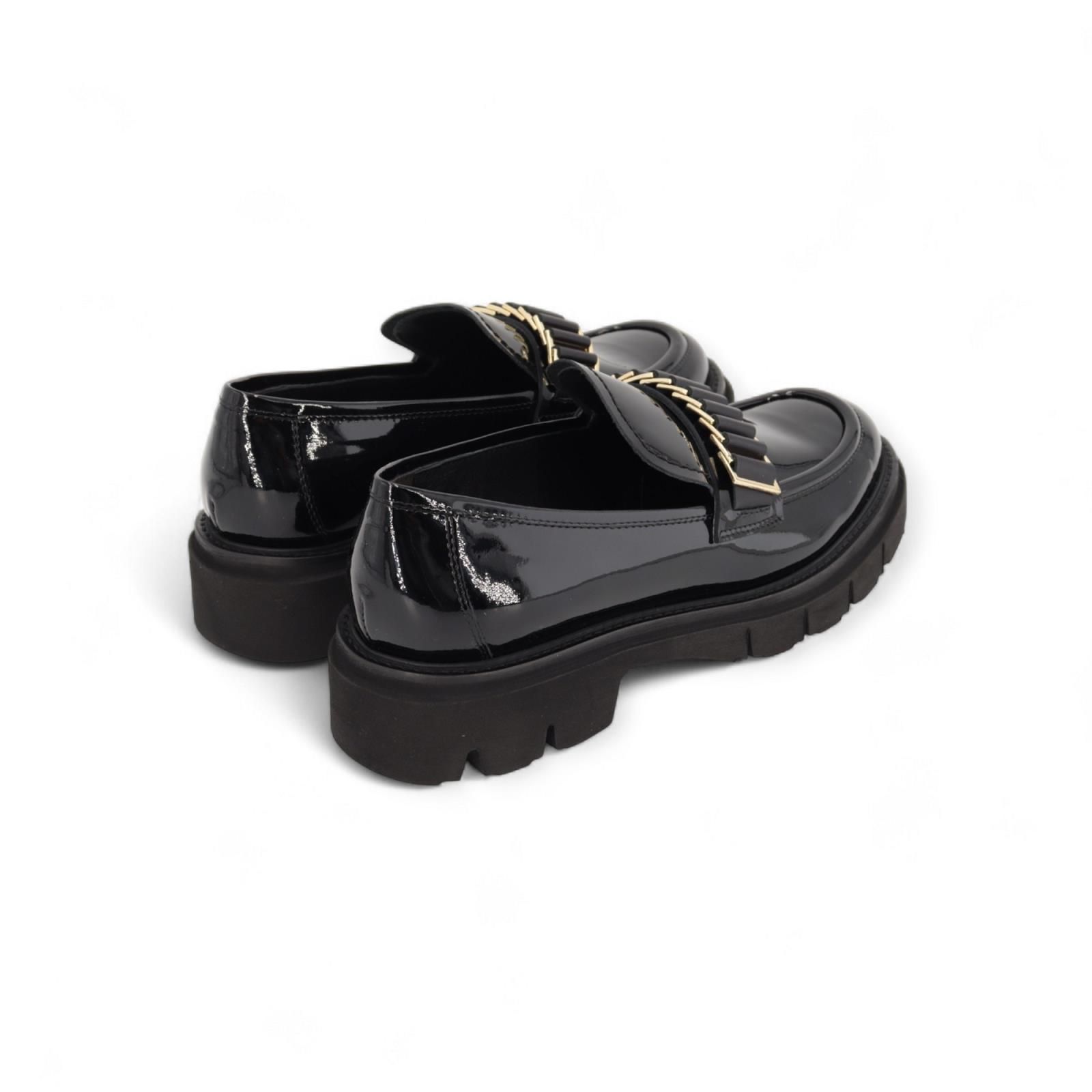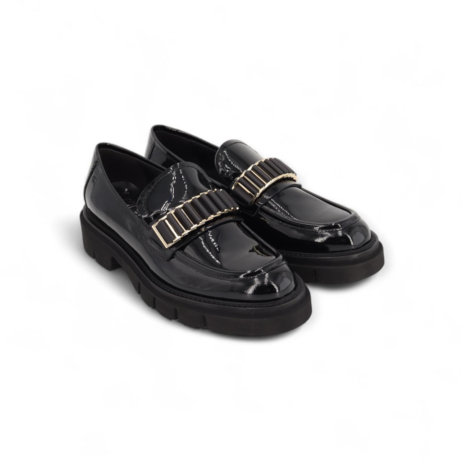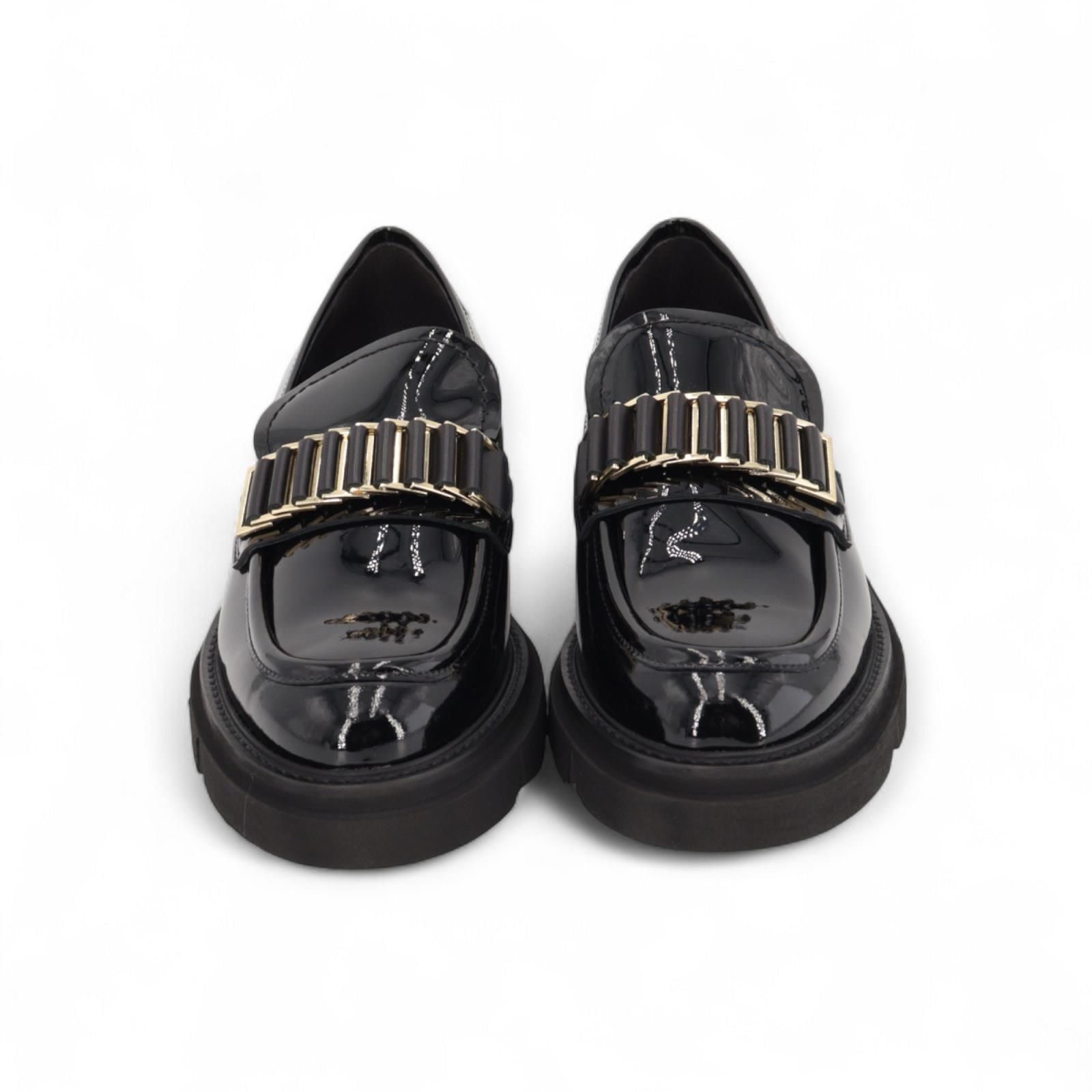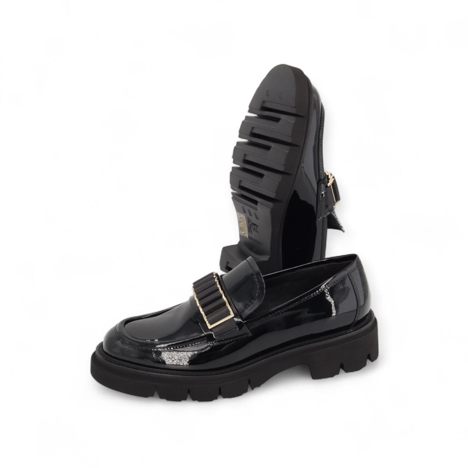 Mocassin L446 van Luca Grossi voor dames. Deze mocassin is in zwart lakleer. Is mooi afgewerkt met een gouden boekel over de wreef en een dikke aangename zool.
