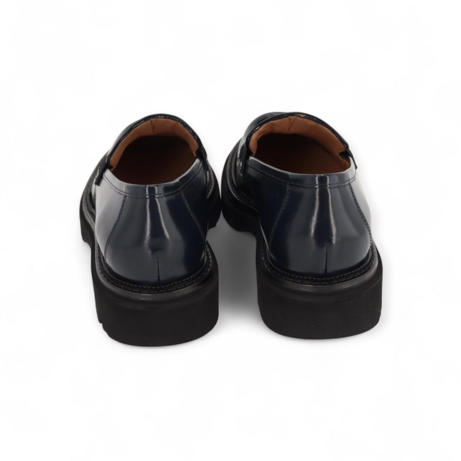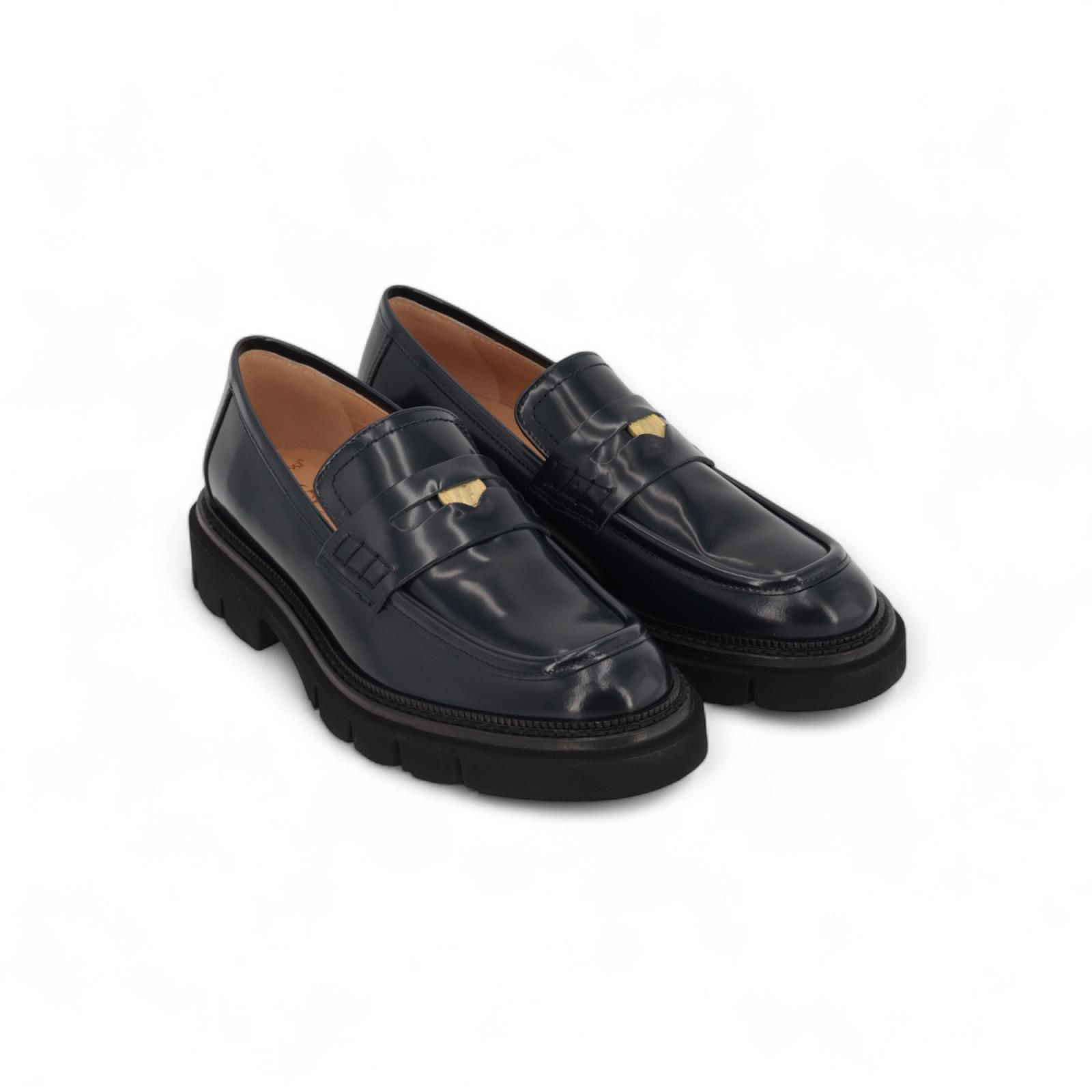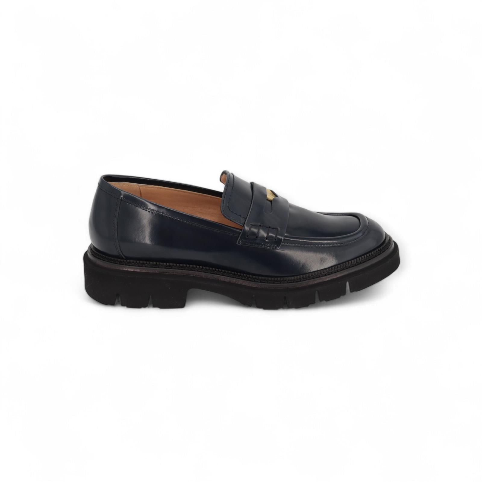 Mocassin L471 van Luca Grossi voor dames. Deze mocassin is in blauw leer. Heeft een band over de wreef met een gouden logomunt als detail.