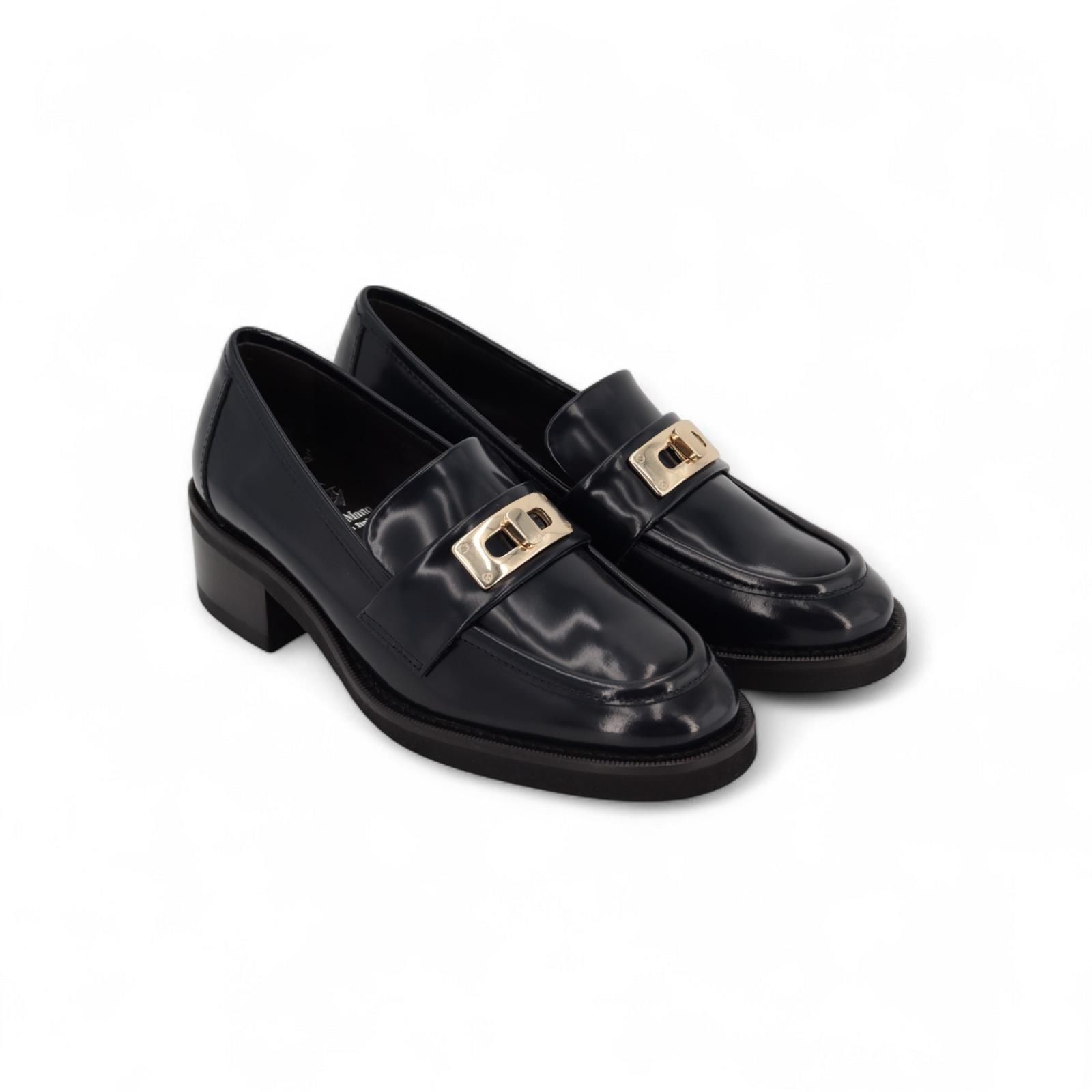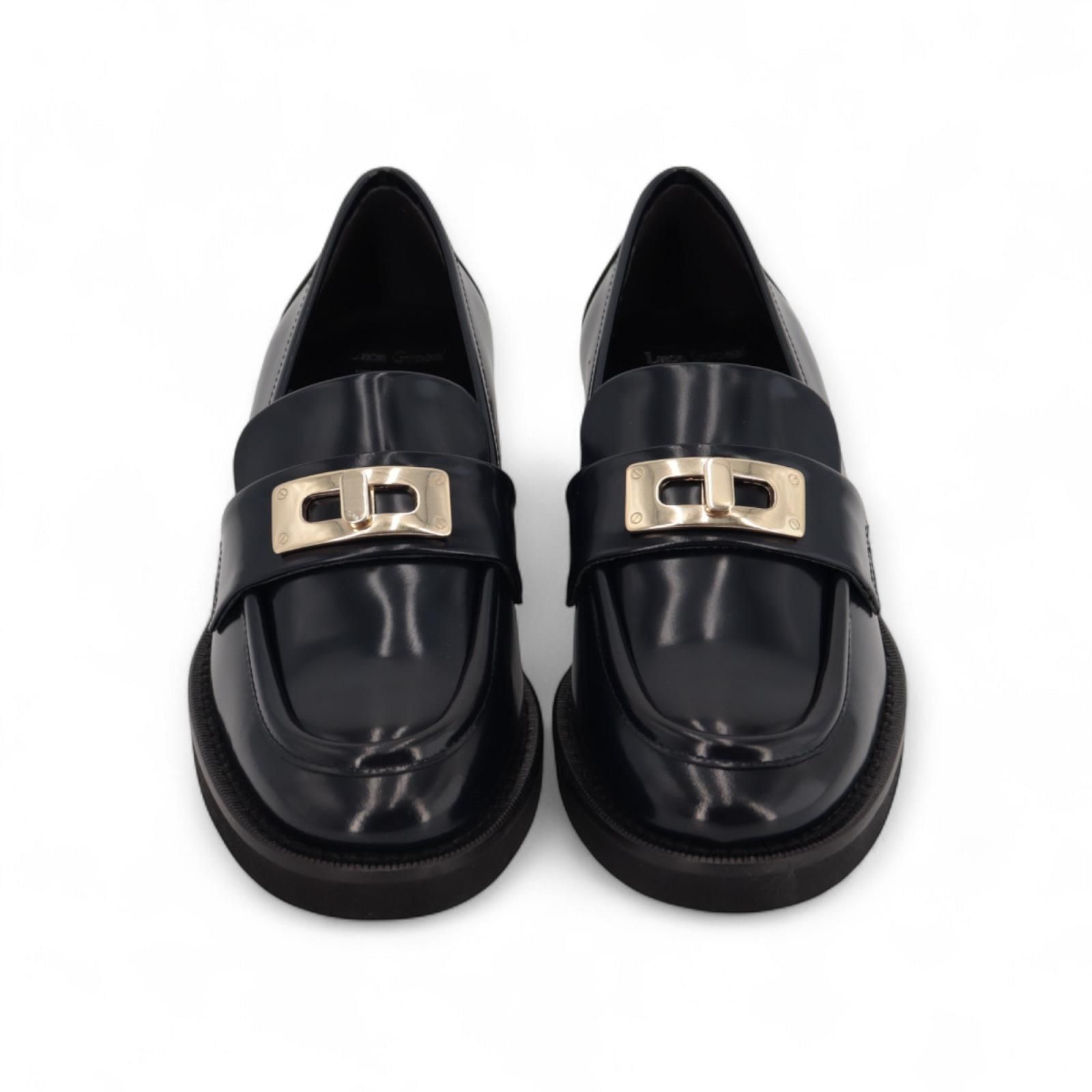 Mocassin L560 van Luca Grossi voor dames. Deze mocassin is in blauw leer. Heeft een dikke stekking en is afgewerkt met een gouden boekel over de wreef. Is op een licht blokhakje van 3 cm hoog en op een antislip zool.
