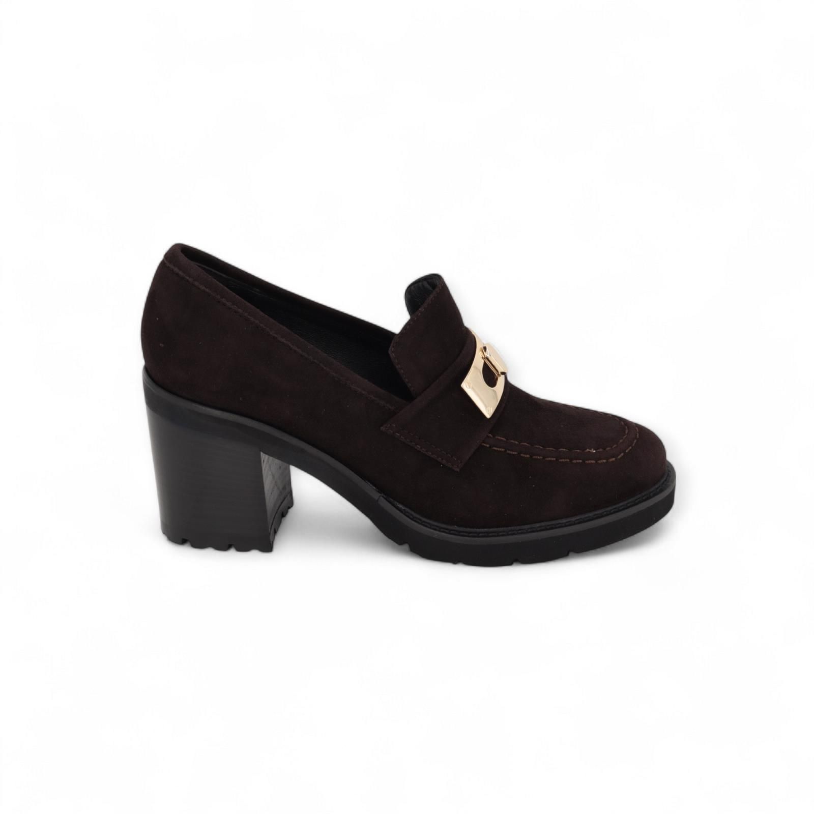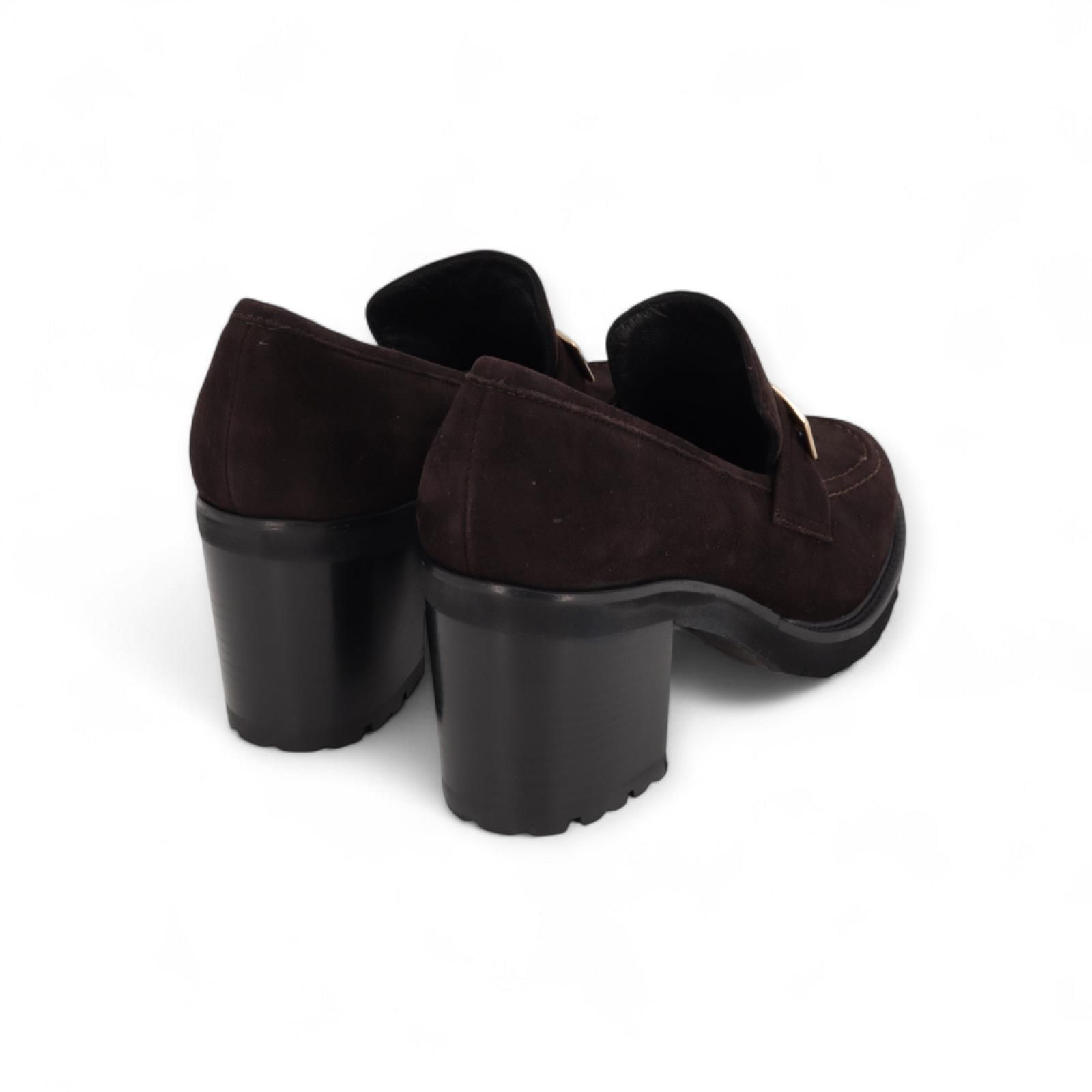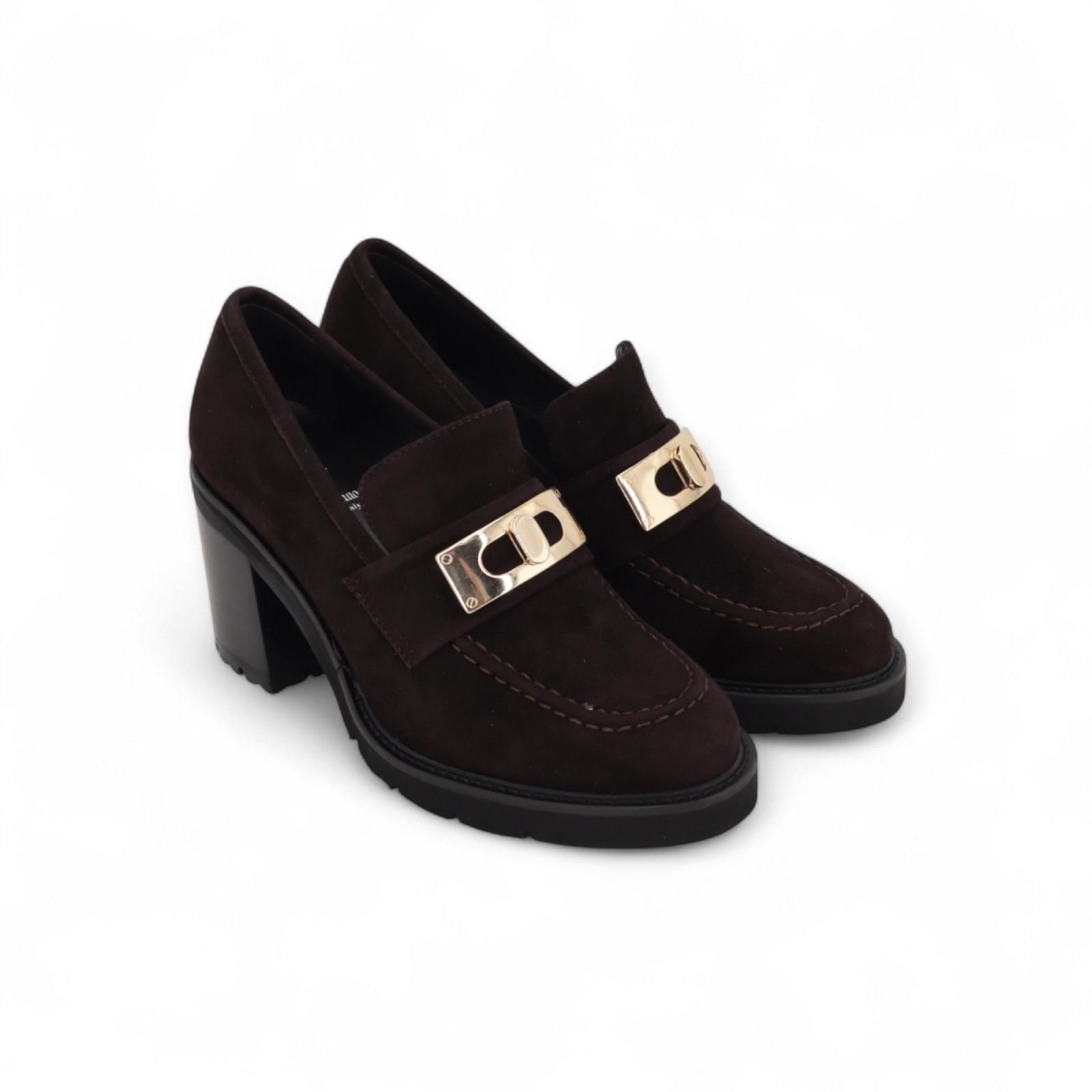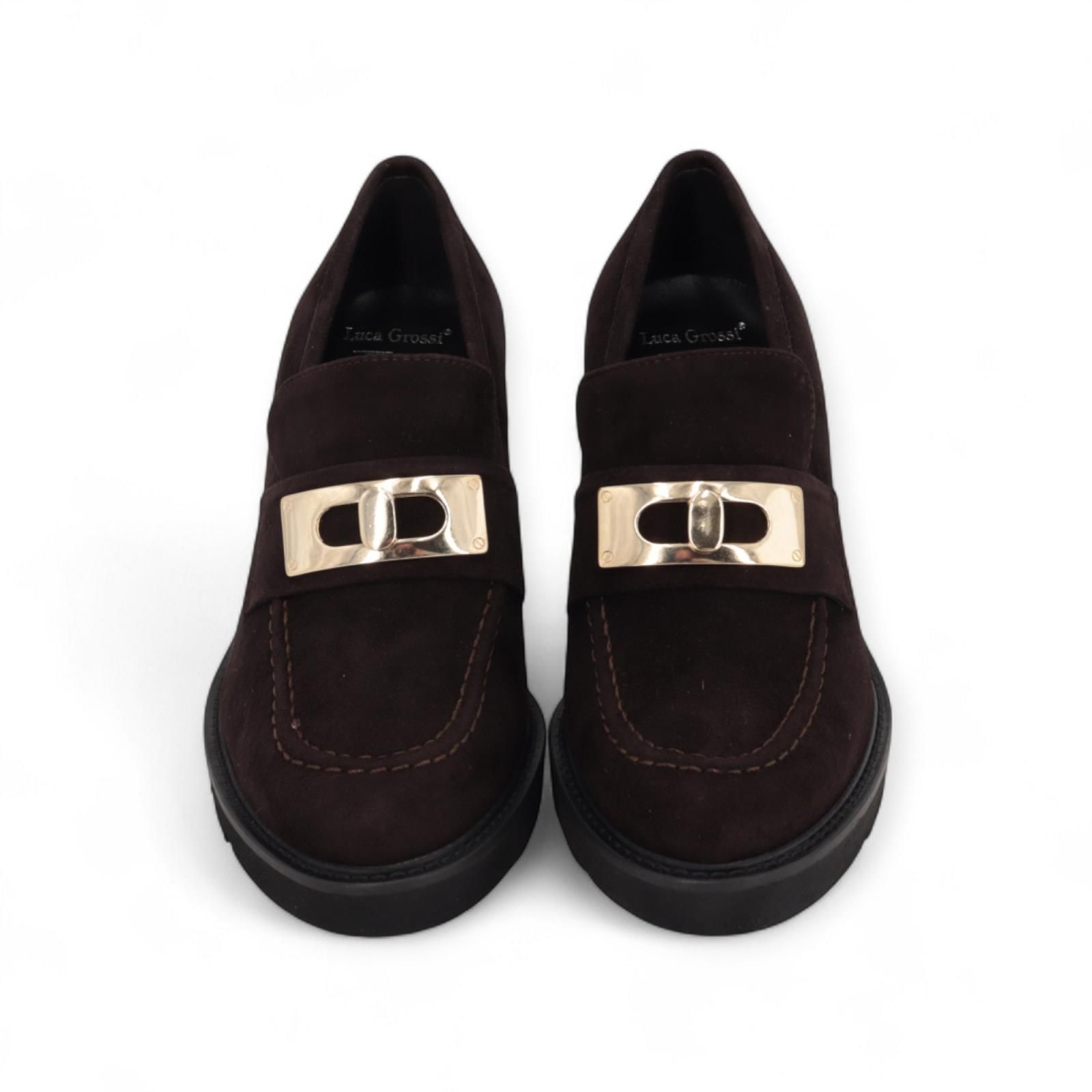 Mocassin L559M van Luca Grossi voor dames. Deze mocassin is in bruin suède. Is mooi afgewerkt met een boekel en flap over de wreef met een gouden sluitingdetail. Is op een dikke antislipzool met een blokhak van 6cm hoog.