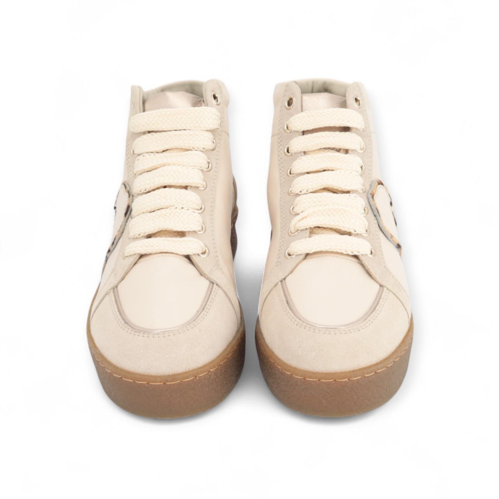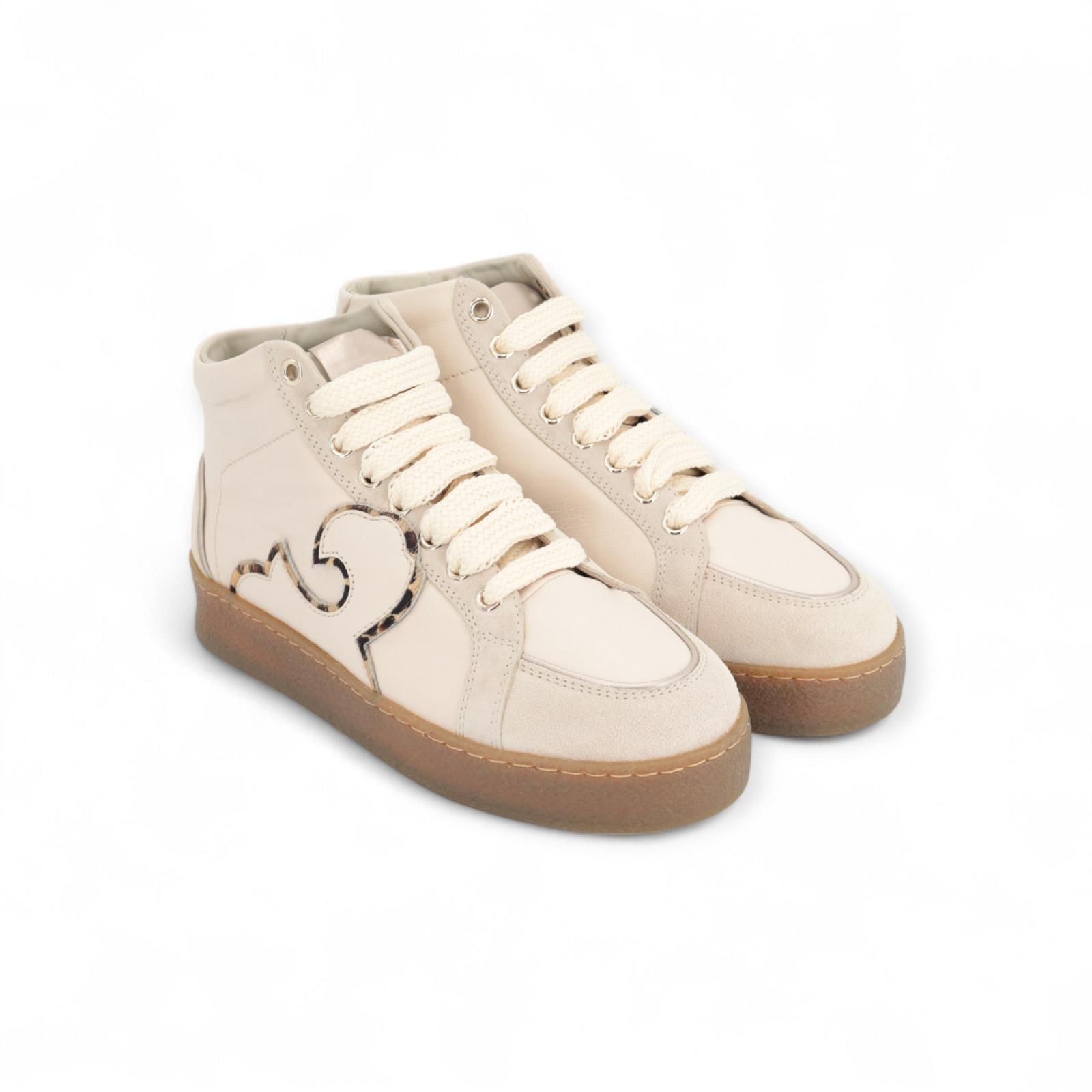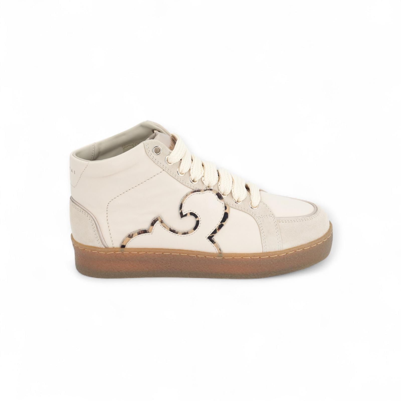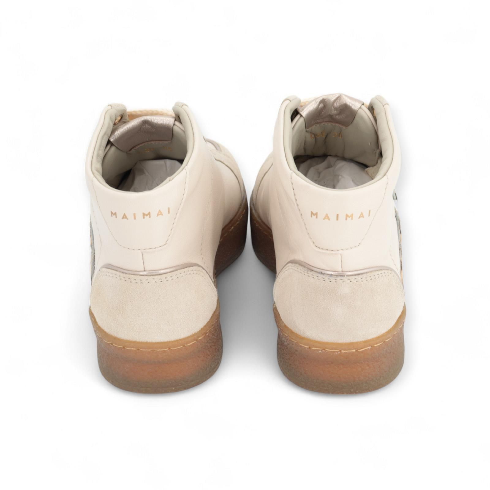 Sneaker Acanto Crem van Mai Mai voor dames. Deze sneaker is in beige leer met suède en komt tot aan de enkel. Ontleent zijn naam aan gelijknamige bloem die weergegeven wordt op de zijkant met leopardvel omrand. Is op een bruine gummyzool en de binnenzool is uitneembaar.
