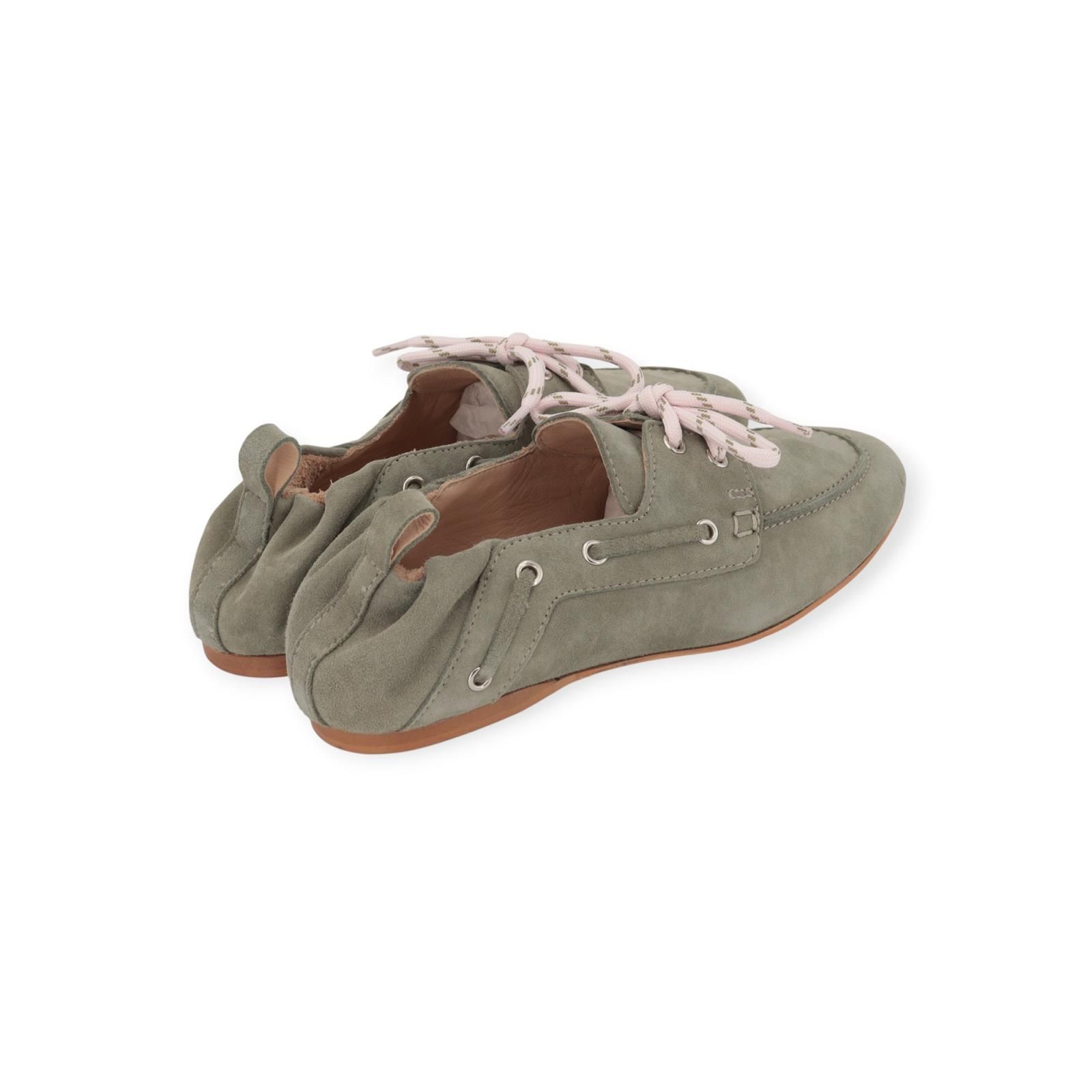Mocassin Antwerp van March23 voor dames. Deze elegante loafer is in lichtgroen suède. Heeft een roze met groen opvallende vetersluiting (extra groen leren veters meegeleverd) met groen suède veters aan de zijkant. De Antwerp loafer typeert aan de typische bootschoen stijl die dé trend is voor deze zomer. De hiel is met een rekker waardoor het model mooi aan de voet blijft en makkelijk aantrekbaar is. Heeft een leren buitenzool.