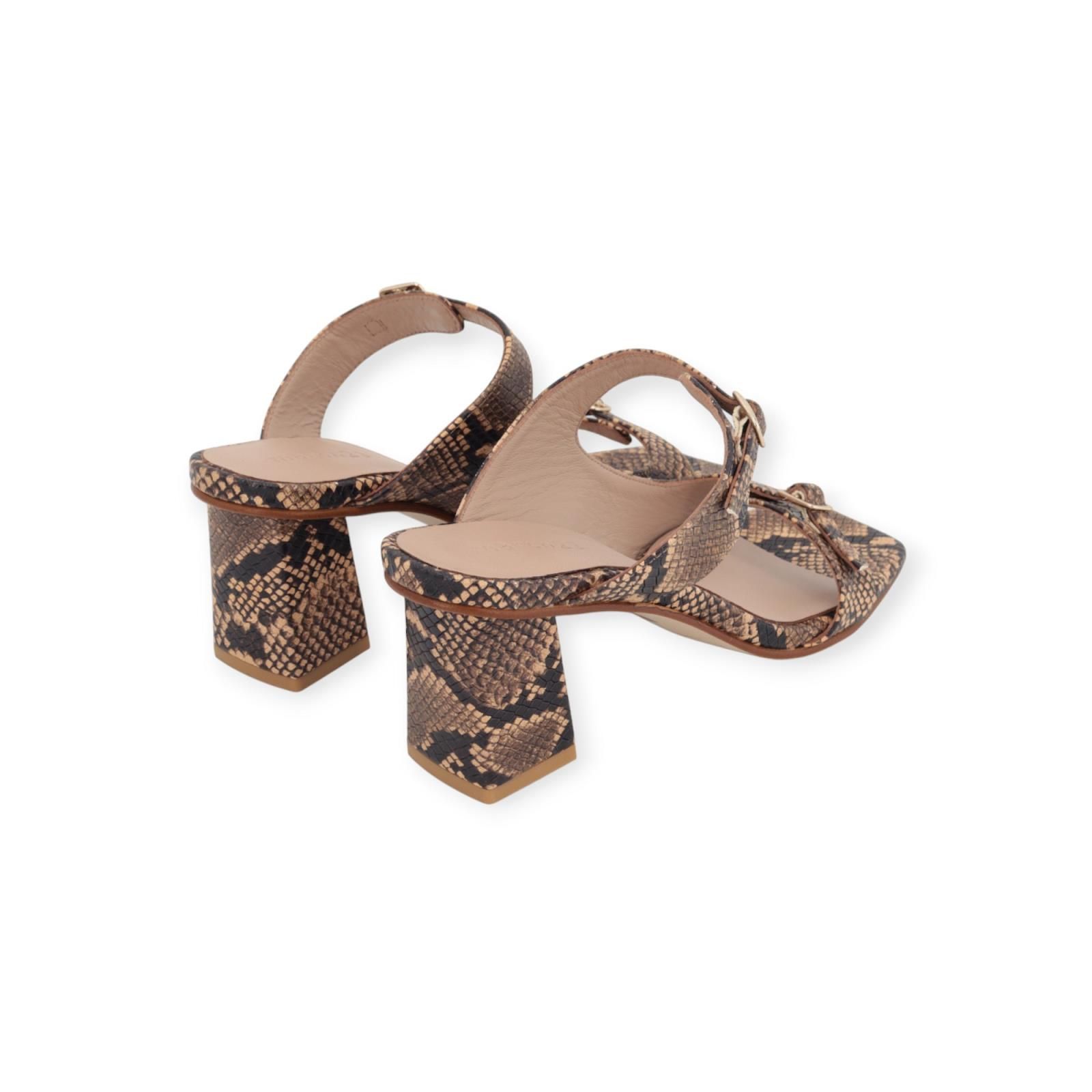Muil Monaco van March 23 voor dames. Dit elegant muiltje is in nude (poeder) met zwart python leer met een open carré top. Heeft 2 elegante bandjes over de wreef met gouden gespsluiting. Heeft een aangenaam blokhakje van 6,5cm hoog met een leren buitenzool.
