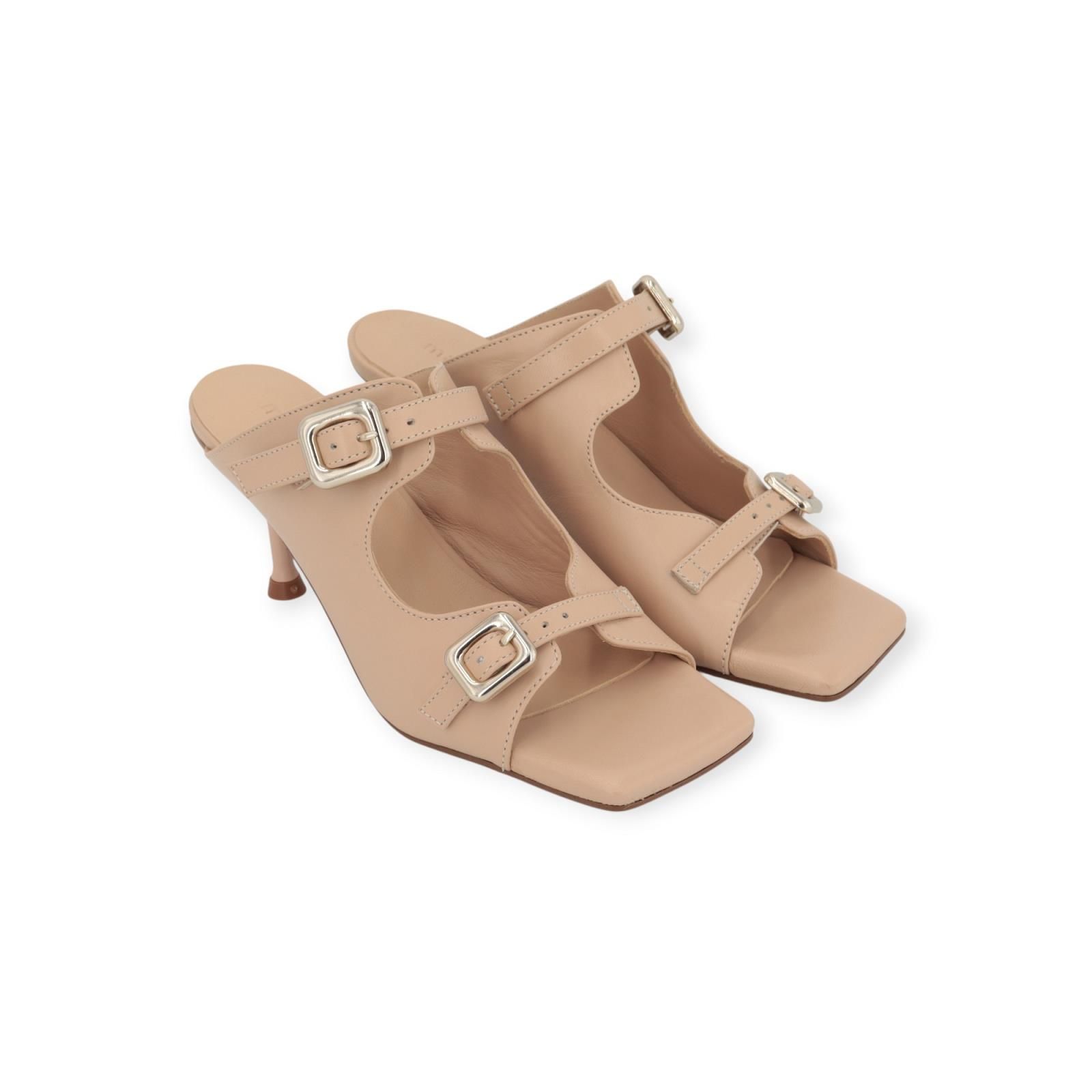 Muil Raquelle van March 23 voor dames. Dit elegant muiltje is in beige leer. Heeft 2 bandjes over de wreef met een metalen gespsluiting. Heeft een carré neus en een fijn hakje van 7cm hoog. Is op een leren buitenzool.