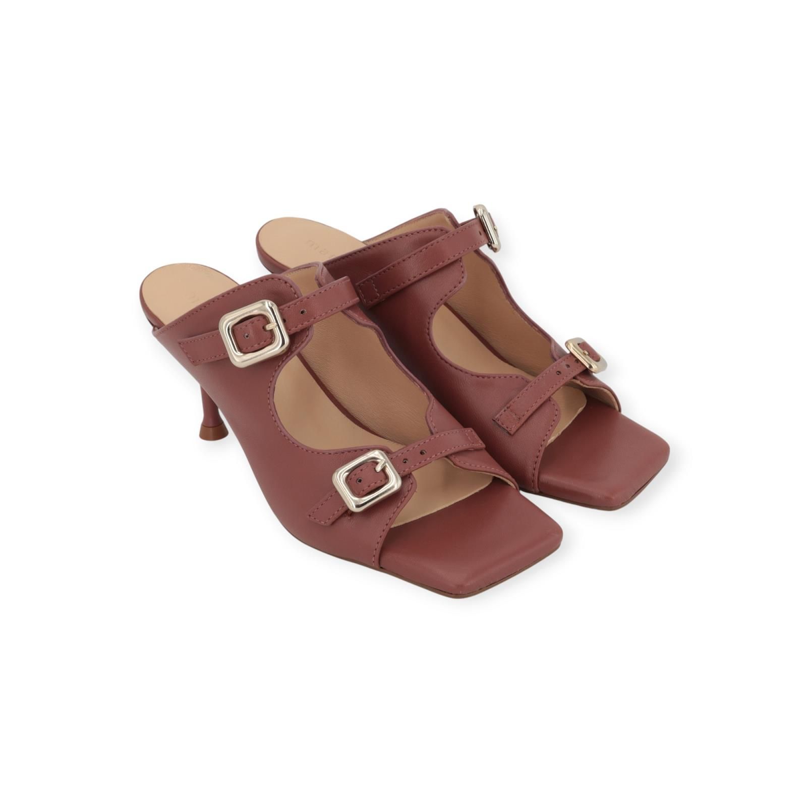 Muil Raquelle van March 23 voor dames. Dit elegant muiltje is in roze - bordeaux (sienna) leer. Heeft 2 bandjes over de wreef met een metalen gespsluiting. Heeft een carré neus en een fijn hakje van 7cm hoog. Is op een leren buitenzool.