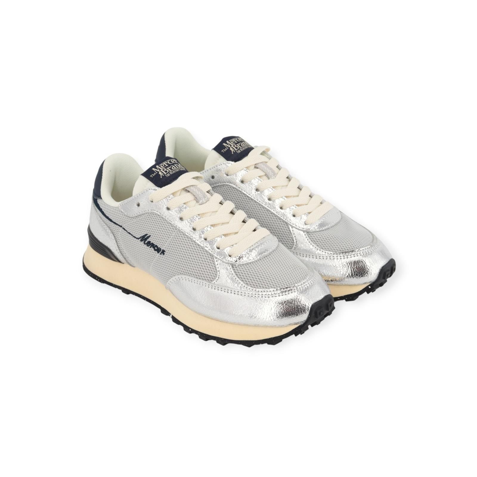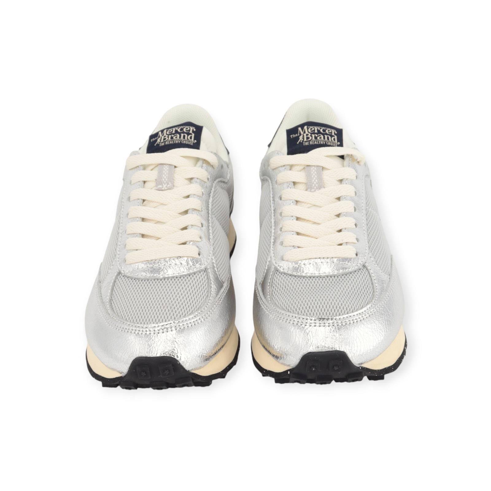 Sneaker The Re-Racer van Mercer voor dames. Deze Re-Racer is in grijze mesh met zilver shining leer en blauwe hielflap. Heeft het nieuw geborduurd Mercer-logo aan de zijkant in blauw suède. Zelfde comfort maar met nog fijnere afwerking. De binnenzool is uitneembaar en heeft een ‘ nieuwe ‘ lichtgewicht buitenzool voor een gedempte stap gemaakt van gerecycled rubber. Combineer deze met je favoriete Mercer outfit.