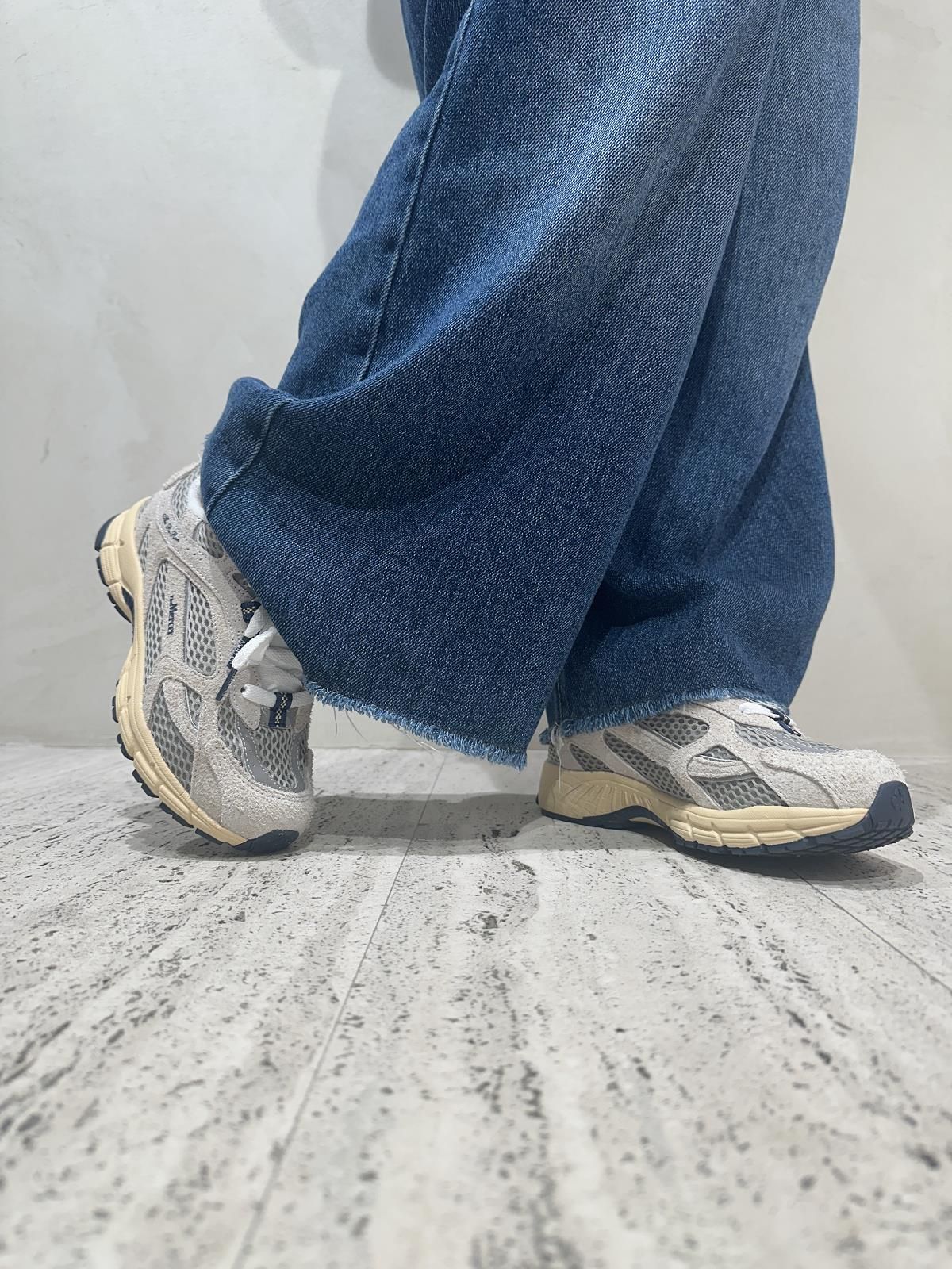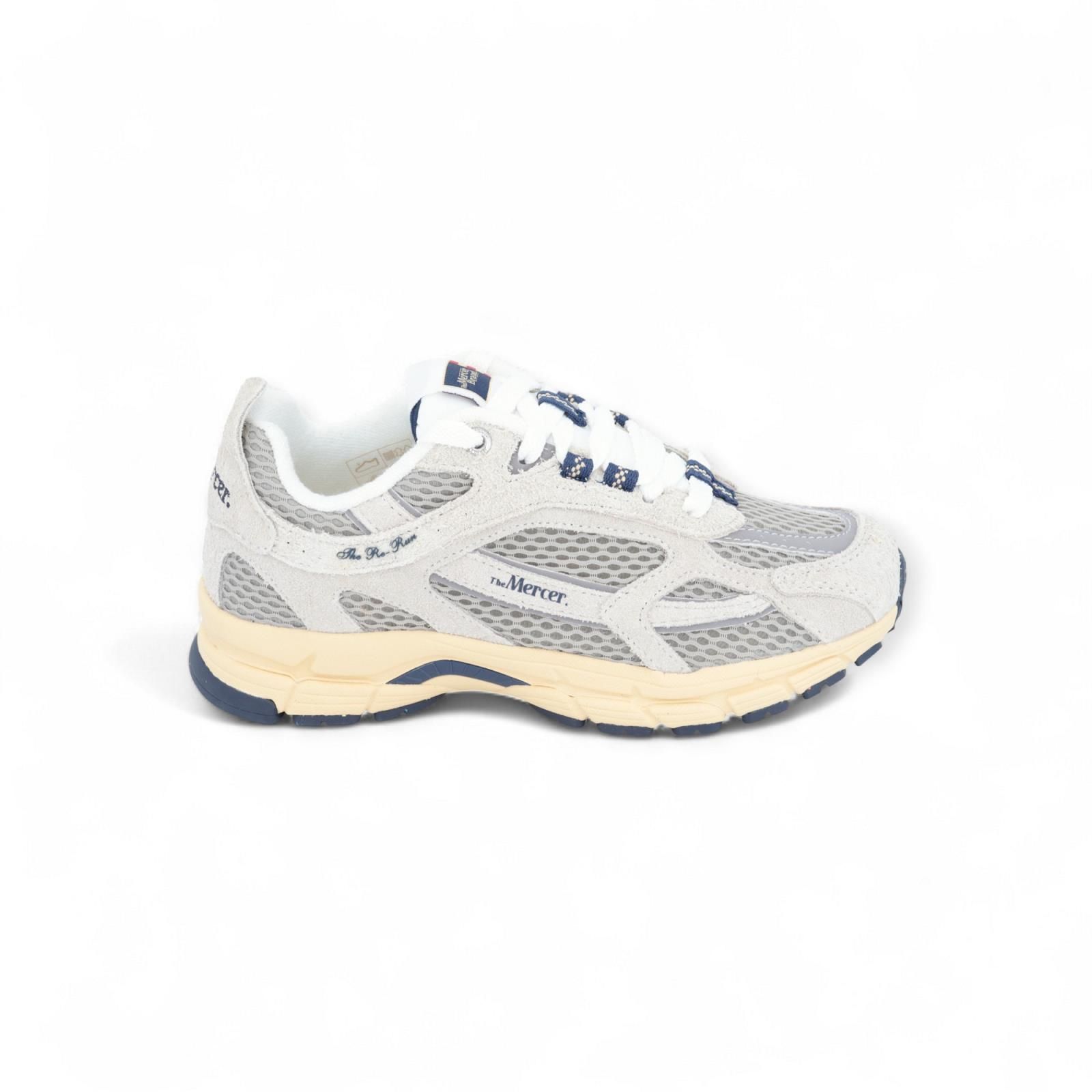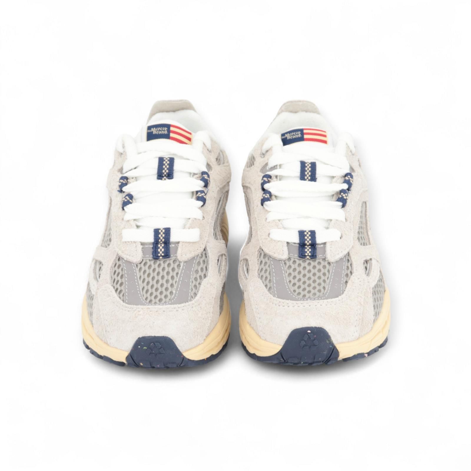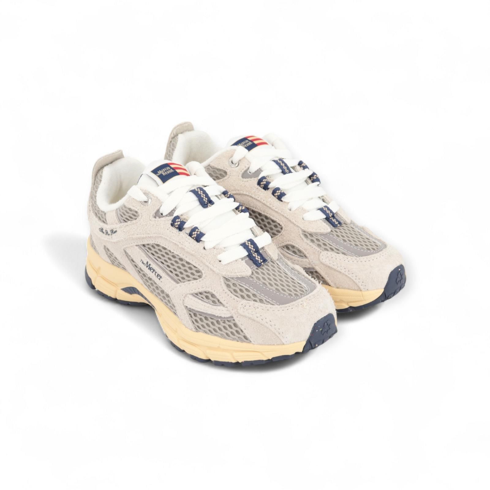Sneaker Re Run Americana van Mercer voor dames. De Americana, het nieuwste model van Mercer. Suède/ leer off wit lederstukken met grove grijze mesh structuren, afgewerkt met witte veters. Heeft op de flap het ‘americana’ Mercer Brand logo. Is op een gerecycled zool met een uitneembare/ wollen binnenzool. Voelt super licht aan.