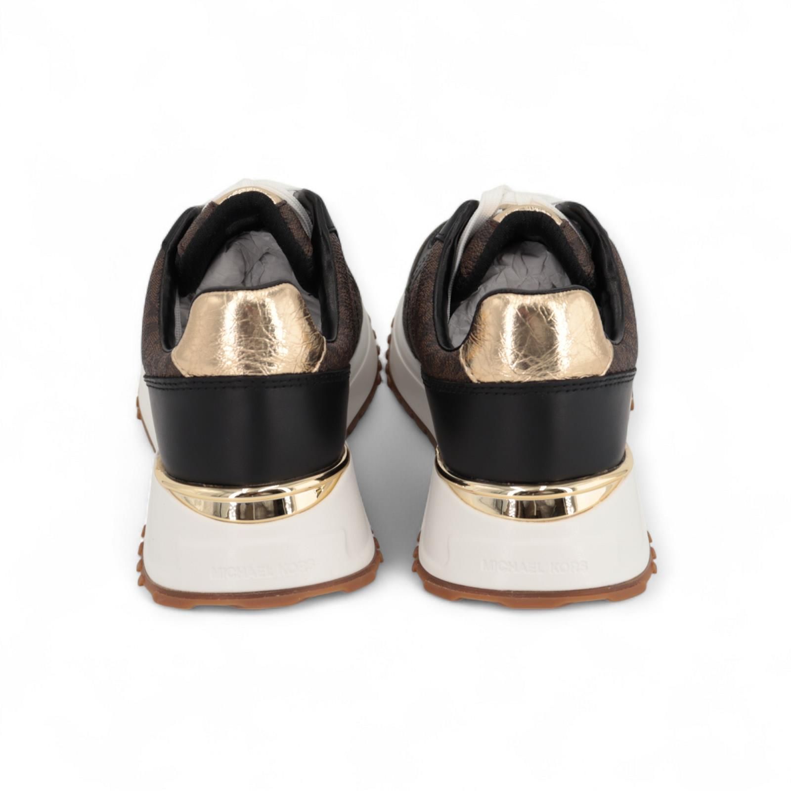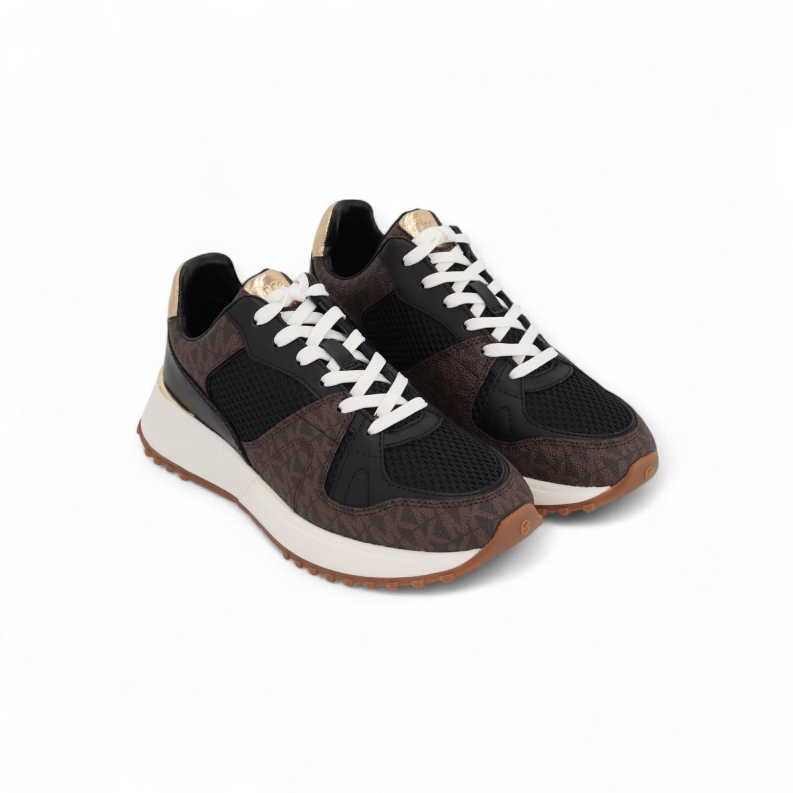 Sneaker Jaime van Michael Kors voor dames. Deze sneaker is in bruin leer met logo geprint en zwart. Afgewerkt met een gouden hielflap. De mix van suède, mesh en leer creeert een luxueuse look met een sportieve stijl. De binnenzool is uitneembaar.