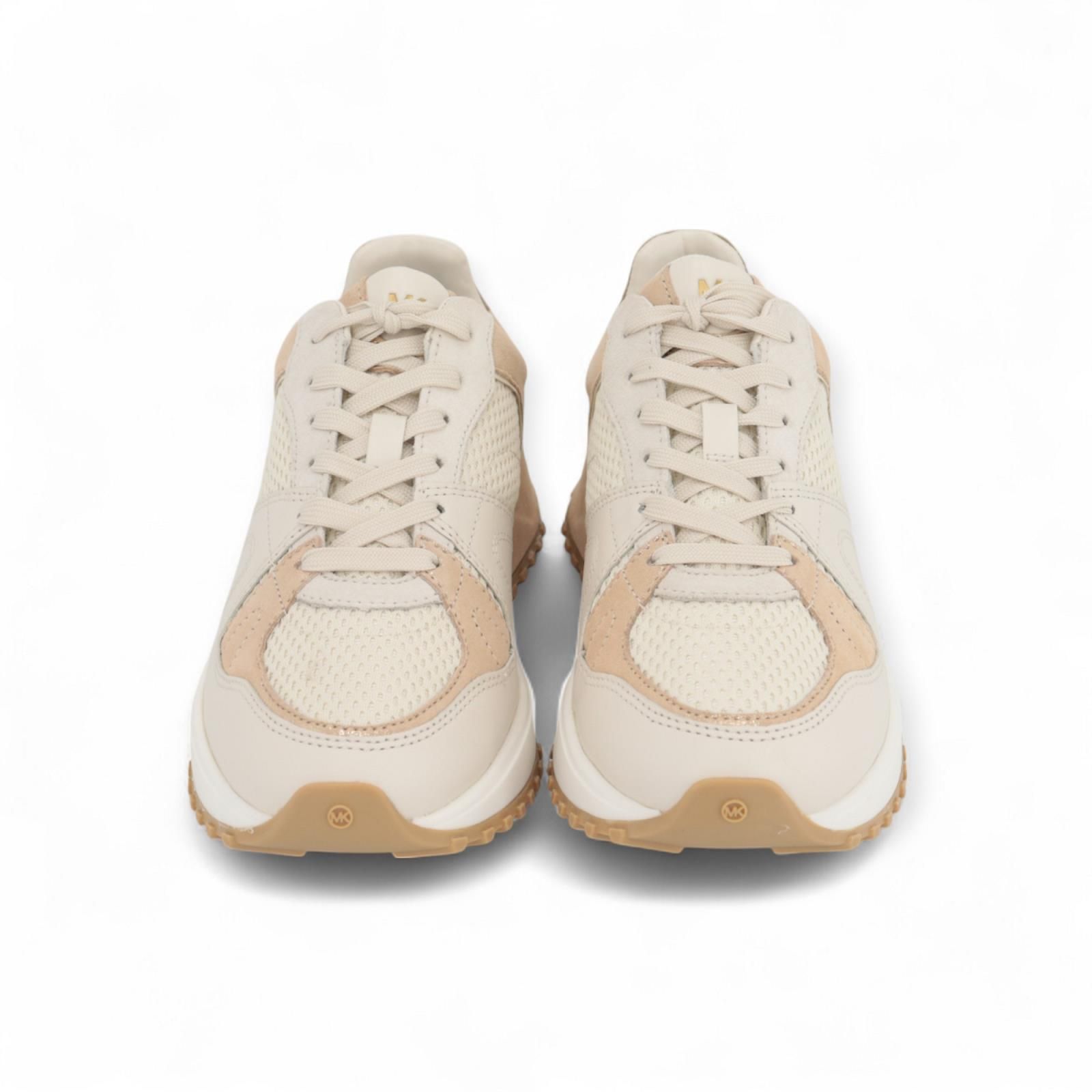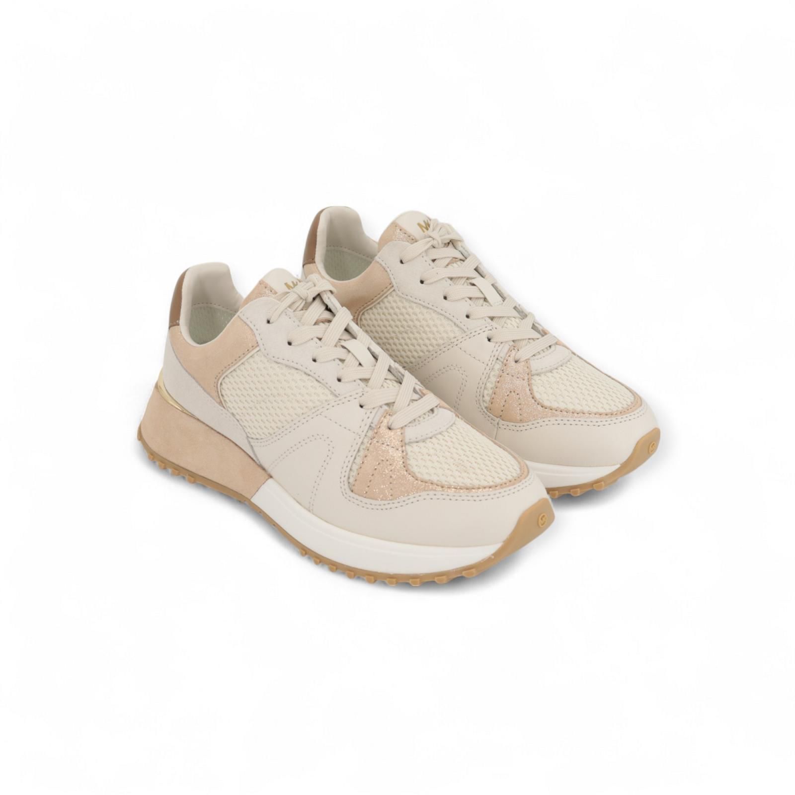 Sneaker Jaime van Michael Kors voor dames. Deze sneaker is in off wit met gouden accenten en een camel hielflap. De mix van suède, mesh en leer creeert een luxueuse look met een sportieve stijl. Heeft een plateauzool met shining goud en wit die voor de perfecte afwerking zorgt. De binnenzool is uitneembaar.