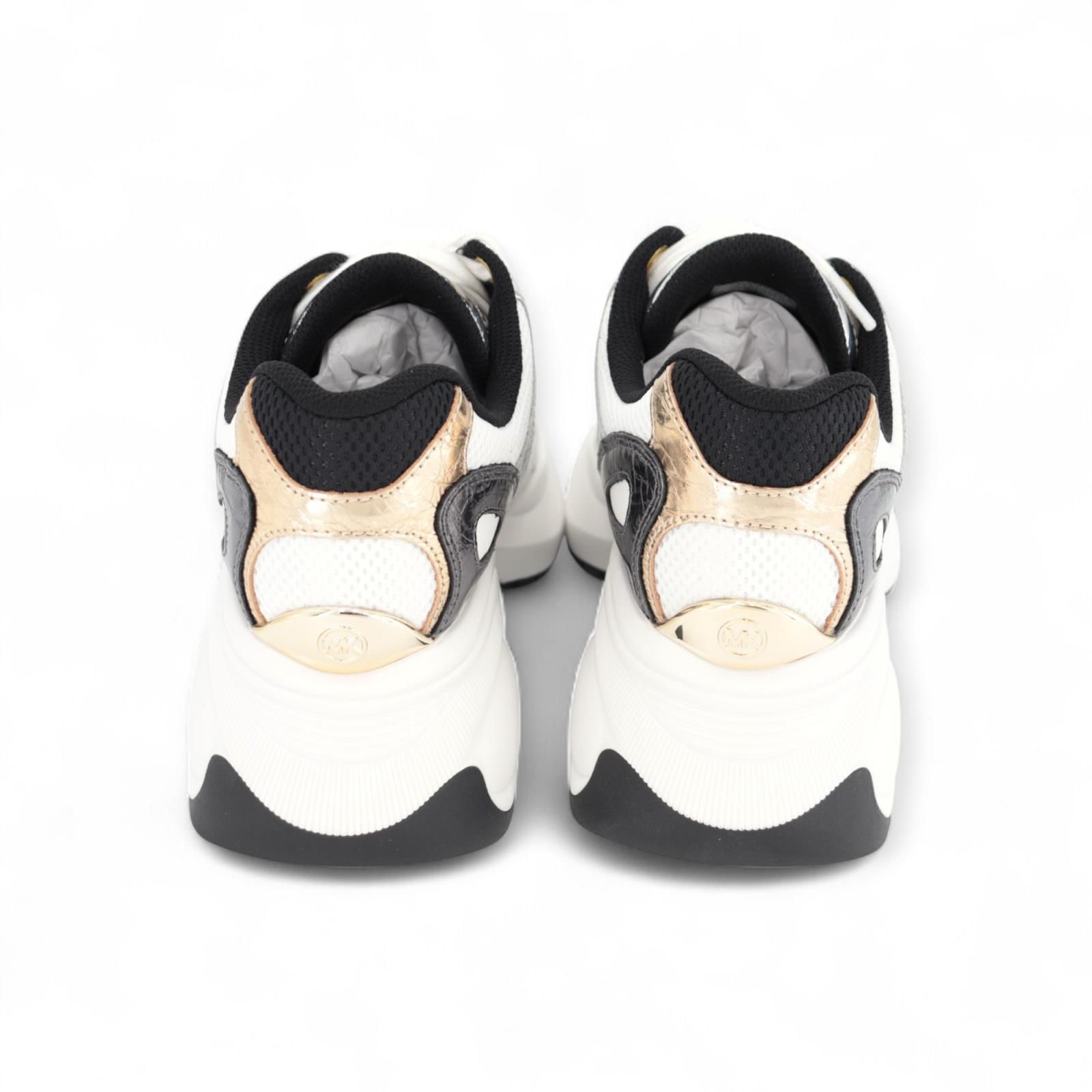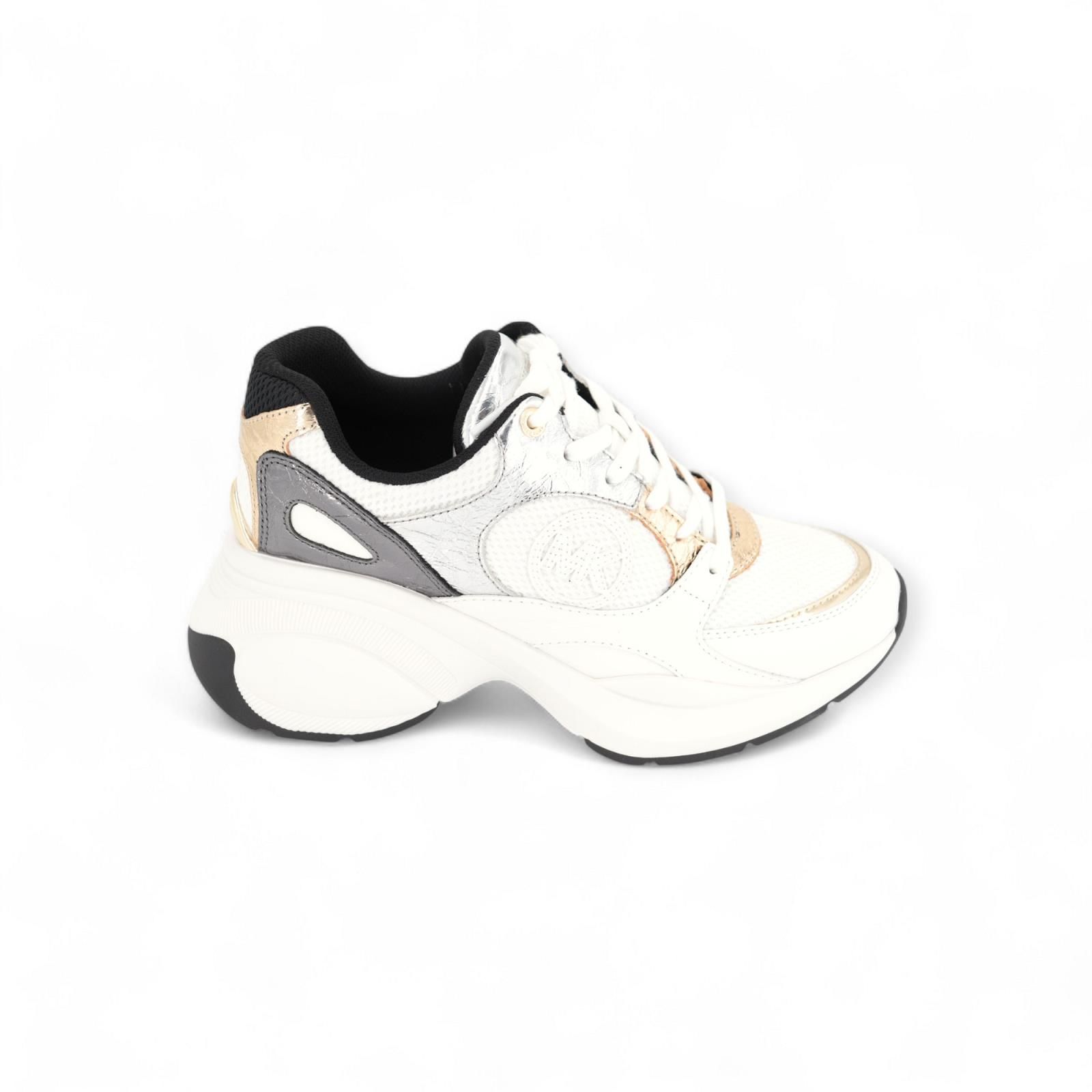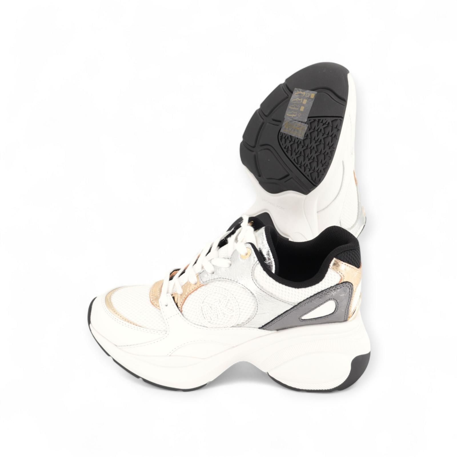 De sneaker Zuma Trainer van Michael Kors voor dames valt graag op. Dit model wordt gekenmerkt door een opvallende mix van metallic craquelé leer met kleurvlakken van wit zwart en goud. Inzetstukken van mesh en heeft een opvallende rubberen zool. Draag deze sneakers voor een onverwachte combinatie met een oversized blazer en broek.