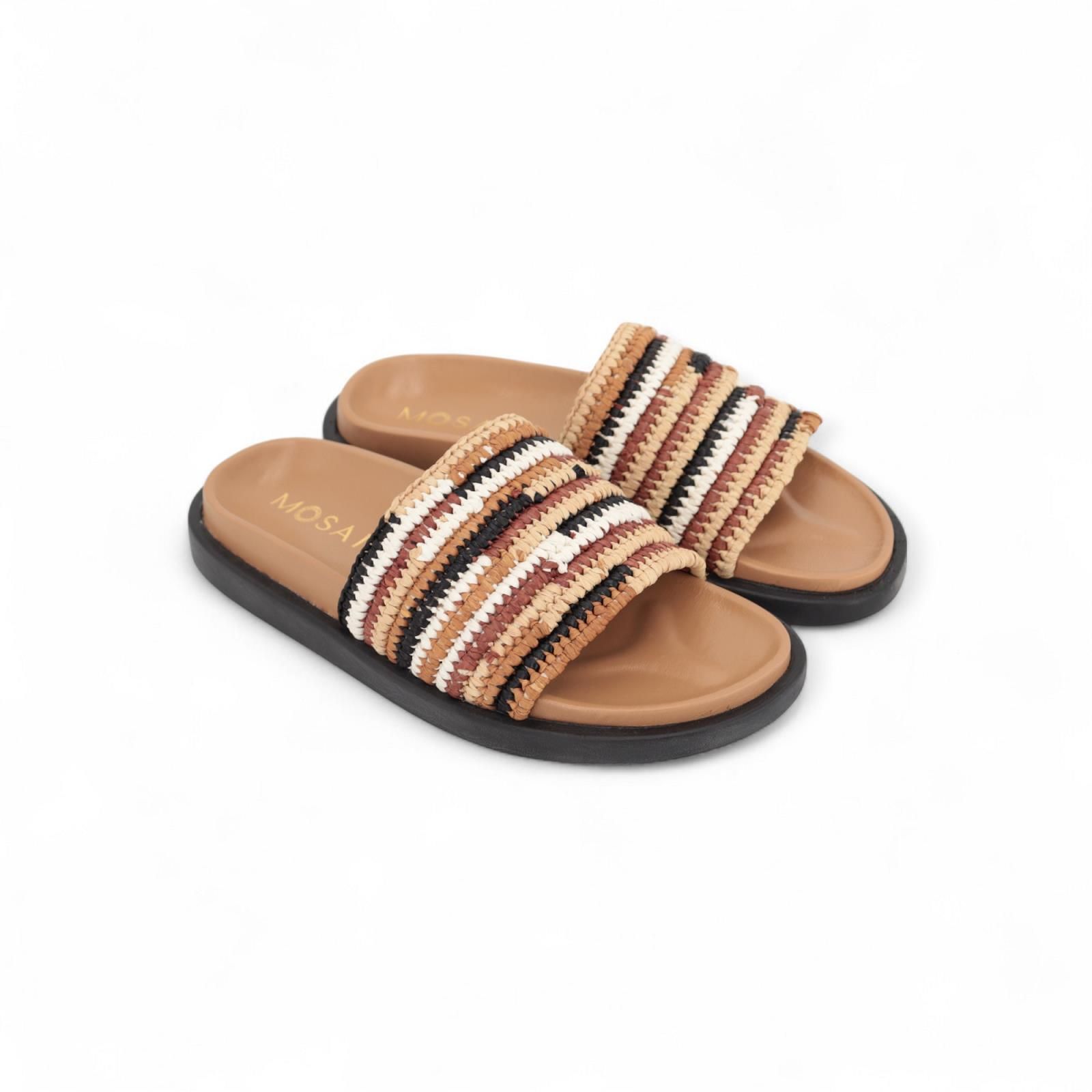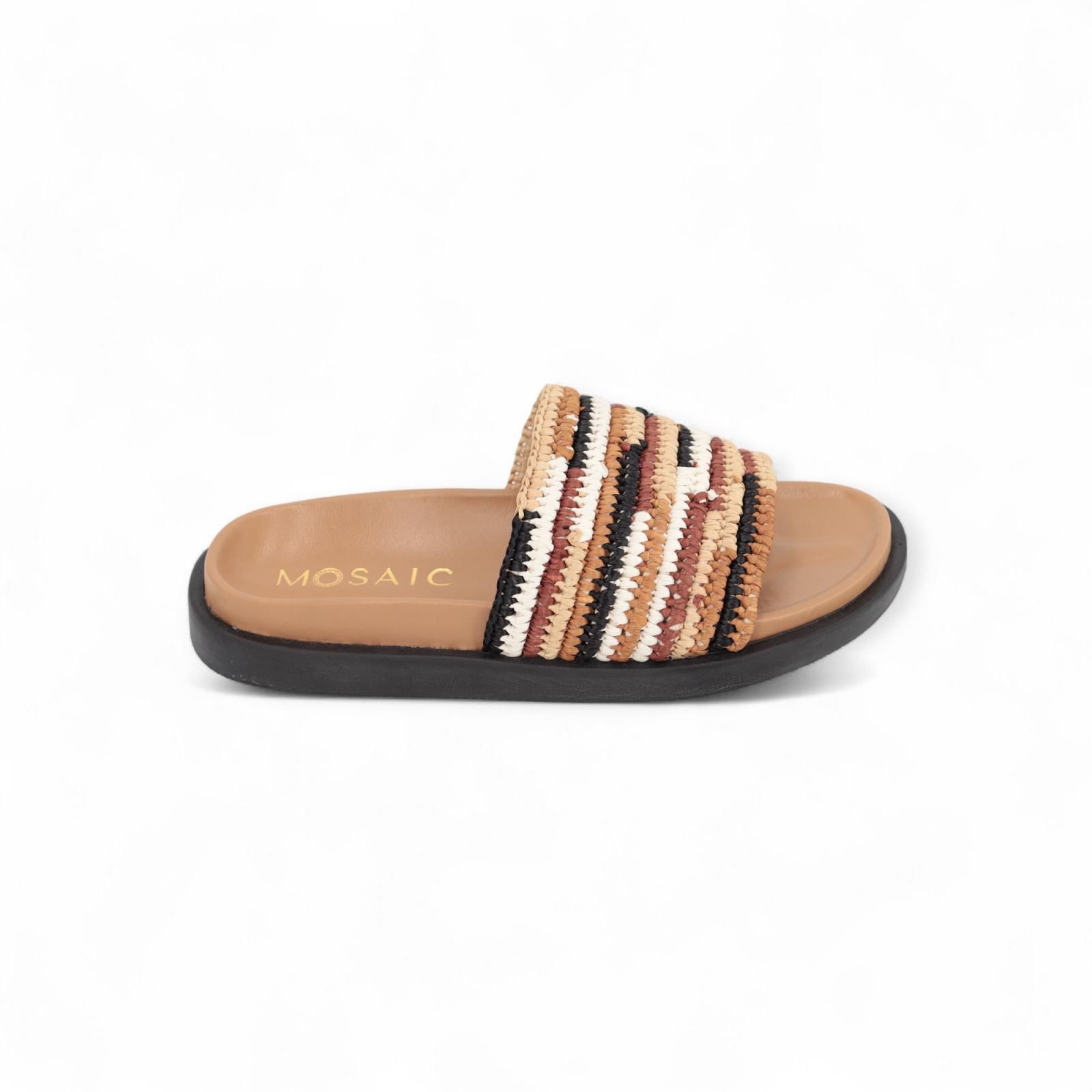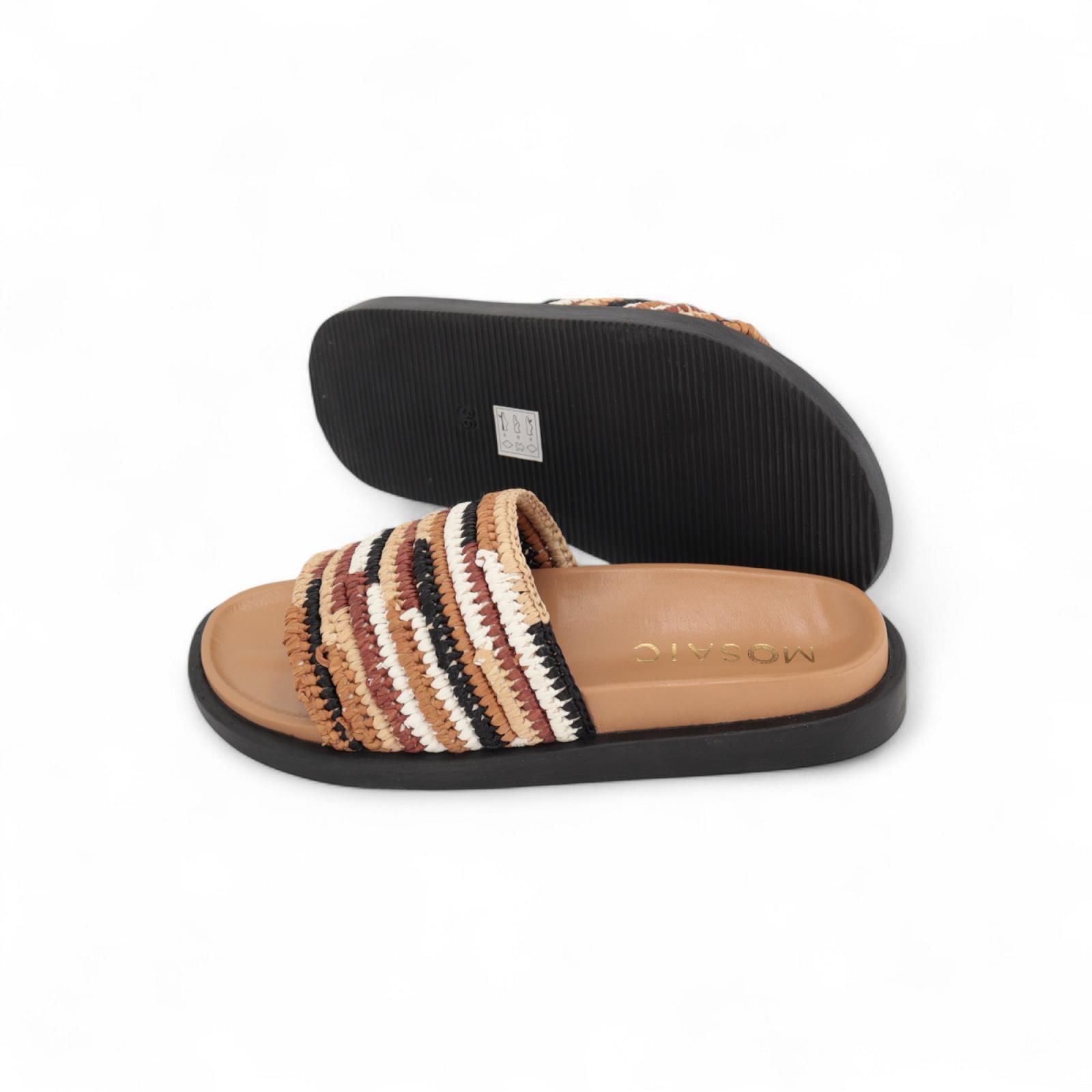 Slipper van Mosaic voor dames. Deze slipper is in raffia gevlochten aardse kleuren met 1 band over de wreef. Is op een aangenaam voetbed met een dikke zwarte zool.