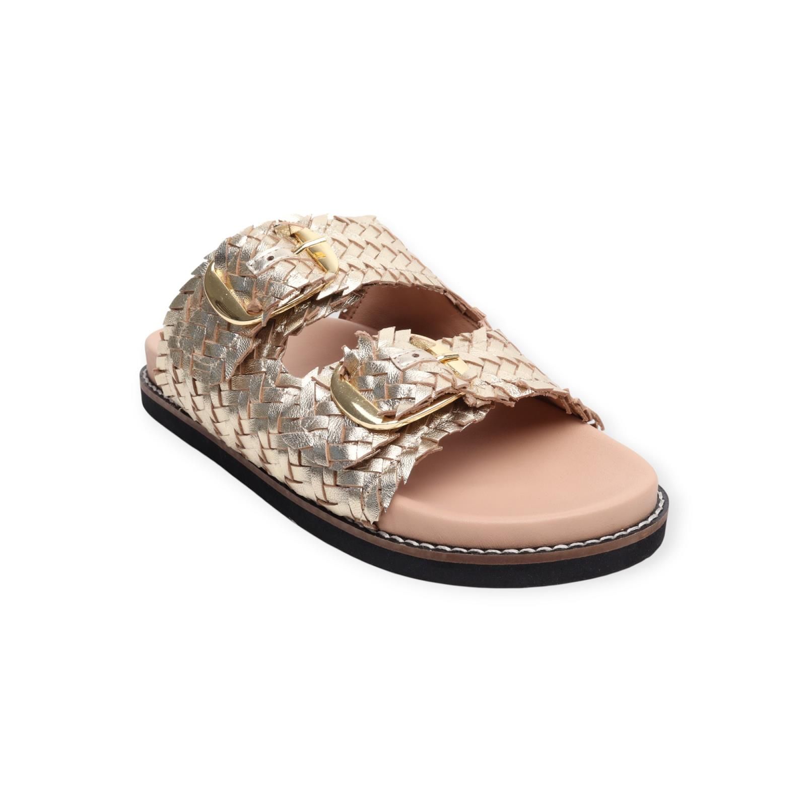 Slipper Knot Mosaic voor dames. Deze slipper is in gouden tressé met 2 gespsluitingen. Heeft een aangenaam voetbed in goud leder.