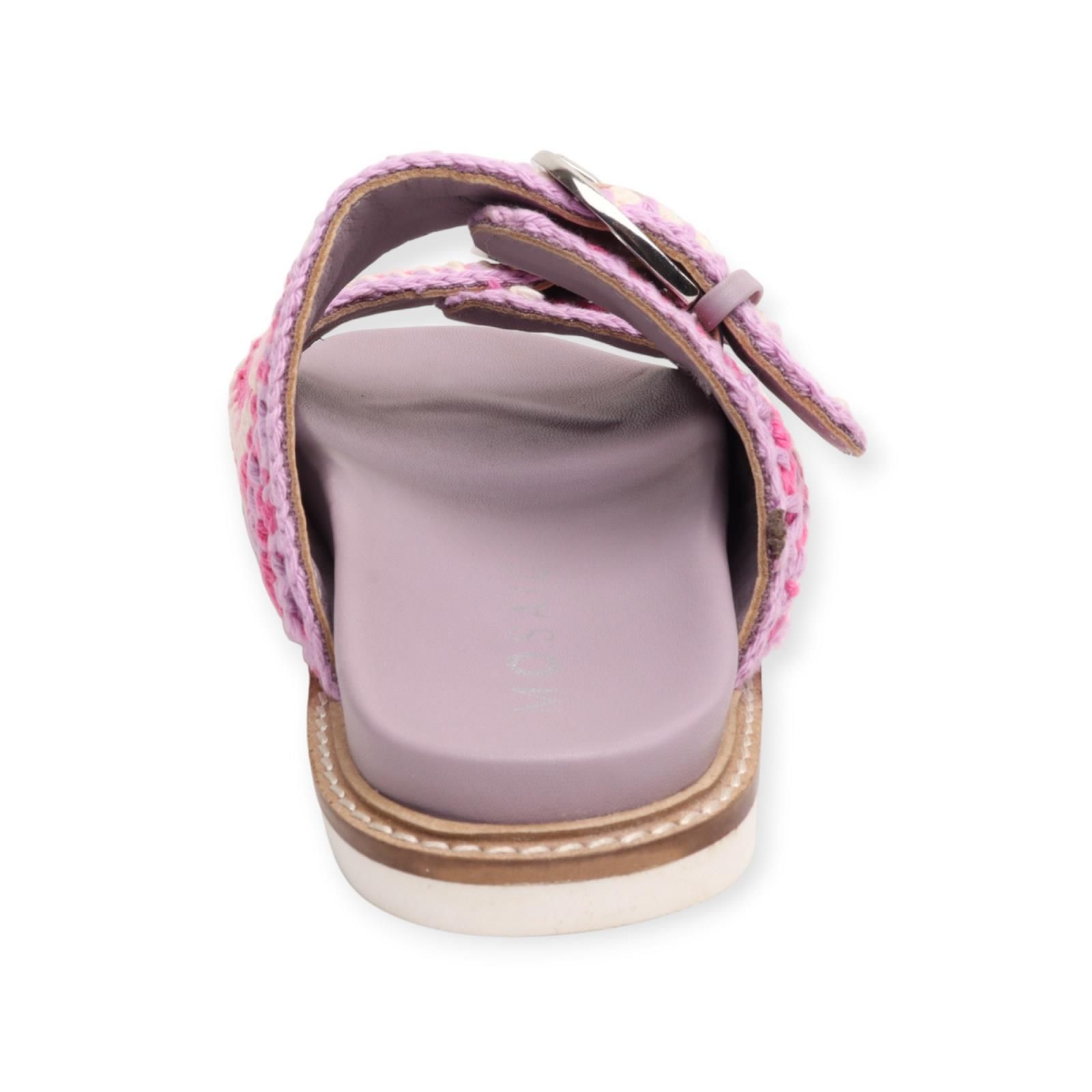 Slipper Myrina van Mosaic voor dames. Deze slipper is in lila tinten geweven stof met 2 gespen op de wreef. Heeft een aangenaam voetbed in lila leder en een witte buitenzool.