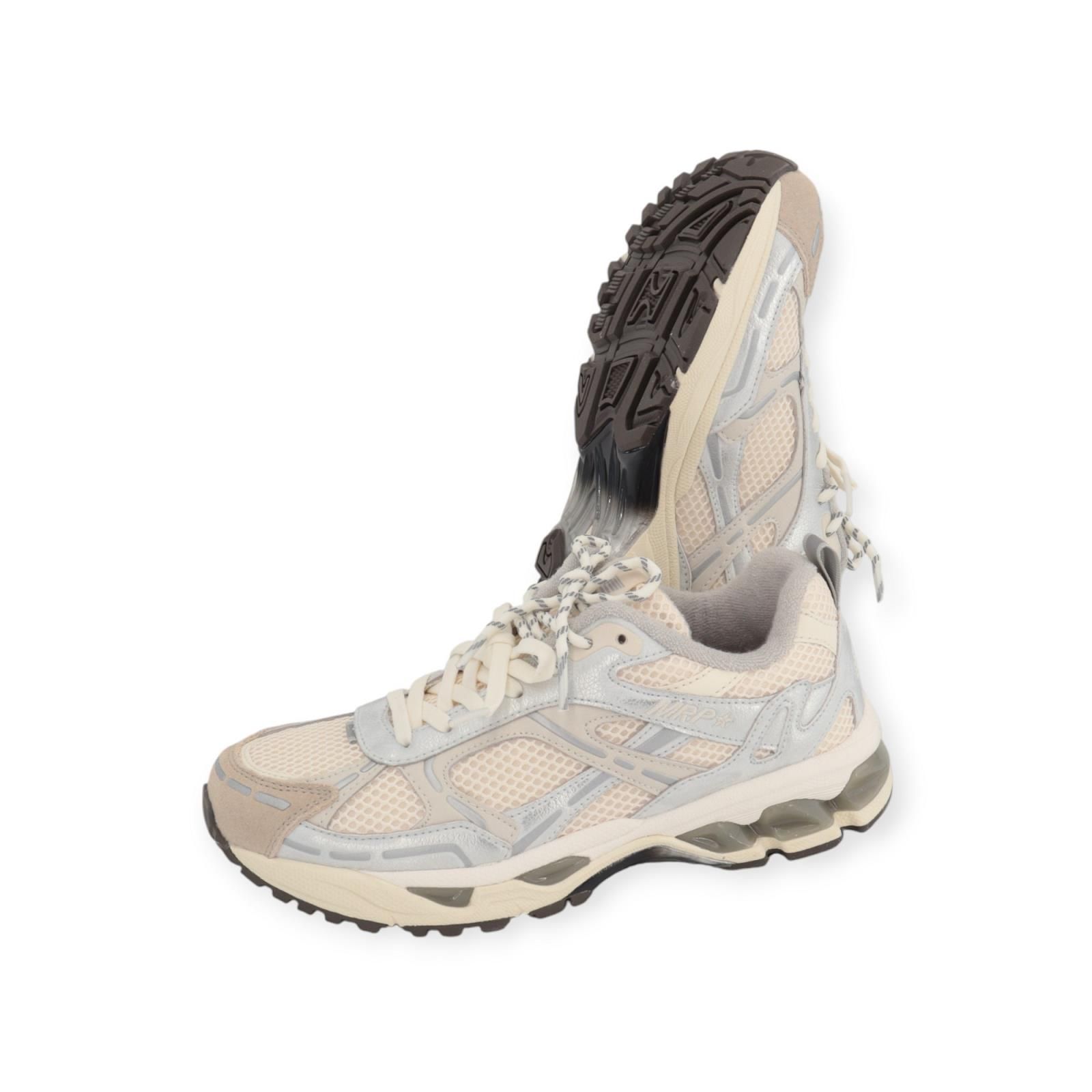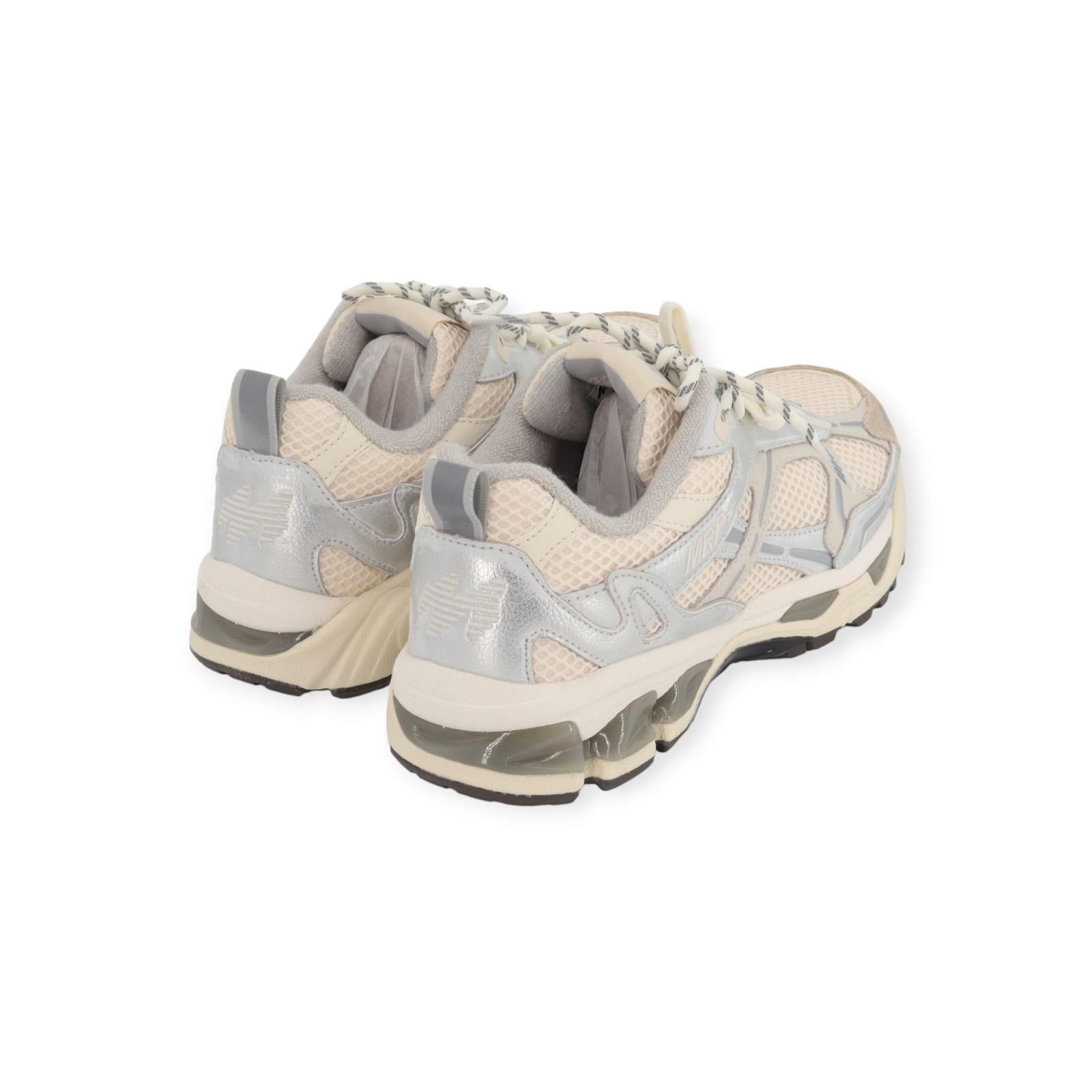 Sneaker Melrose V.2 van MRP star voor dames. Deze runner is in offwit mesh met zilver metallic leren elementen en beige suède. 2 soorten elastieken veters en een opvallende zool maken deze sneakers tot een musthave voor je dagelijkse look! De binnenzool is uitneembaar.