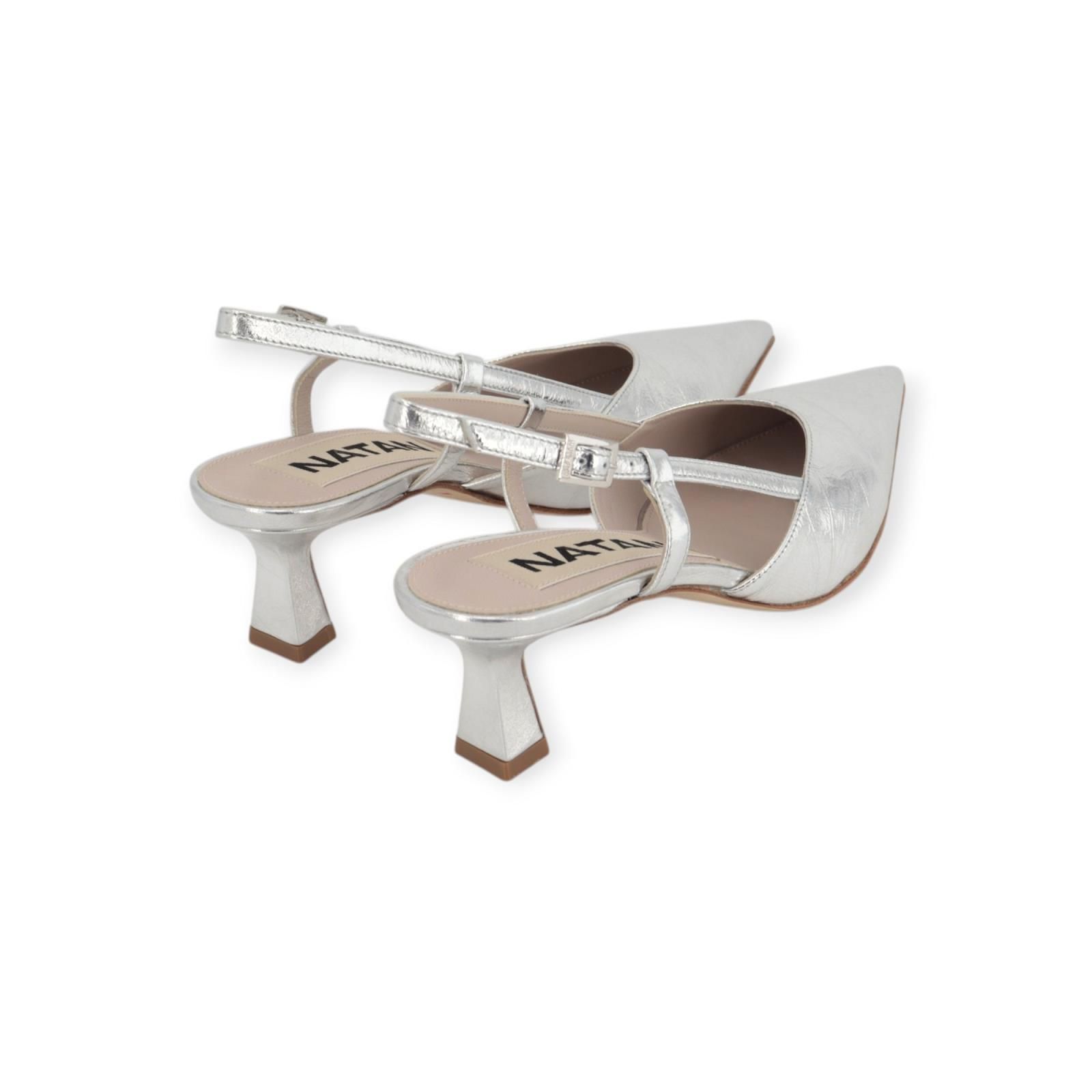 Pump N4108 van Natan voor dames. Dit elegant slingback model is in zilver shining leer. Heeft een scherpe neus met een open hieltje. Blijft mooi vast aan de hiel door het leren bandje met gouden gespsluiting. Heeft een elegant fijn hakje van 5cm hoog.