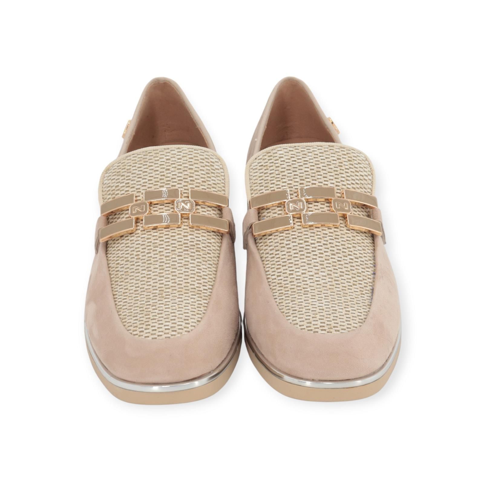 Mocassin van Nathan-Baume voor dames. Deze mocassin is in nude suède met een beige raffia neus. Is afgewerkt met een boekel over de wreef in goud, taupe kleur. Heeft een aangename microzool omrand met zilver.