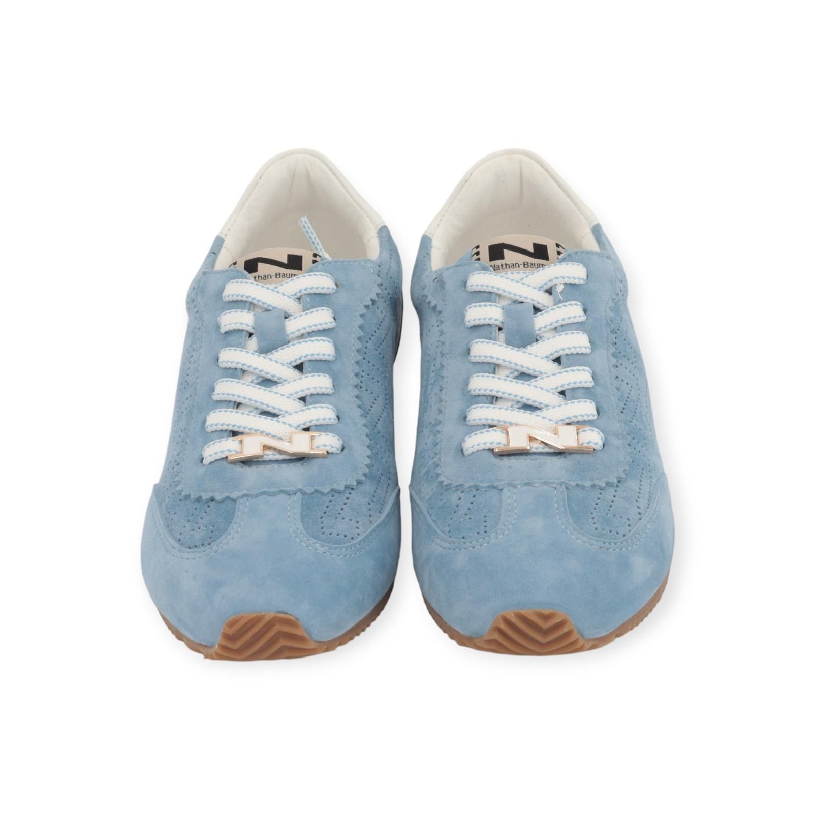 Sneaker van Nathan – Baume voor dames. Deze lage sneaker is in lichtblauw suède. Is mooi gekarteld rond de veters en afgewerkt met licht geperforeerde N logo’s langs de zijkant. Heeft achteraan een offwit hielflap. Is op een lage zool met een uitneembare binnenzool.