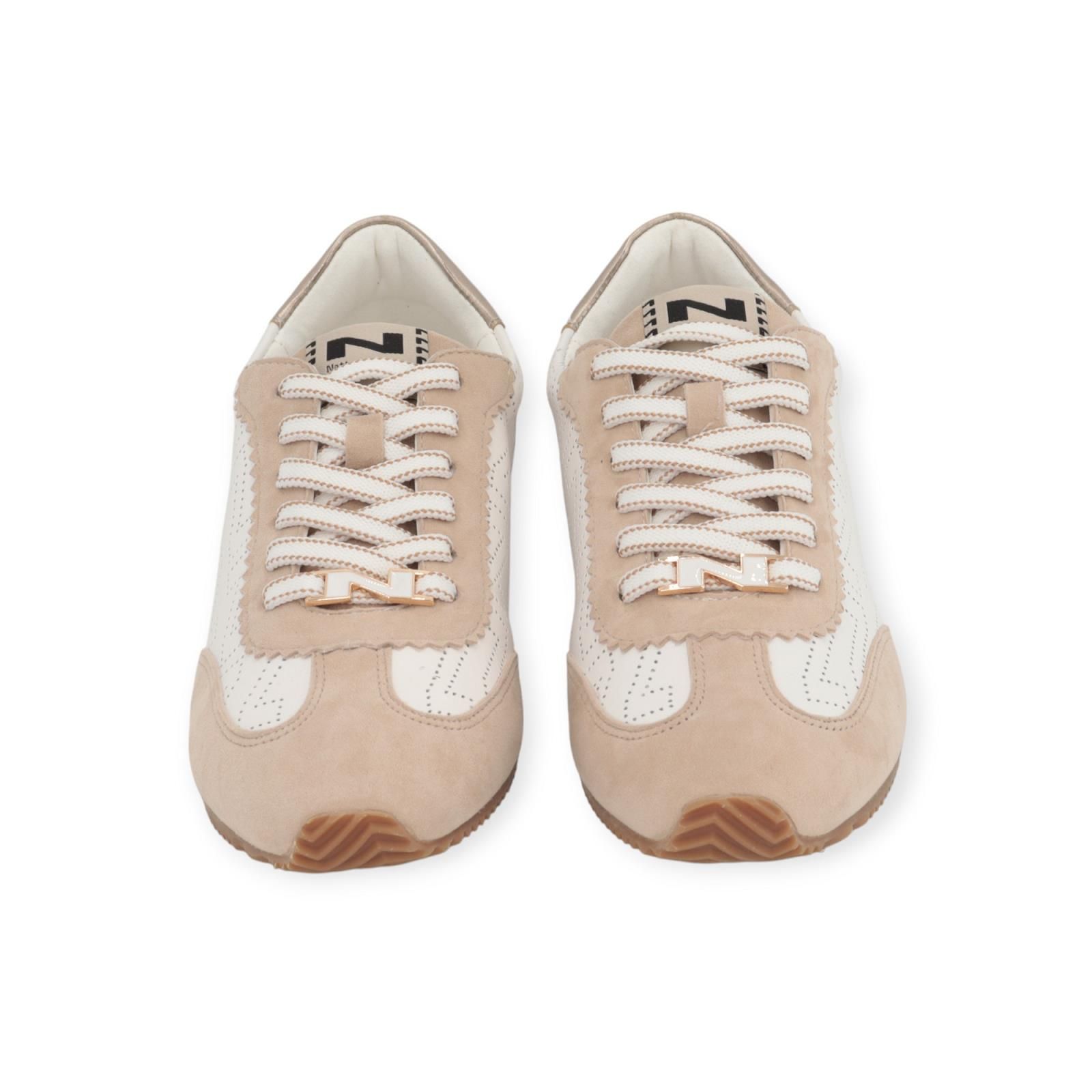 Sneaker van Nathan – Baume voor dames. Deze lage sneaker is in wit leer met beige suède. Is mooi gekarteld rond de veters en afgewerkt met licht geperforeerde N logo’s langs de zijkant. Heeft achteraan een gouden hielflap. Is op een lage zool met een uitneembare binnenzool.