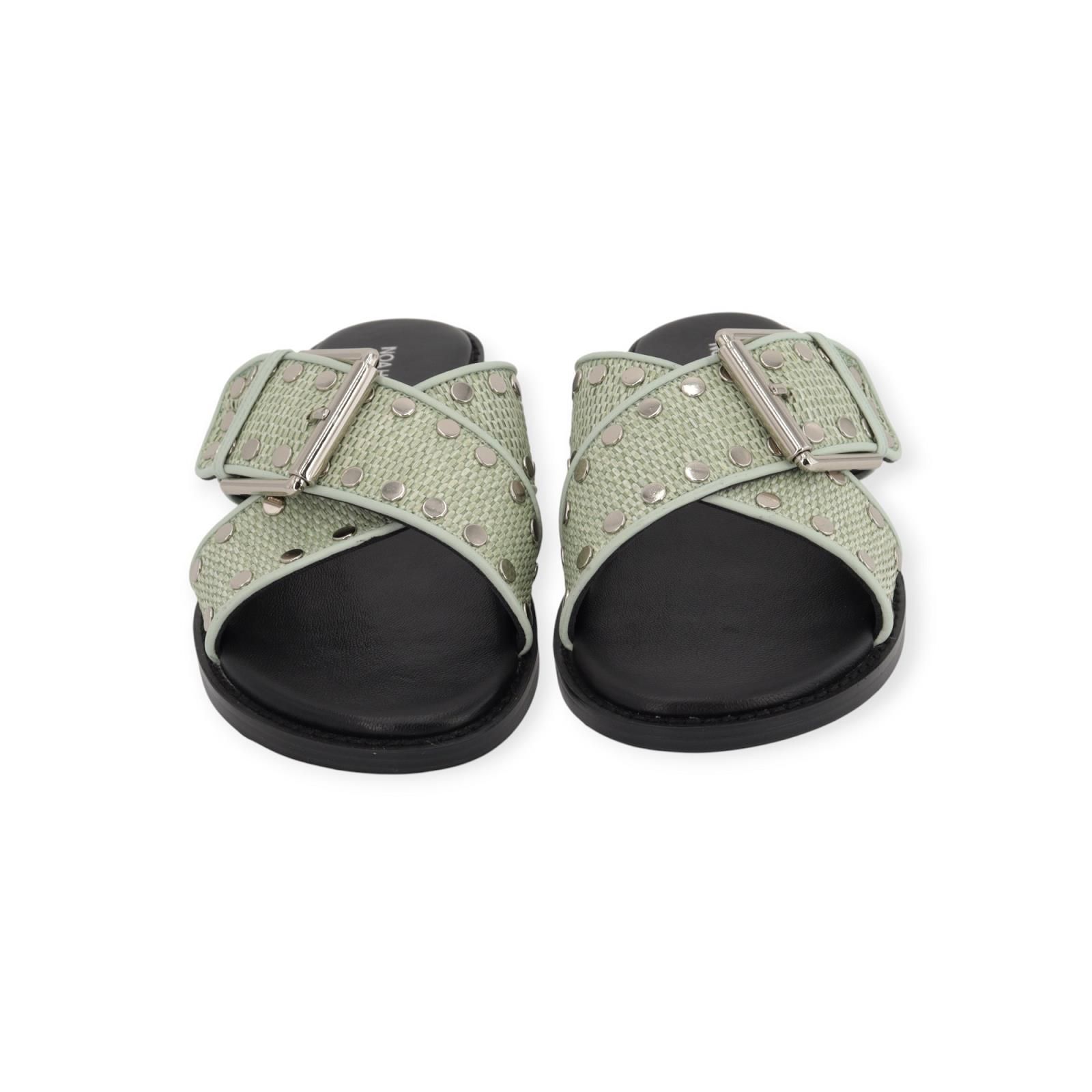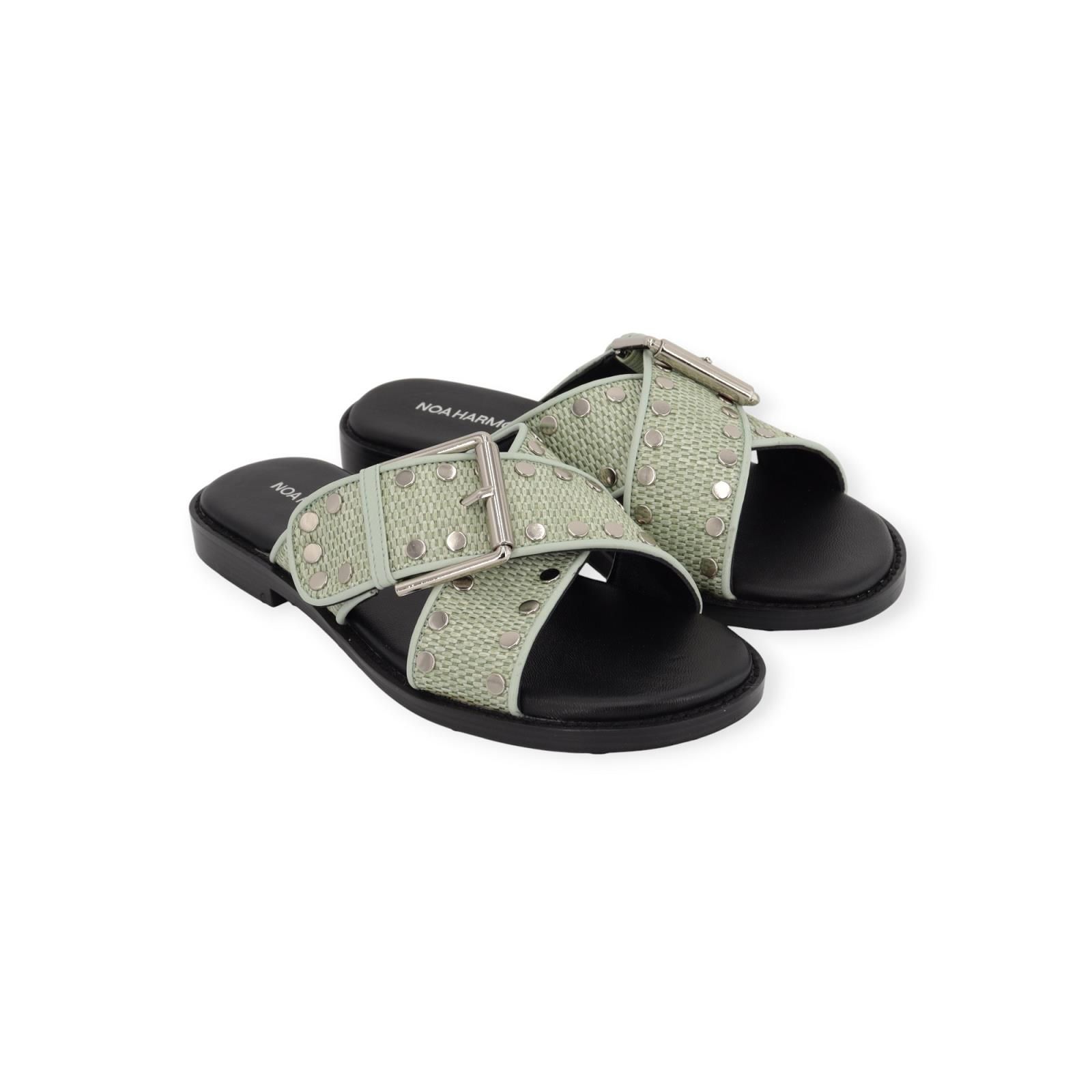 Slipper Faro van Noa Harmon voor dames. Dit elegant muiltje is in zwart leer. Heeft een gekruiste band over de wreef in groen raffia met leer. Afgewerkt met metalen studs en gespsluiting. Is op een donkere antislipzool.