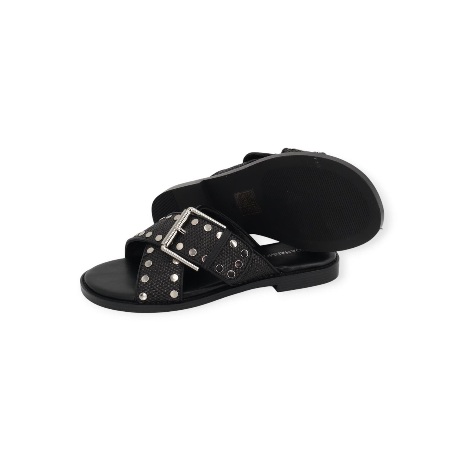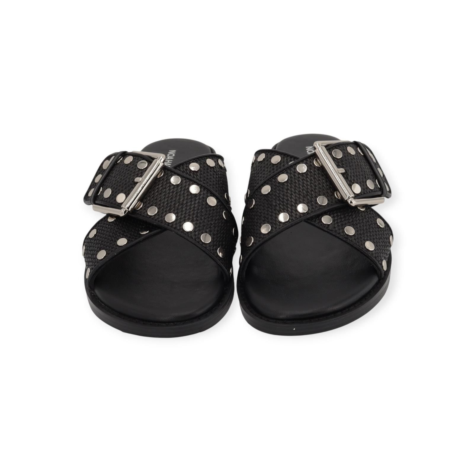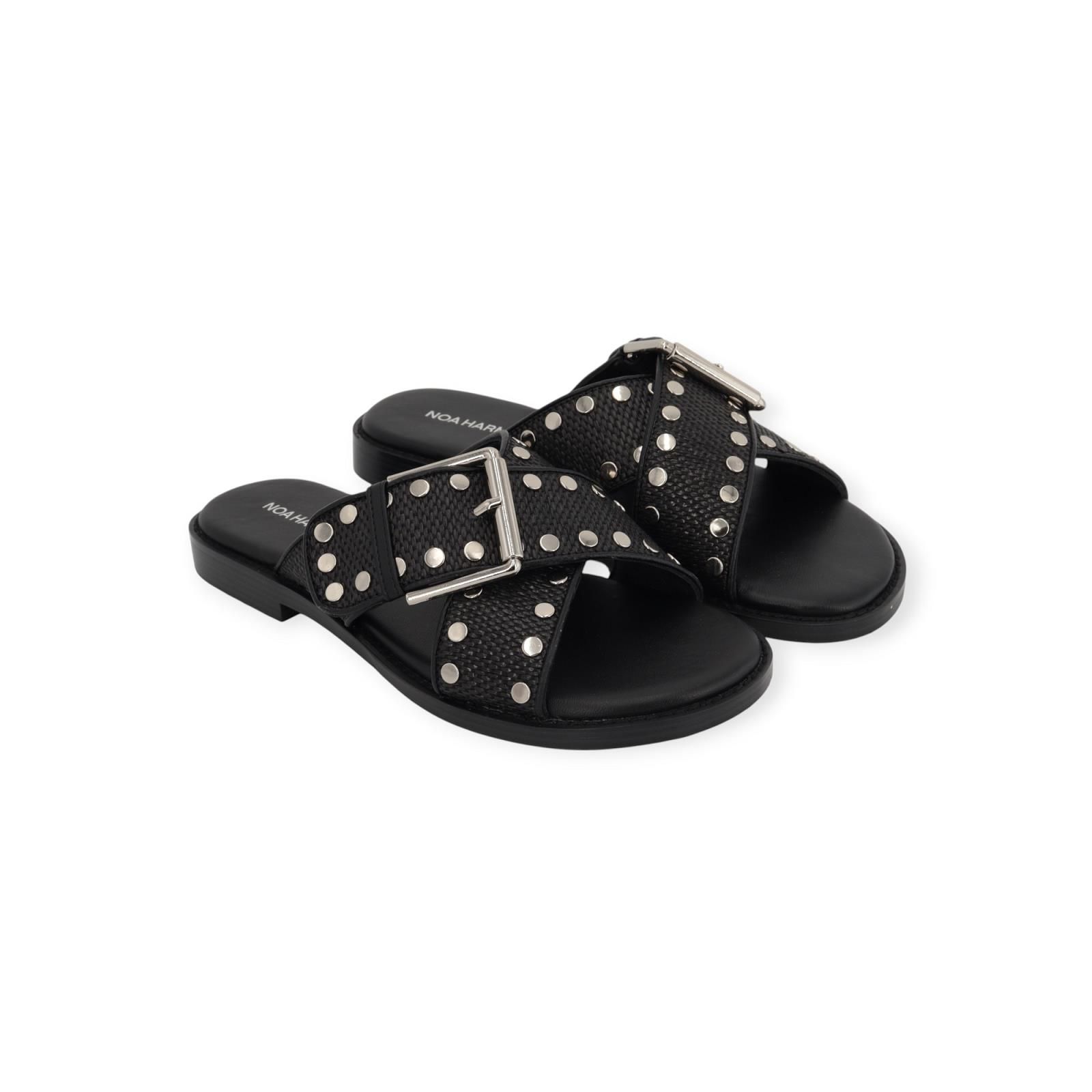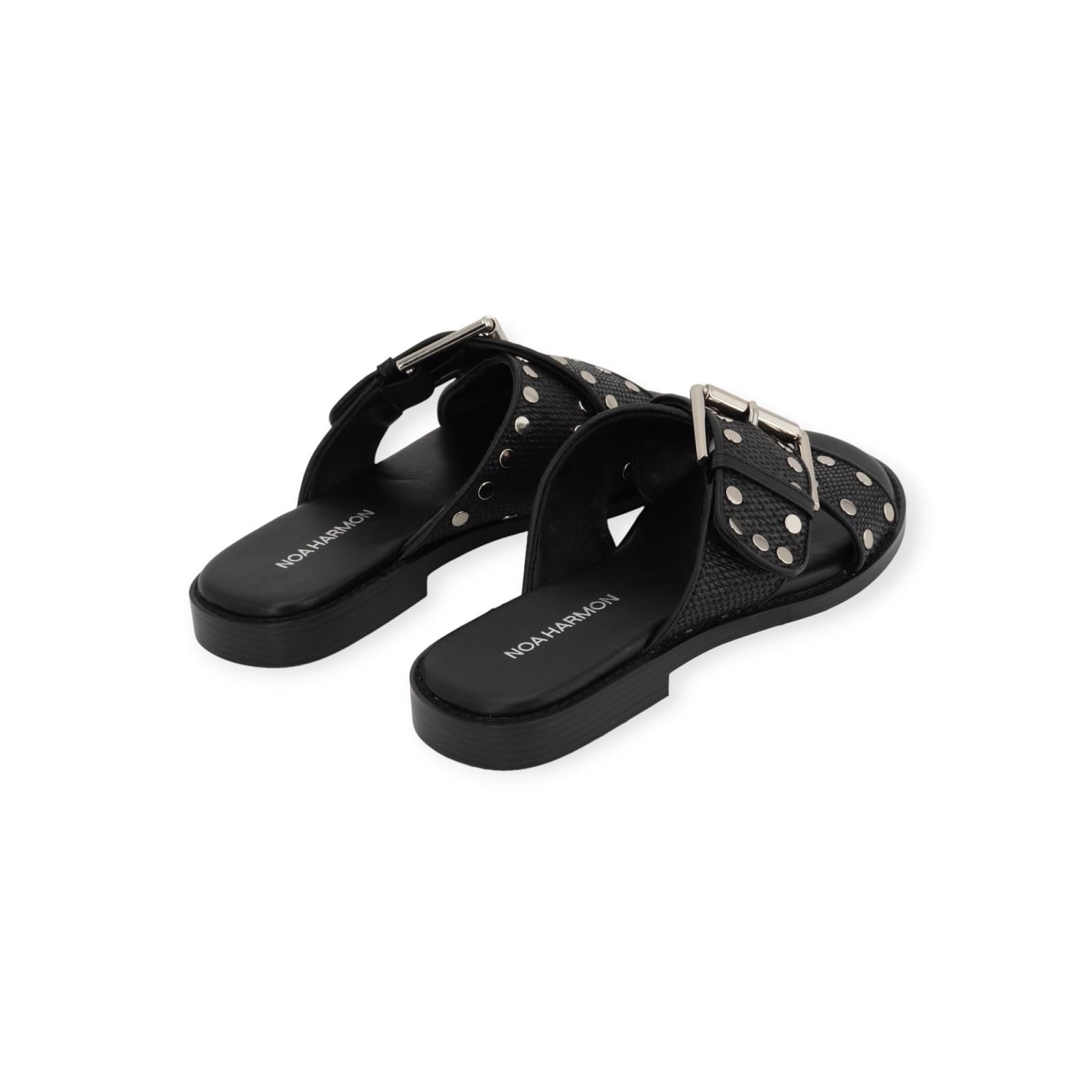 Slipper Faro van Noa Harmon voor dames. Dit elegant muiltje is in zwart leer. Heeft een gekruiste band over de wreef in zwart raffia met leer. Afgewerkt met metalen studs en gespsluiting. Is op een donkere antislipzool.