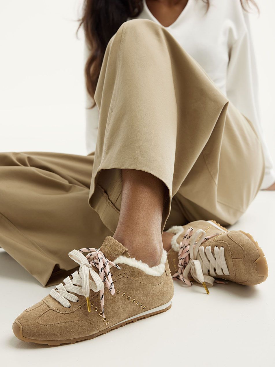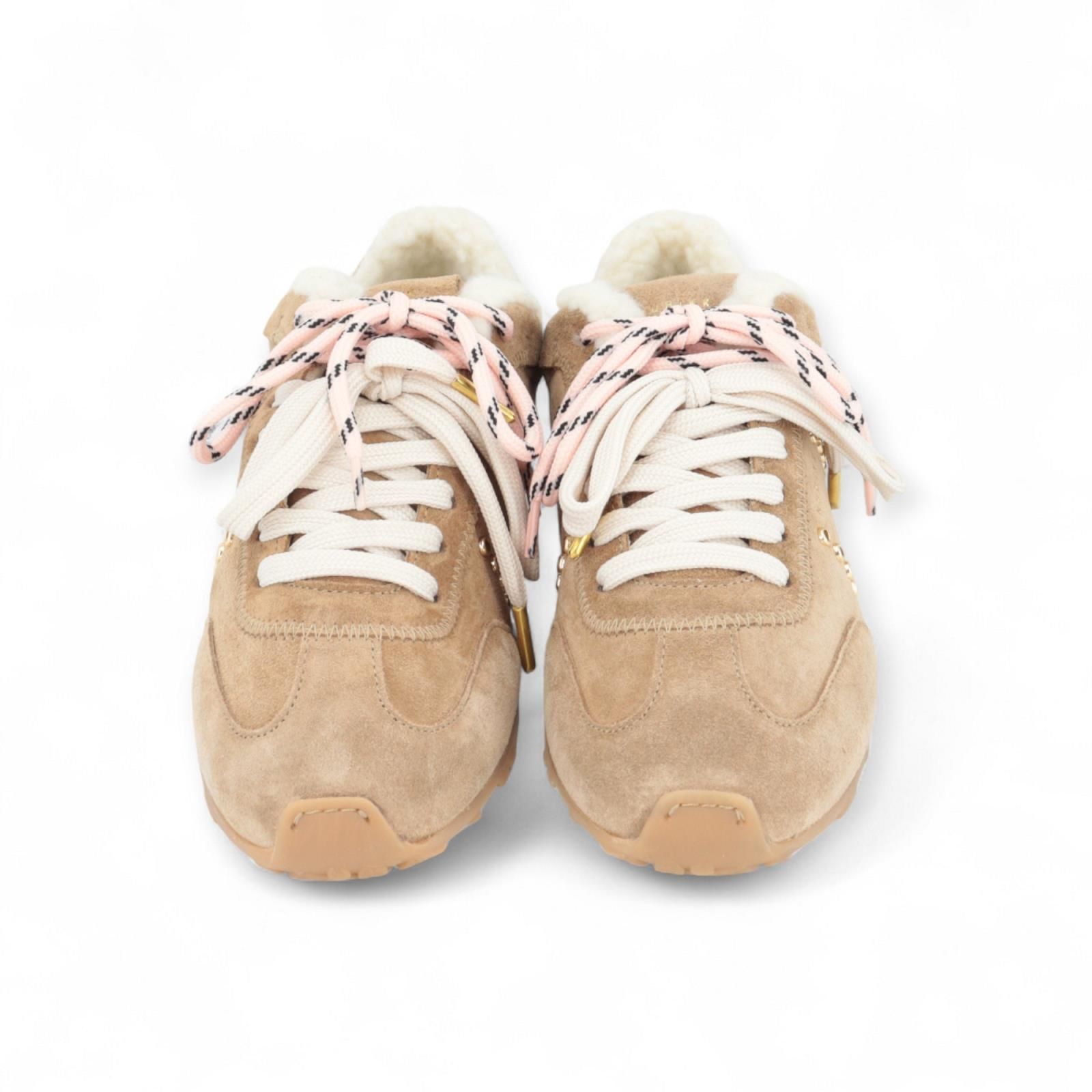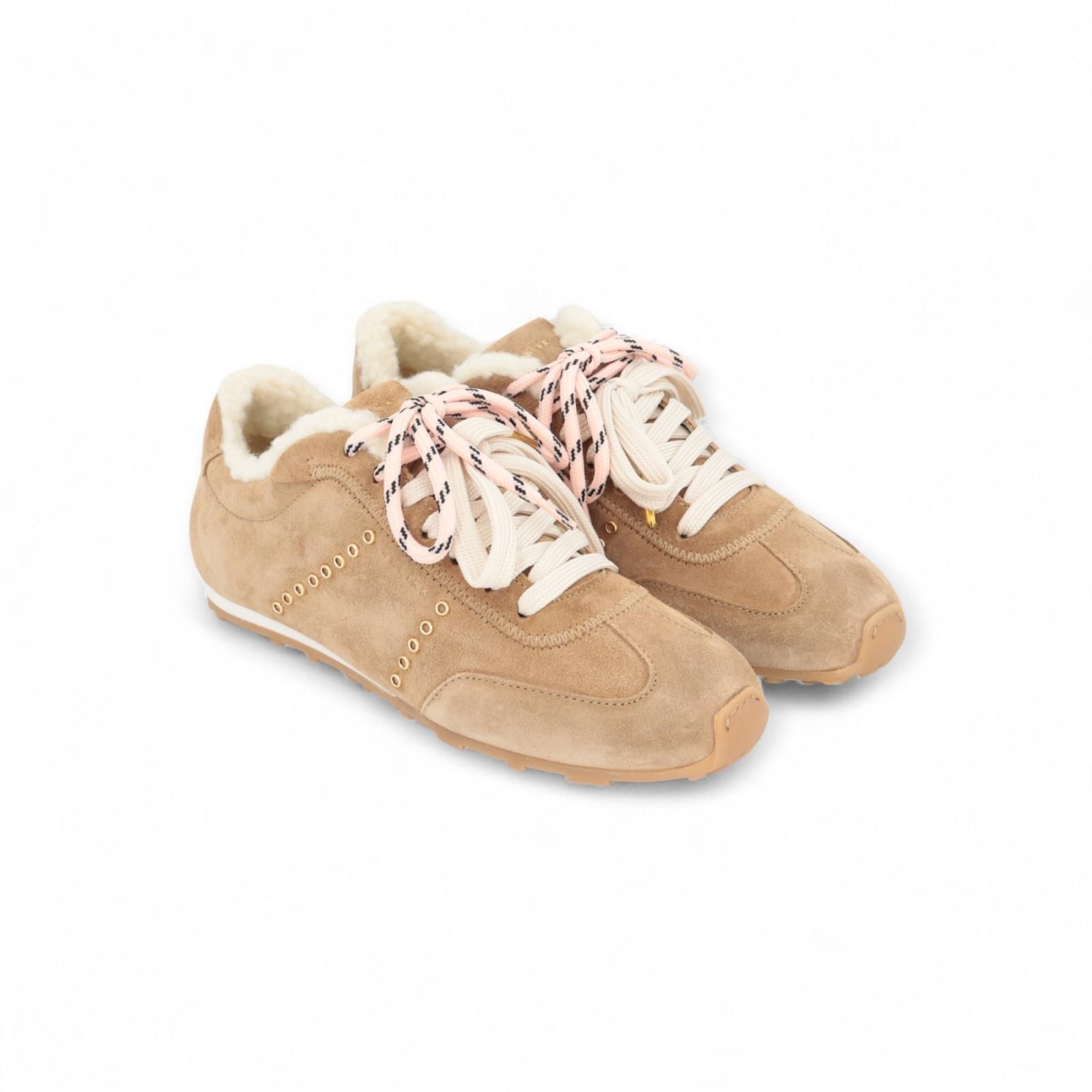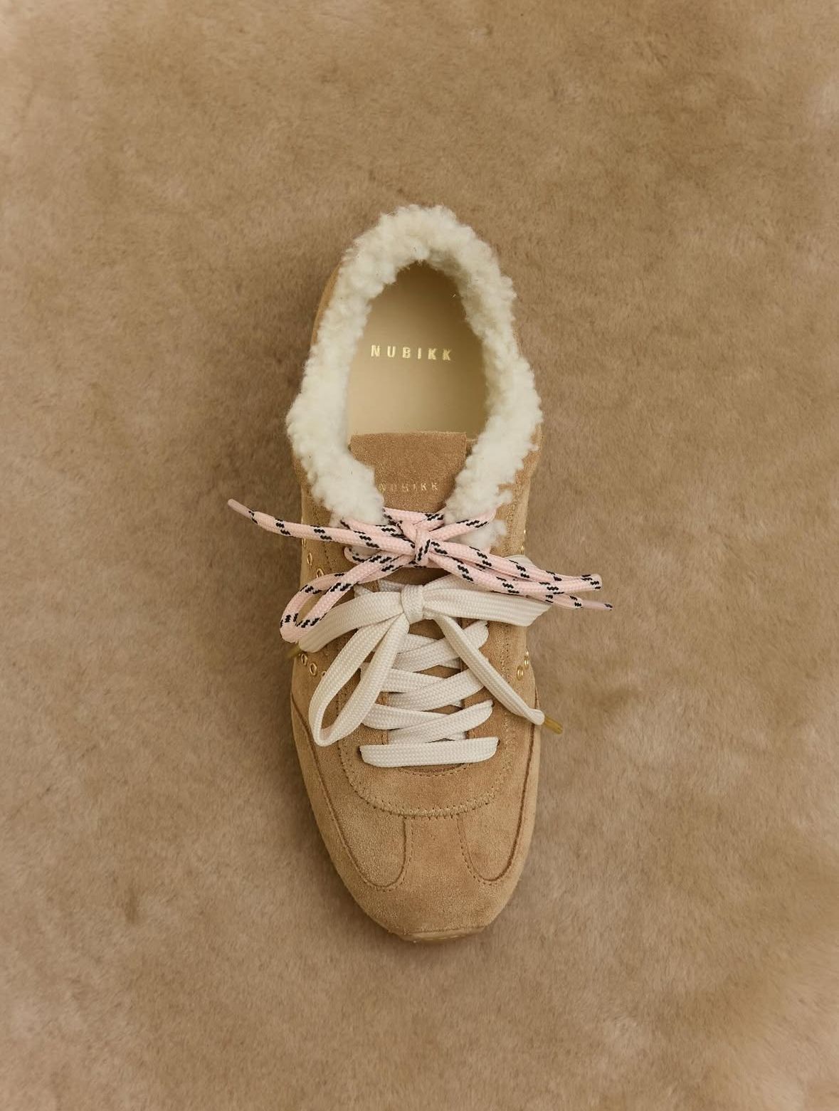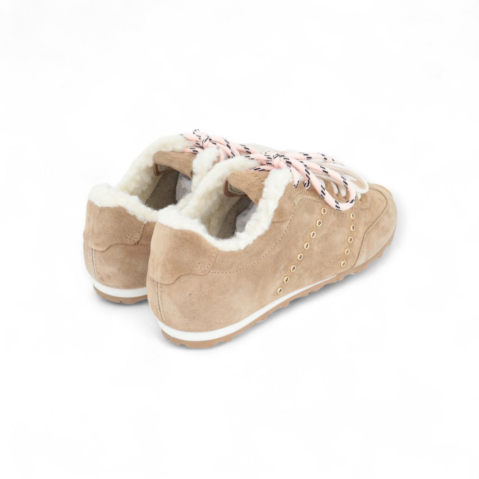 Sneaker Billy Lou Fur van Nubikk voor dames. Deze sneaker is in zand suède (oak kleur) versierd met goudkleurige studs aan de zijkant. Heeft als extra eyecatcher dubbel veters in wit en roze. Het dun zooltje loopt heerlijk en zorgt voor een extra lichtgewicht. De binnenkant is in badstof en zachte wol. De binnenzool is in leer en uitneembaar.