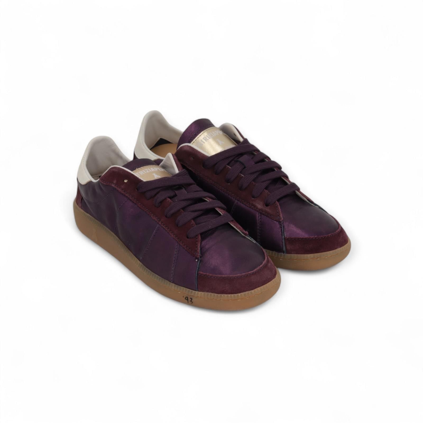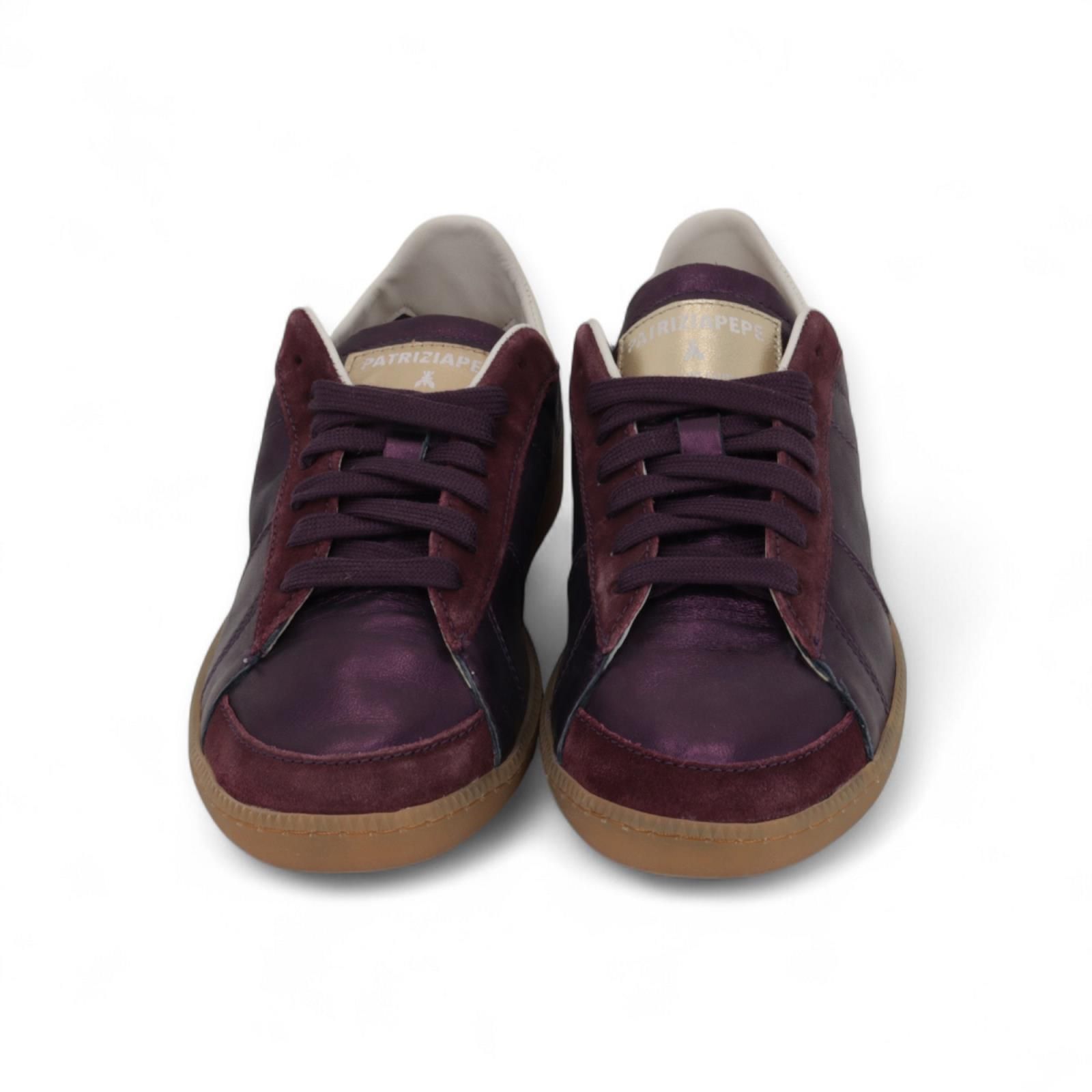 Skin sneakers van Patrizia Pepe voor dames. Deze sneaker is gemaakt van hoogwaardig paars suède leer met een wit lederen hielflap. Heeft een zeer soepele bruine gummyzool met een uitneembare binnenzool.