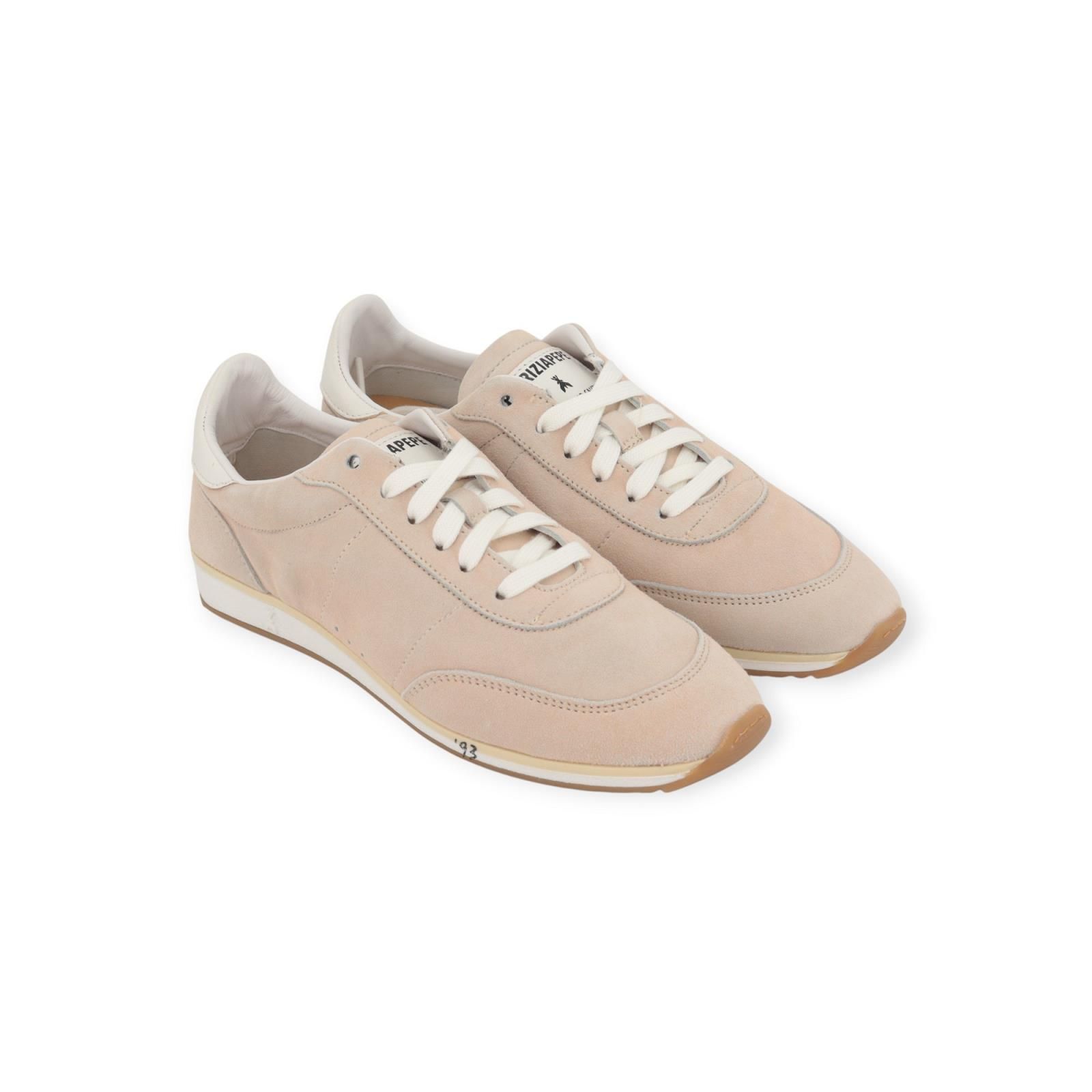 SKIN sneakers van Patrizia Pepe voor dames. Dez sneaker is gemaakt van zacht zand/ roze suède met een wit leren hielflap. Is op een lichte gummy zool die in geel omrand is.