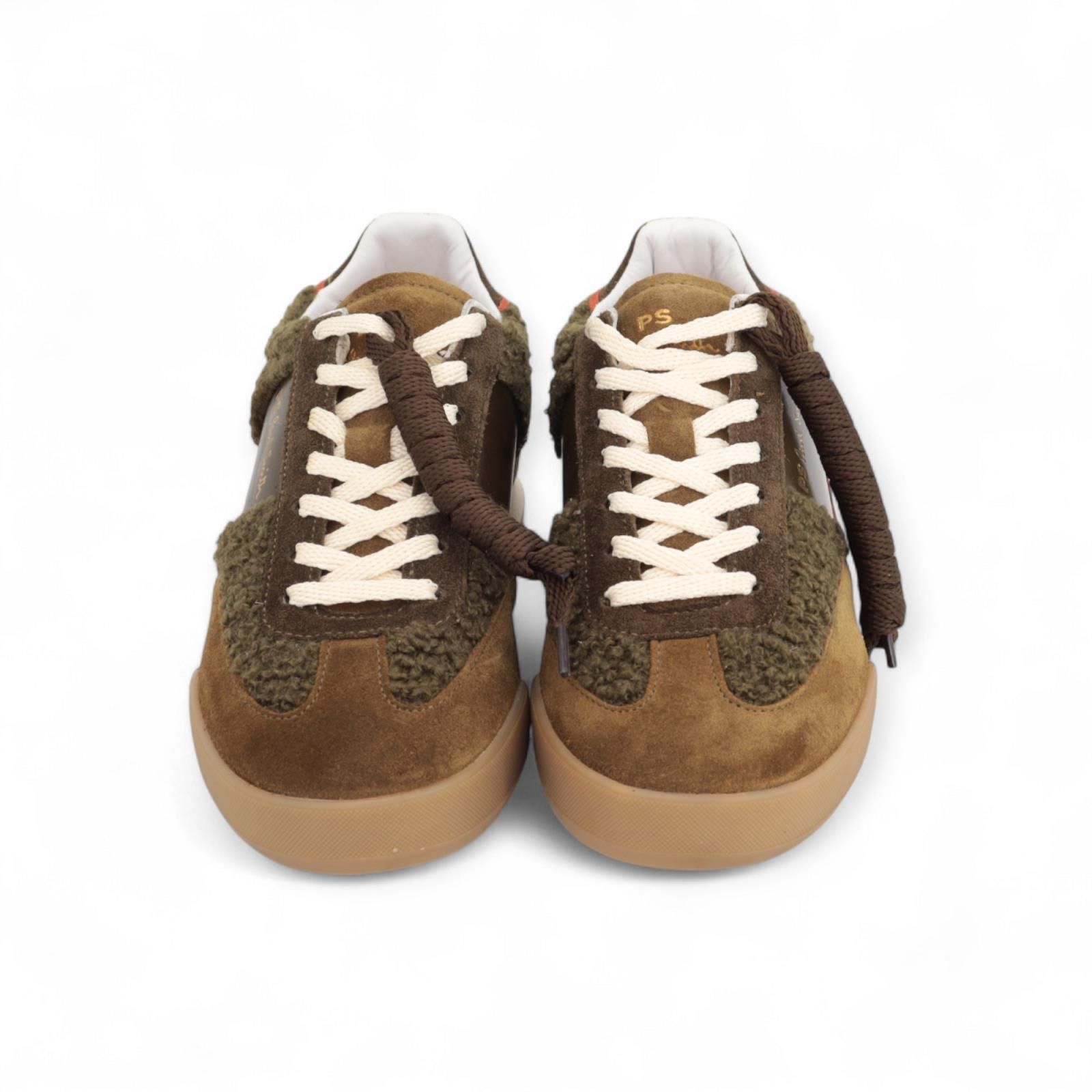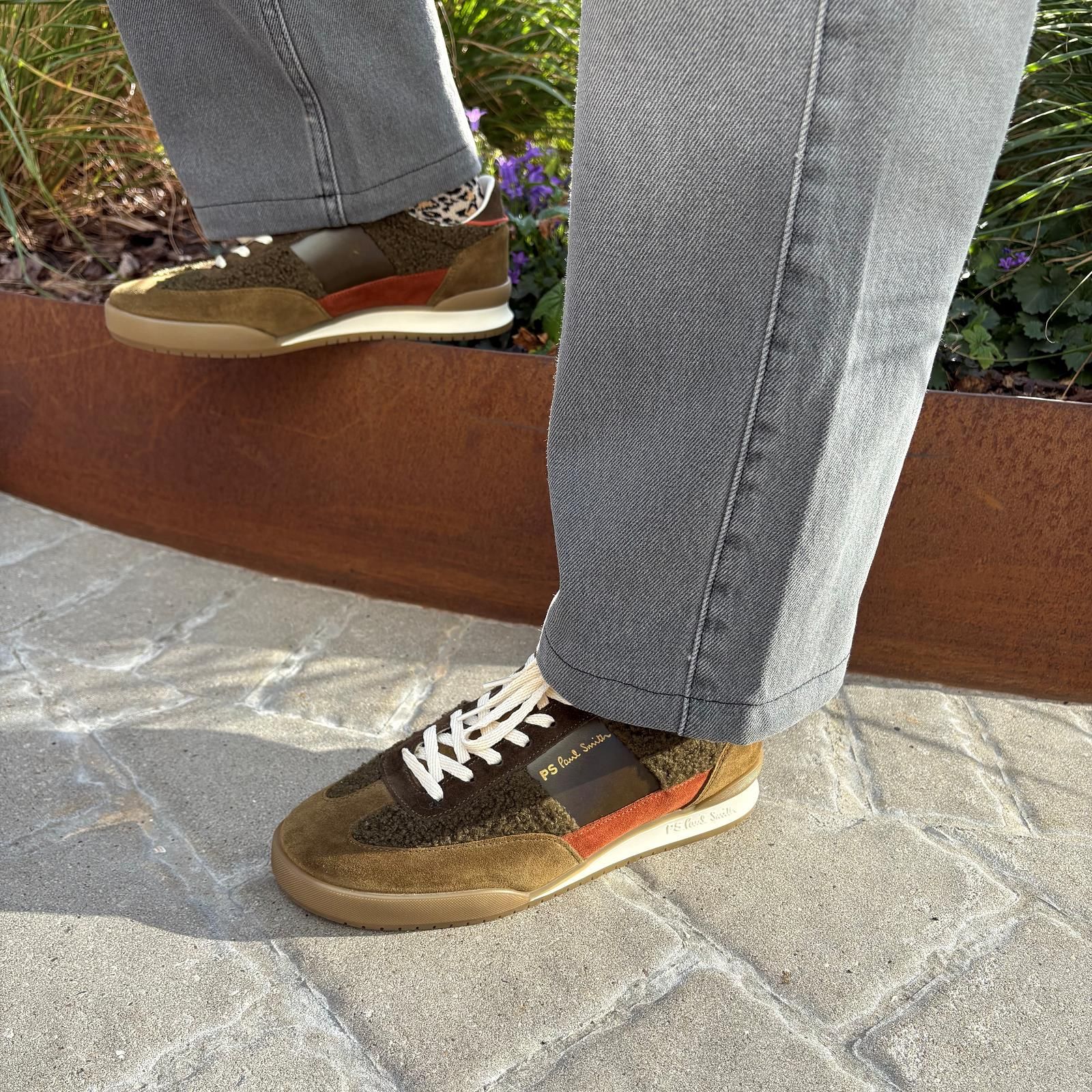 Dover sneaker voor dames van Paul Smith. Sneaker in groen suède met kaki kleurbloktinten en wollen inzetstukken. Is mooi afgewerkt met groene hielflap met PS logo op verwerkt. Op de zool zie je het logo en de naam. Door vintage en moderne elementen samen te voegen zijn deze sneakers echt een eyecatcher. De binnenzool is uitneembaar.