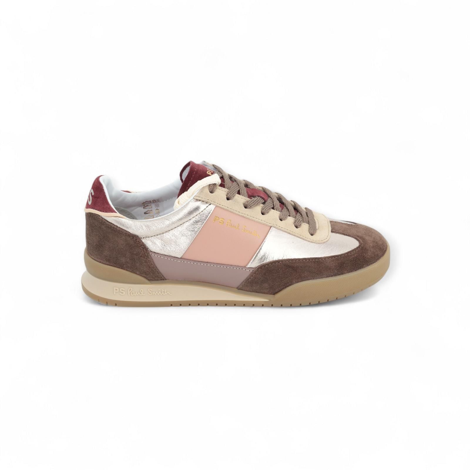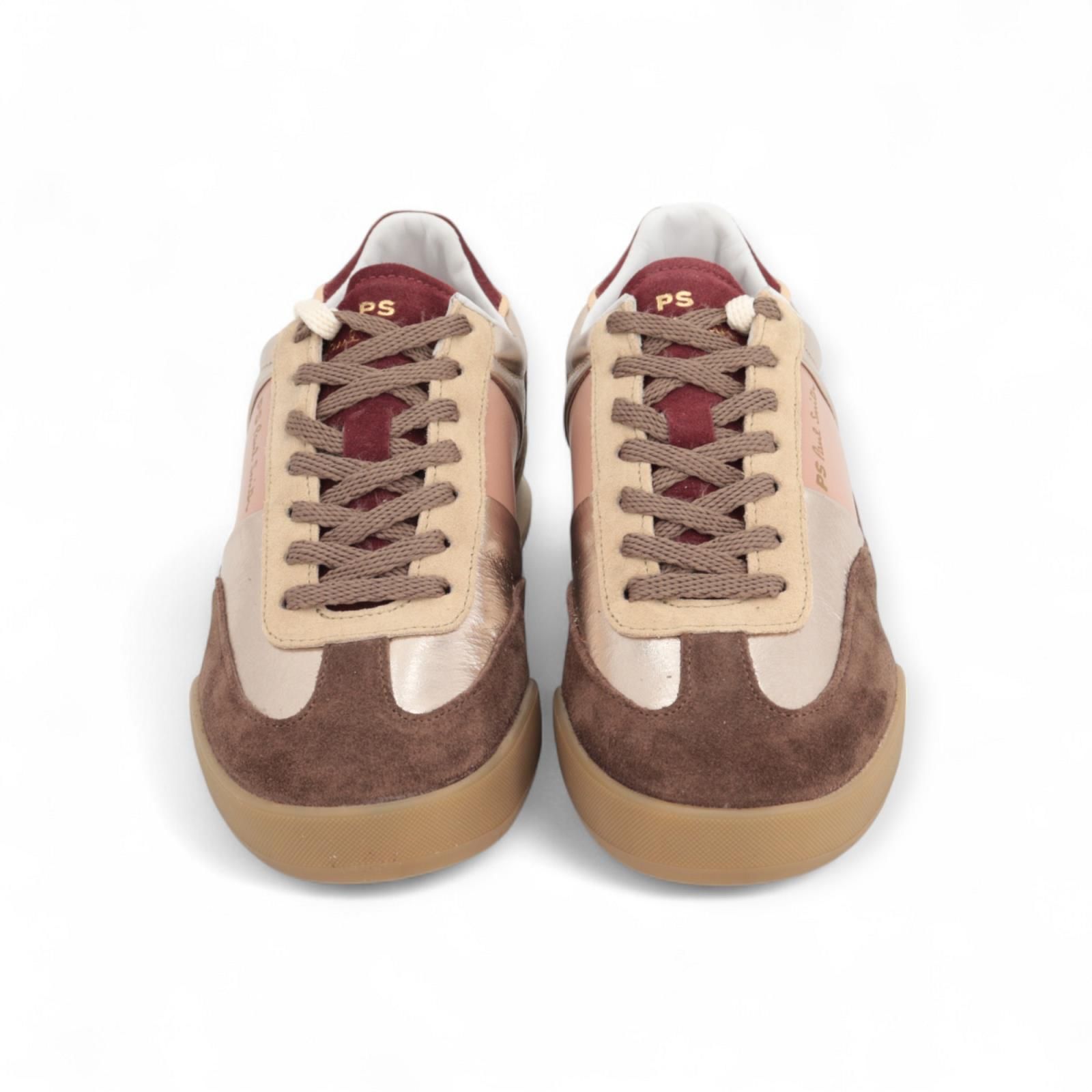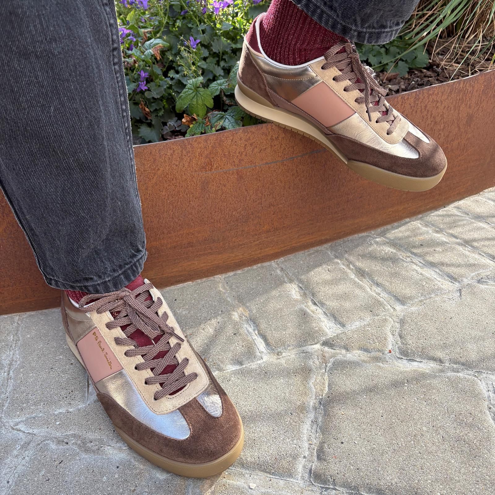 Dover sneaker voor dames van Paul Smith. Metallic bronzen sneaker met roze kleurbloktinten en bruine inzetstukken. Is mooi afgewerkt met bordeaux flap en hielflap met PS logo op verwerkt. Op de zool zie je het logo en de naam. Door vintage en moderne elementen samen te voegen zijn deze sneakers echt een eyecatcher. De binnenzool is uitneembaar.