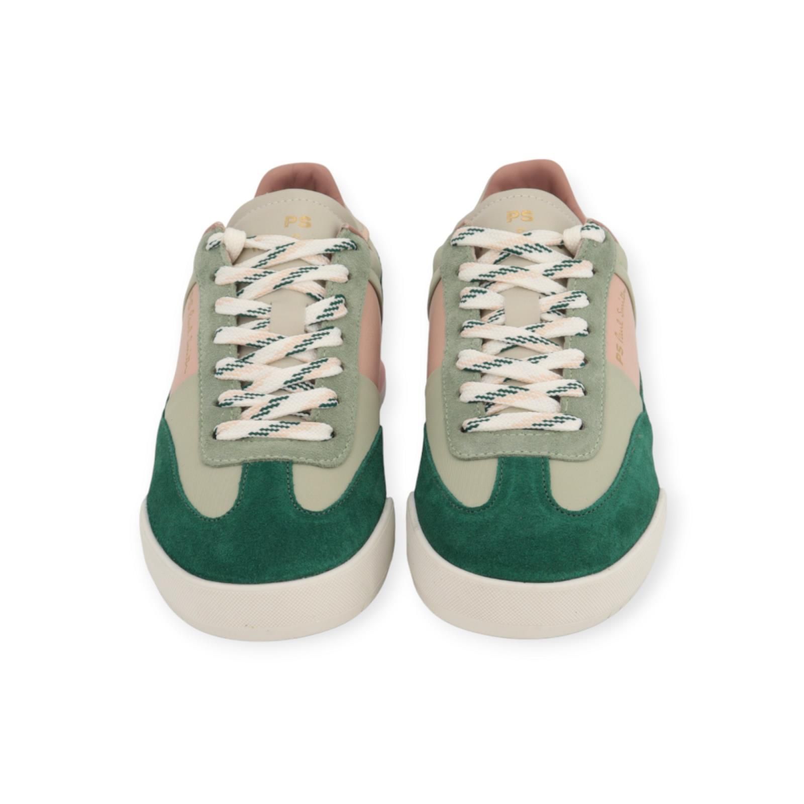 Sneaker Dover van PS Paul Smith voor dames. Deze sneakers zijn in mooie tinten groen suède met nylon. De hielflap is in leer en aan de zijkanten roze leer met PS Paul Smith logo. De gespikkelde veters zorgen voor een leuke Dover stijl. Heeft een uitneembare binnenzool en een buitenzool met logo en een roze / wit 3D inzetstuk.