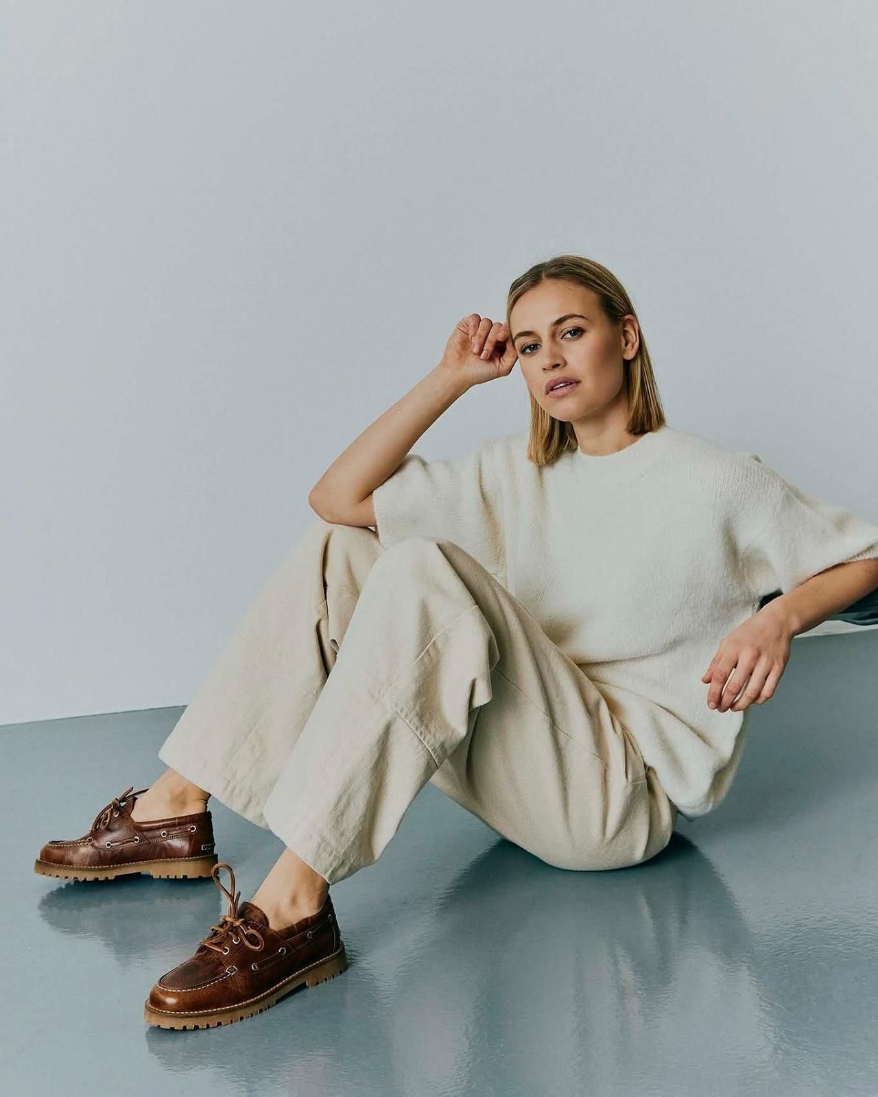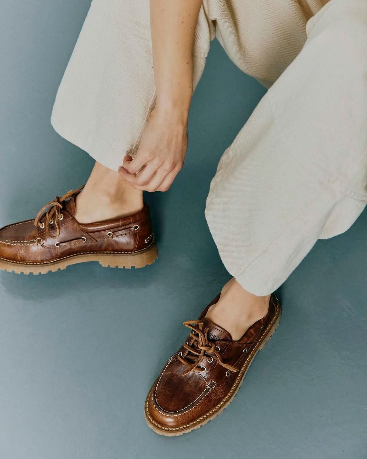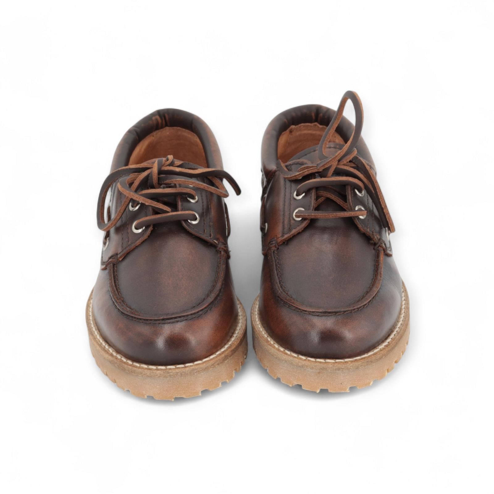Veterschoen Alvina van Pavement voor dames. Deze hippe veterschoen is terug helemaal in! Is in bruin gewaxt leer met stoere veters die doorlopen langs de zijkant zoals bij de typische bootschoenen. Deze schoen combineert een klassieke uitstraling met een stoere beige antislipzool.